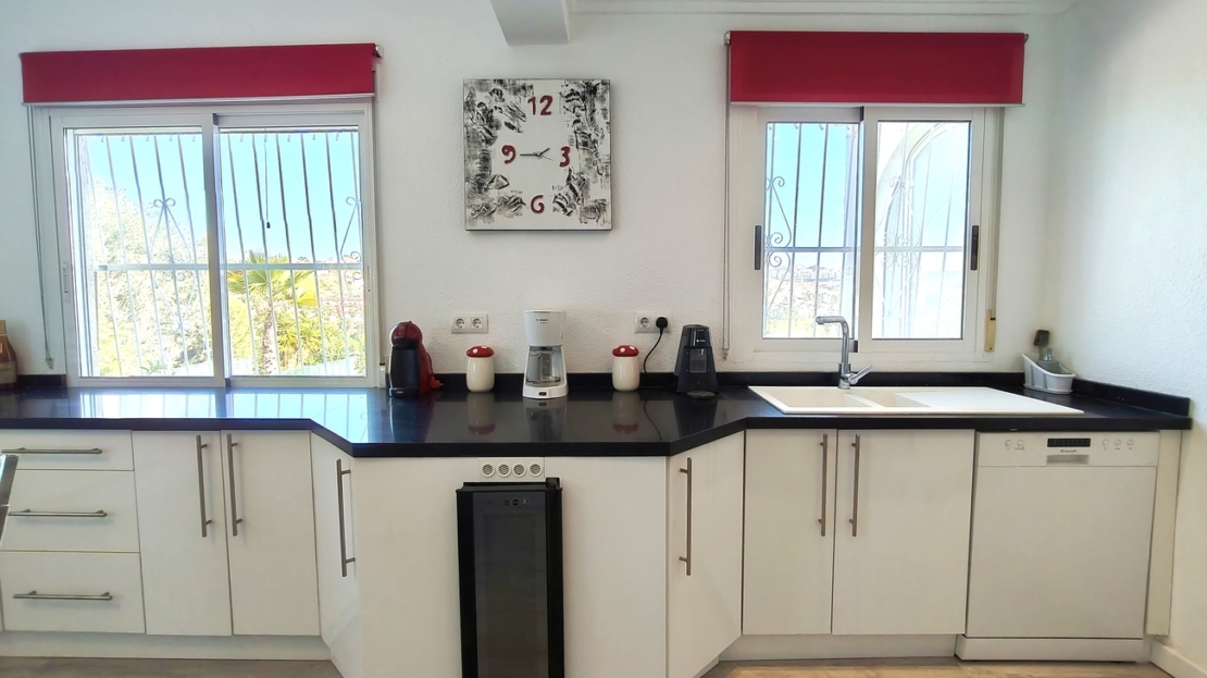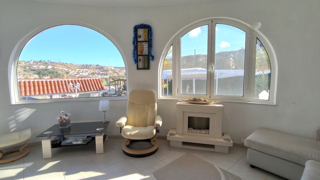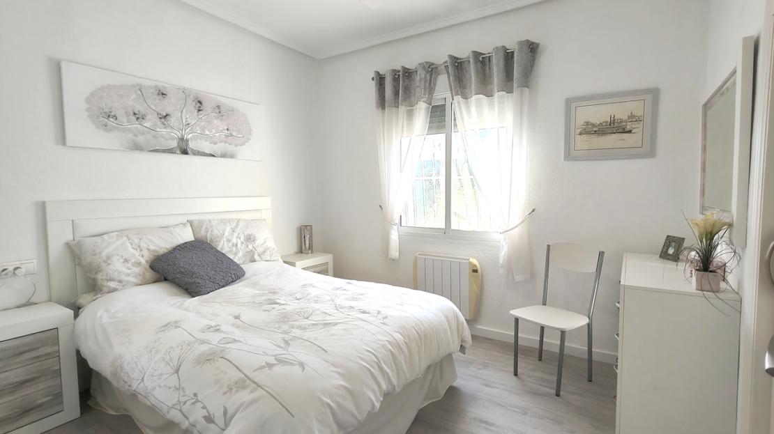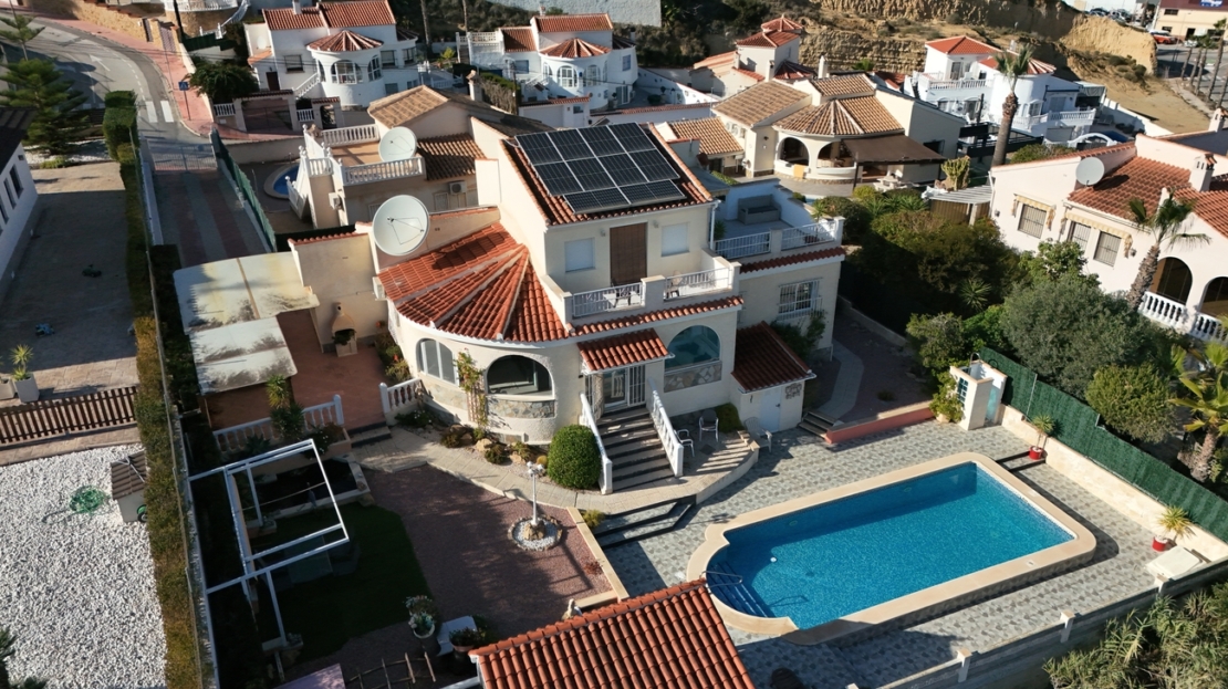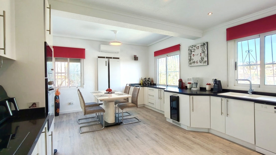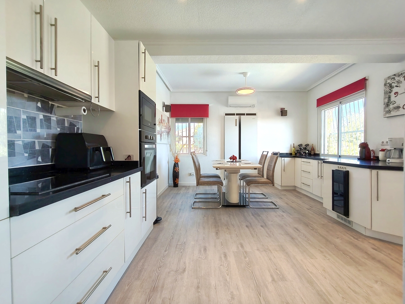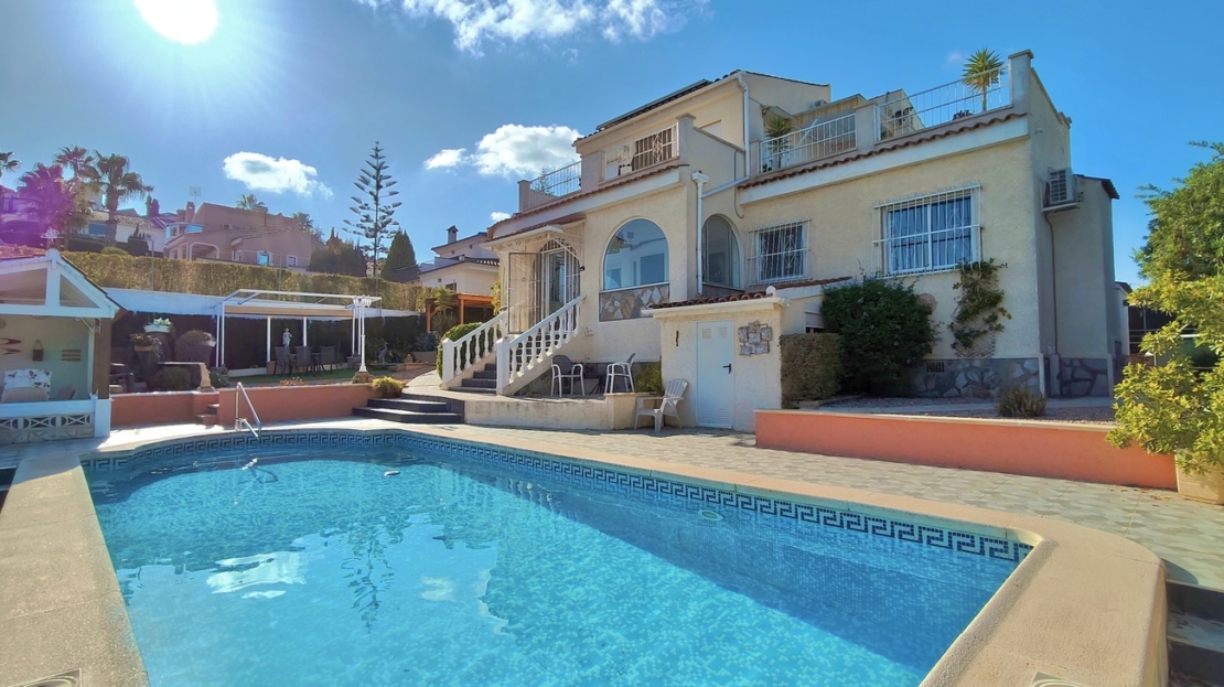 This beautifully reformed south facing detached villa enjoys a prime frontline position overlooking La Marquesa Golf Course in Ciudad Quesada. Ideally located on the lower part of the golf resort, the property is within walking distance of shops, restaurants and everyday amenities, offering an excellent balance of privacy, views and convenience.Set on a generous plot of approximately 710 m², the villa benefits from open golf views and outstanding outdoor living areas. The exterior includes a private swimming pool, ornamental fish pond, several seating and dining terraces, a carport, storage rooms and a dedicated utility area, all designed to make the most of the Mediterranean climate.The main living level offers a bright and welcoming living room, an enclosed glass terrace with panoramic golf views, a modern separate kitchen with dining area, three spacious bedrooms and two bathrooms. The master bedroom features a walk in dressing room and an en suite bathroom, providing comfort and privacy.The upper level adds significant versatility, with a large room currently used as a snooker room, a WC, and access to a private terrace and solarium. This space is ideal for entertaining and could easily be converted into a fourth bedroom, guest suite or additional living area.Finished to a high standard and equipped with solar panels, the property is offered fully furnished subject to offer.An excellent opportunity to acquire a quality villa with private pool and golf course views in one of the most sought after areas of Ciudad Quesada, ideal as a permanent residence or a holiday home.