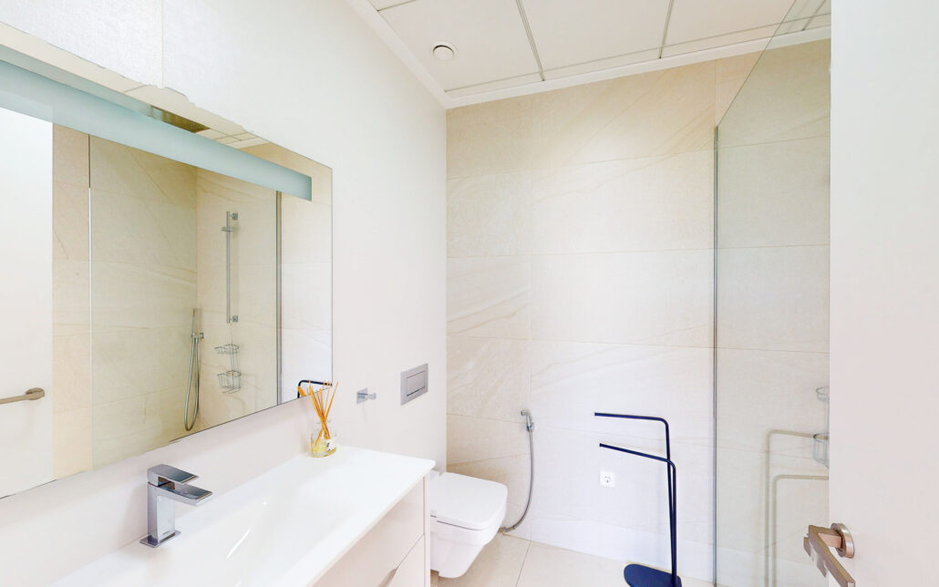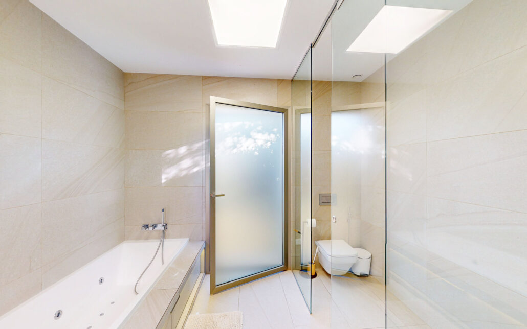 Hovedetasjen har en åpen stue- og spisestue med et fullt utstyrt designkjøkken, eksklusive materialvalg og store skyvevinduer som skaper en sømløs overgang mellom inne og ute. En stilfull glassbro leder til hovedsoverommet med privat terrasse, innebygde garderober og et luksuriøst bad med jacuzzi og romslig dusj.