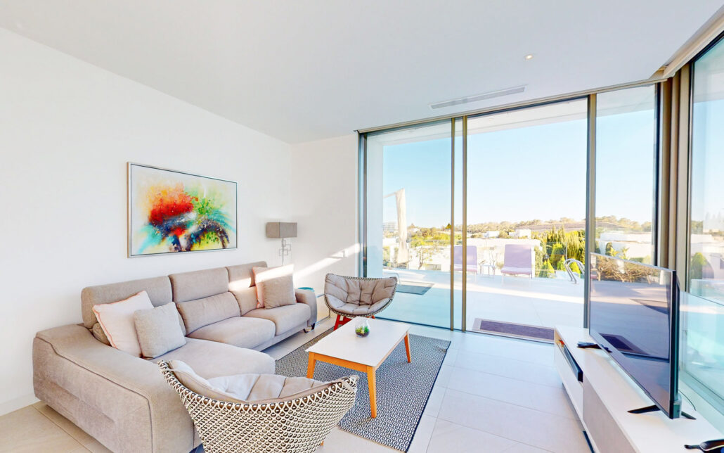 Uteområdene er ideelle for sosiale sammenkomster, med flere terrasser, grillplass, utedusj og et panoramisk solarium på taket med utsikt over golfbanen og havet.