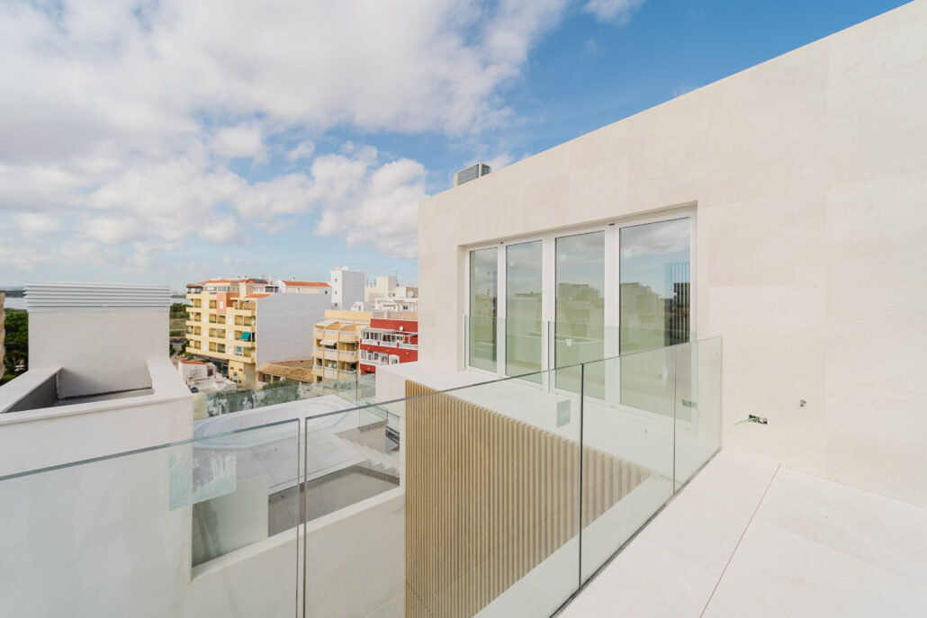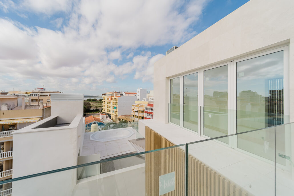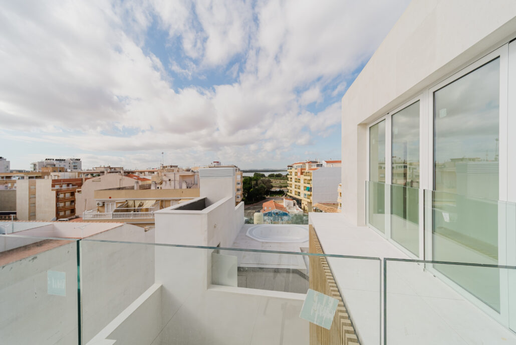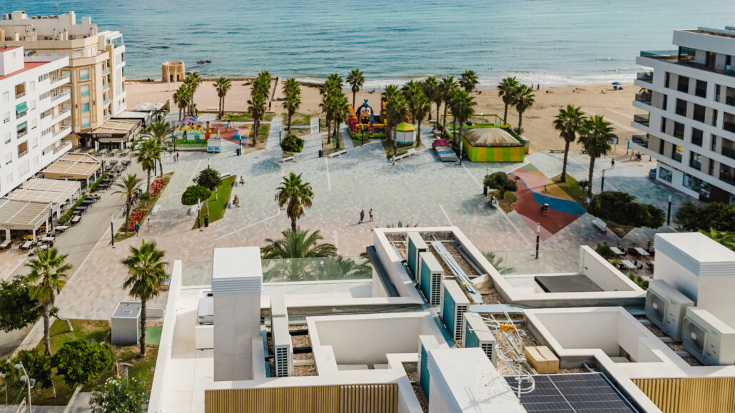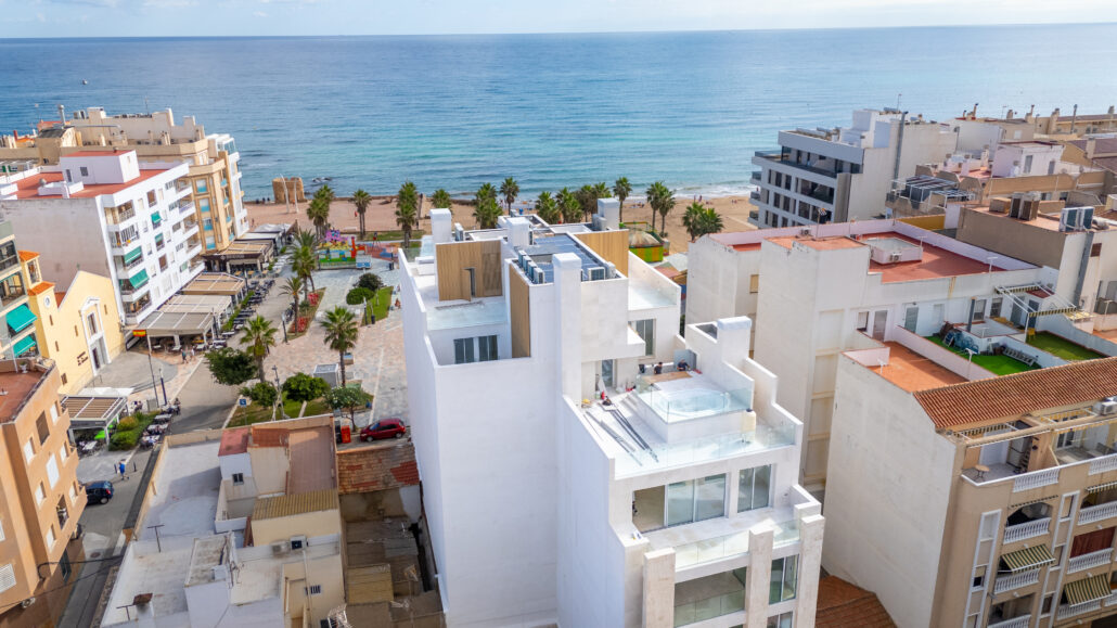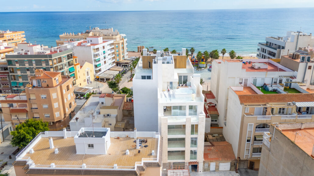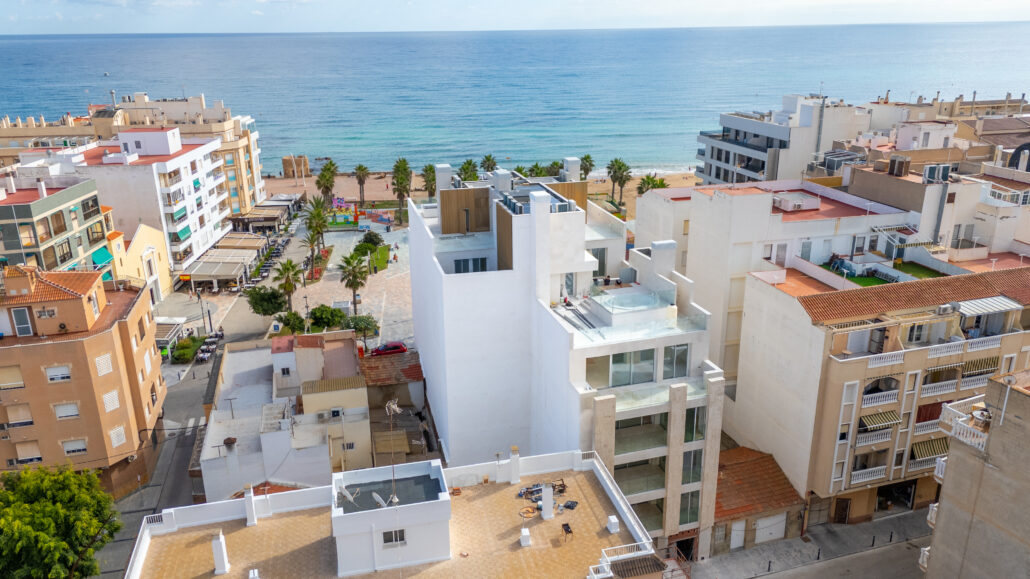 La Mata Plaza consists of 14 apartments, all with spacious terraces, two commercial units on the ground floor, and 11 underground parking spaces. The project also includes a spacious solarium with westward orientation. It features a jacuzzi and spectacular views of the La Mata Salt Lagoon. 10 of the apartments have direct views of the beautiful Mediterranean Sea, the beach, and the main square of the village. These apartments, Types A and B, have three bedrooms and two bathrooms. The Type A and B penthouses have a private 80 m² solarium with panoramic views of the sea and lagoon. The 4 Type C apartments are west-facing with views towards the La Mata Lagoon, with two bedrooms and one or two bathrooms. 11 parking spaces are available in the building’s basement.