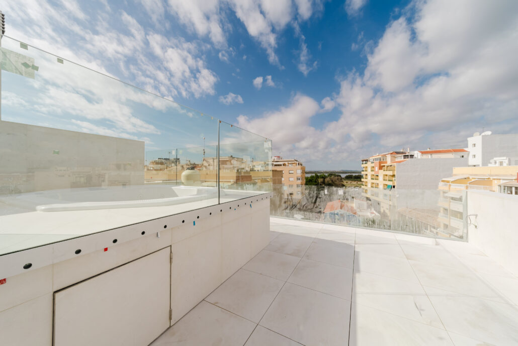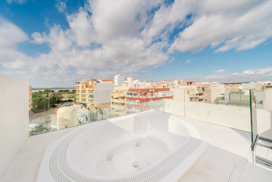 Additionally, you’ll have access to a private solarium with a jacuzzi and summer kitchen. From this privileged space, you can enjoy panoramic views of the sea and the La Mata Salt Lagoon in Torrevieja.