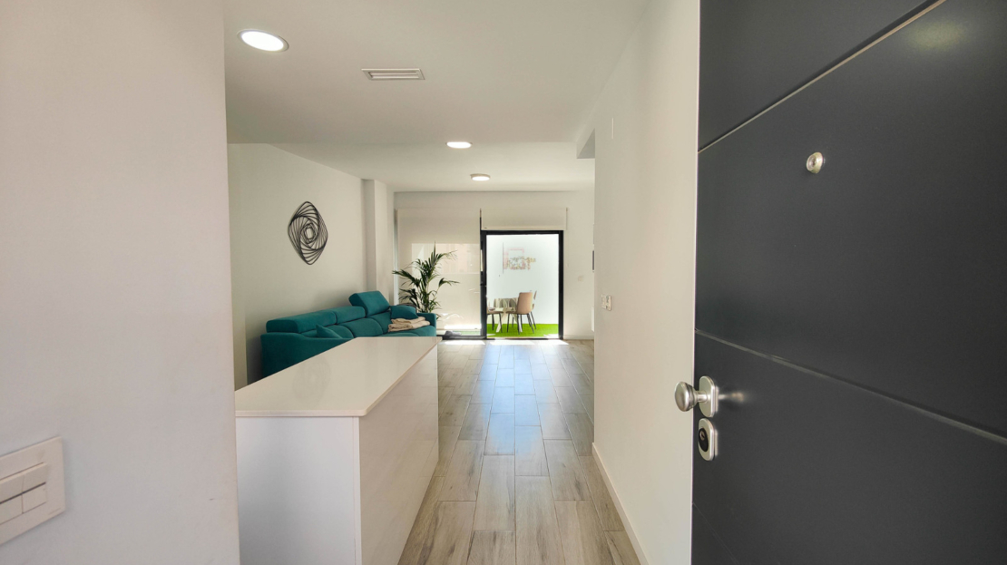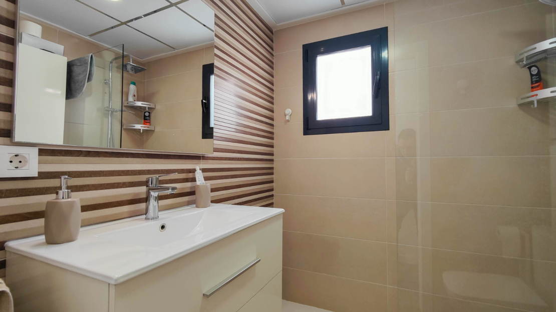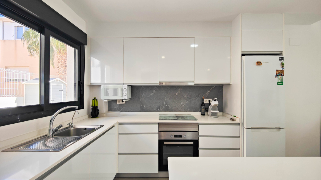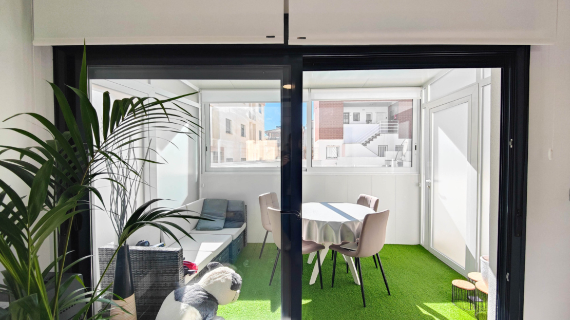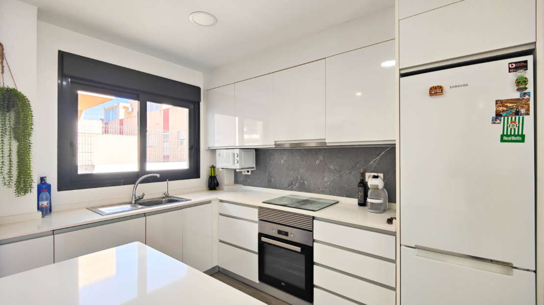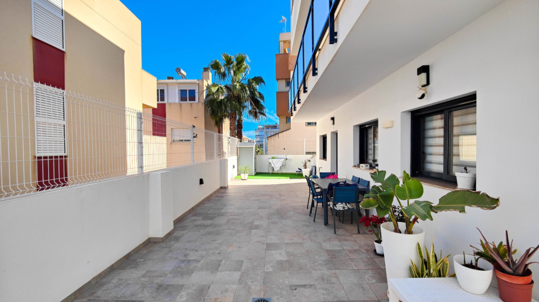 Discover this modern ground-floor apartment built in 2019, bright and designed for Mediterranean living. With 3 spacious bedrooms and 2 bathrooms, all bedrooms feature built-in wardrobes, providing excellent storage space.The high-quality kitchen includes a Silestone countertop and central island, perfect for cooking and enjoying time with family. The porcelain wood-effect flooring adds elegance and warmth to every room. The apartment also benefits from ducted air conditioning for year-round comfort. It’ sold partially furnished.One of its highlights is the south-facing glazed terrace of approximately 8 m², with artificial grass and views of the communal swimming pool. From this terrace, you can directly access the private and closed garage located just below the property, adding convenience and security.Additionally, there is a spectacular terrace of about 70 m² surrounding the apartment, ideal for relaxing, sunbathing, or creating outdoor leisure areas. The property is only 900 meters from the beach, in a privileged location.This apartment is a unique opportunity for those seeking quality, space, and proximity to the sea.