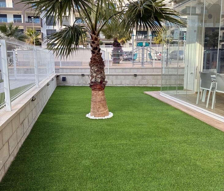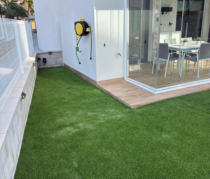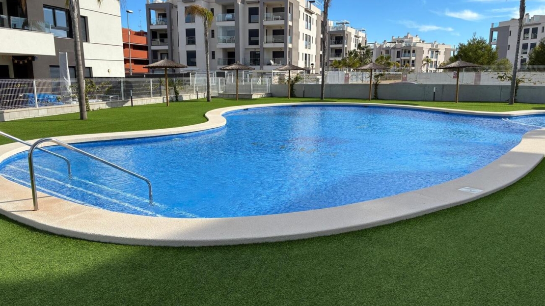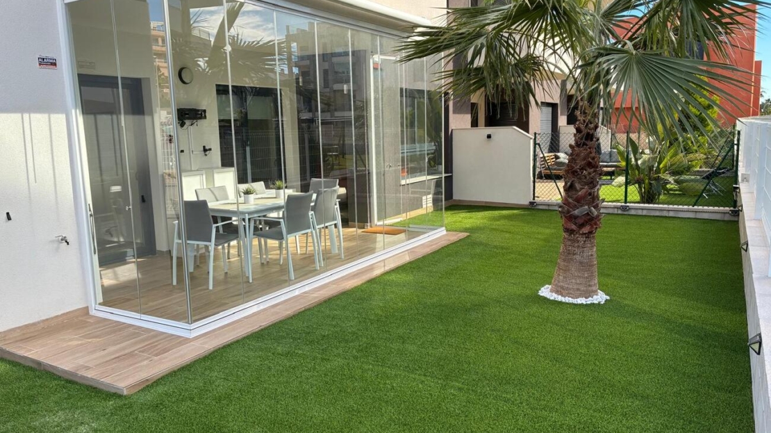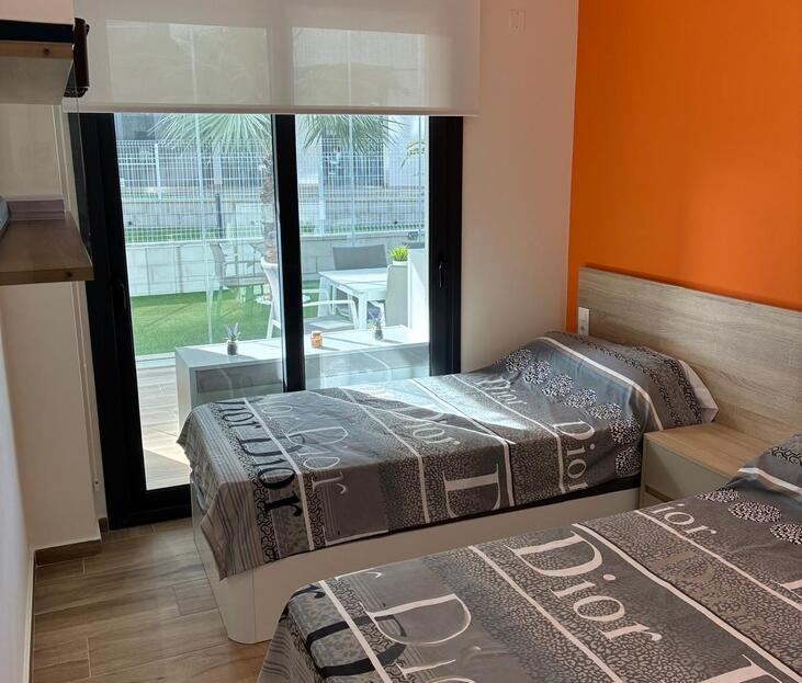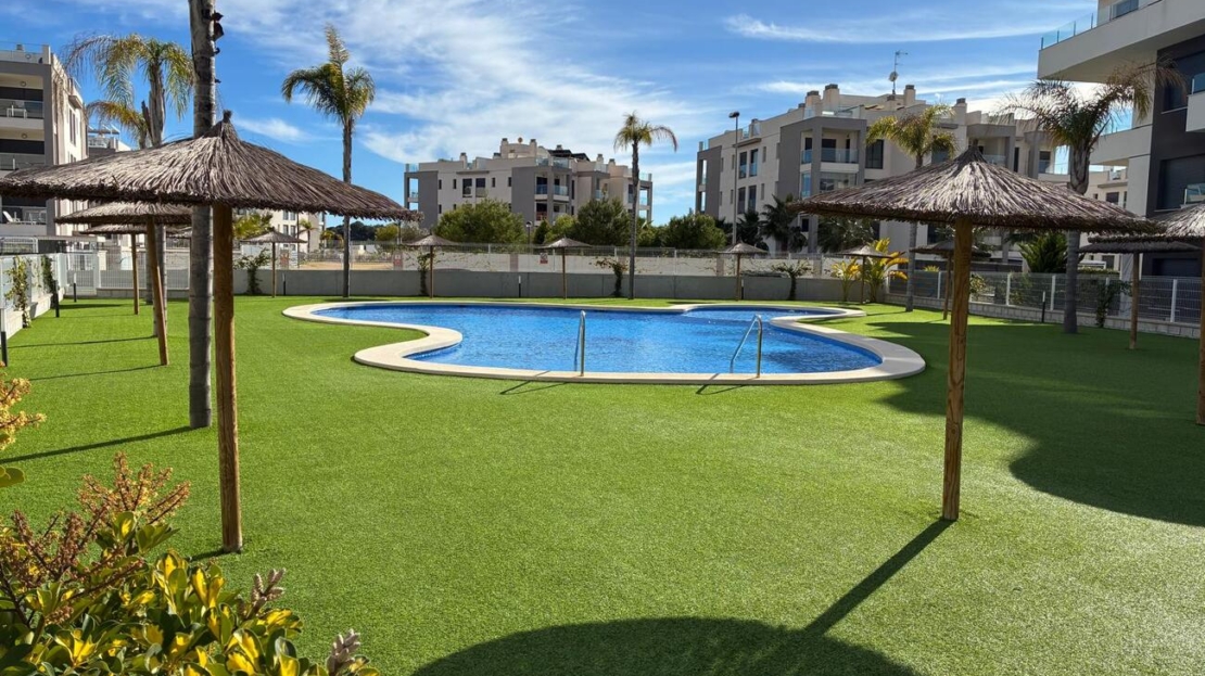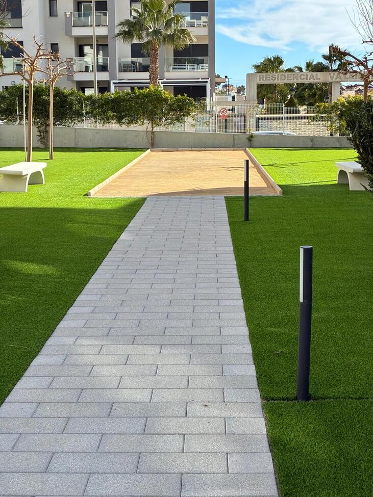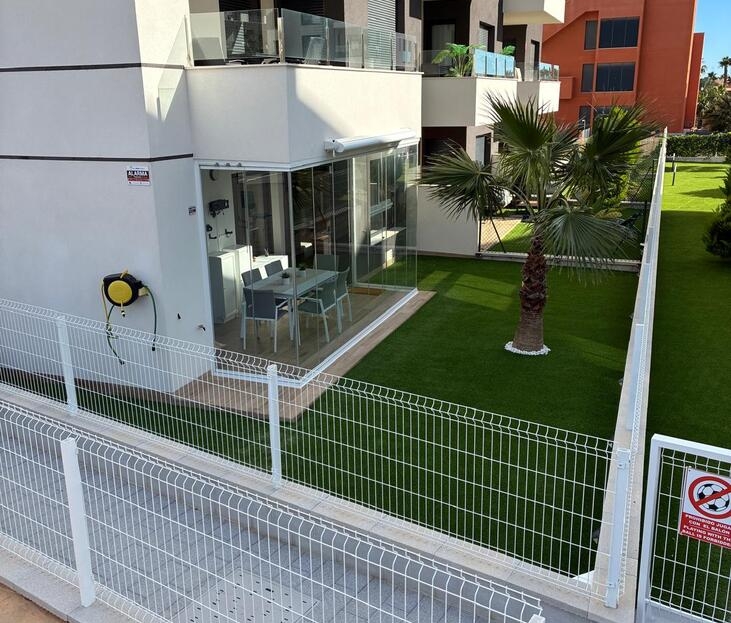 Exclusive Ground-Floor Apartment in Valentino Golf III – VillamartínThis elegant, almost-new ground-floor apartment, completed in 2024, is located in the prestigious Valentino Golf III resort in Villamartín. The property features a south-west facing private garden with a stylish 12 m² terrace, where comfort and privacy take centre stage and where you can enjoy the Mediterranean outdoor lifestyle in complete tranquillity all year round.The interior offers two spacious bedrooms and two refined bathrooms, one of which is en-suite. The bright living area flows seamlessly into a high-quality, modern fully fitted kitchen with dining area. The apartment is equipped with central air conditioning, electric shutters, and is sold fully and tastefully furnished. In addition, the interior has been professionally painted and enhanced with exclusive extras such as a 7 kW air-conditioning system, induction hob, 8 kg washing machine, an advanced alarm system with cameras, and glass terrace curtains, allowing the garden to be enjoyed as a comfortable living space even during the winter months.A private open parking space within the gated community is included.The secure and well-maintained resort offers exceptional facilities, including a stylish communal swimming pool and children’s pool, beautifully landscaped gardens with palm trees, chill-out areas, a pétanque court, fitness facilities, and a children’s playground.The location is excellent: within walking distance of Villamartín Plaza, close to all local amenities, just 3 km from the beaches of Orihuela Costa, and 2 km from the exclusive Zenia Boulevard shopping centre.