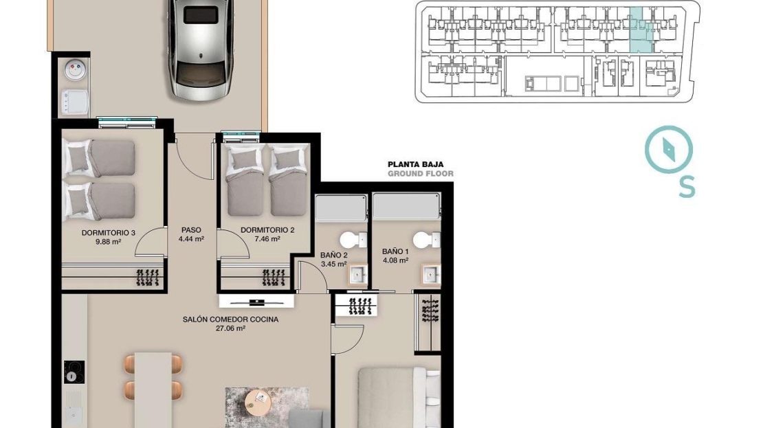 Wszystkie nieruchomości mają 3 sypialnie, 2 łazienki, kuchnię na otwartym planie z częścią wypoczynkową, wbudowane szafy i taras.