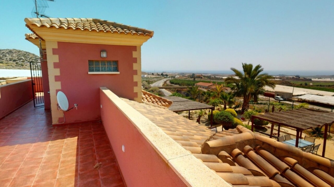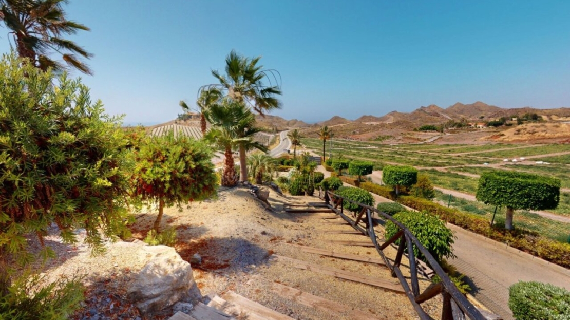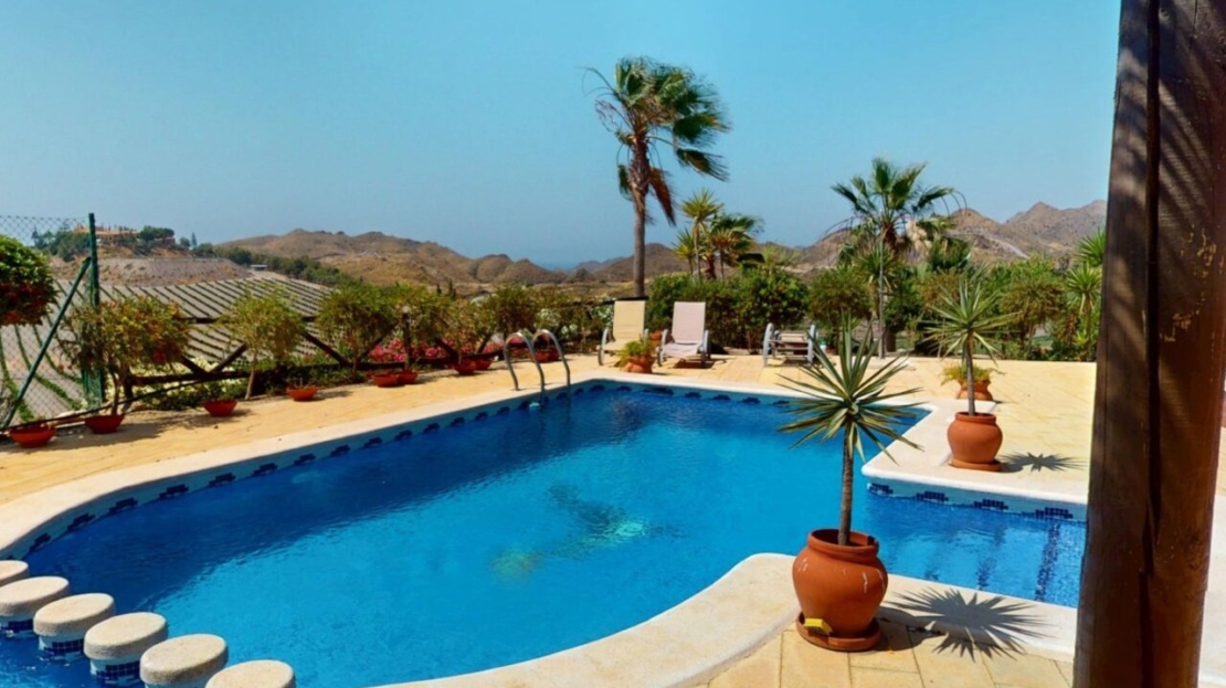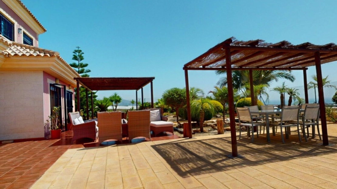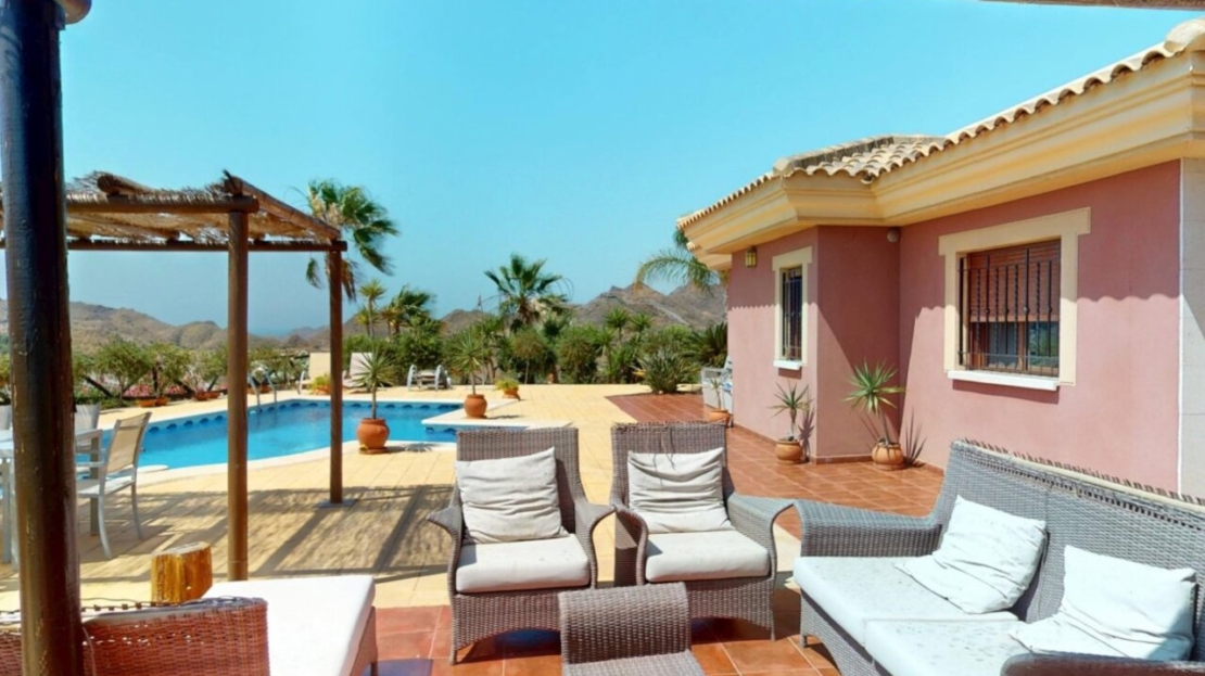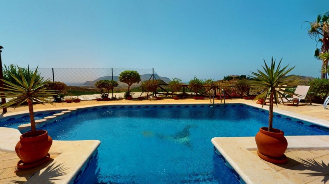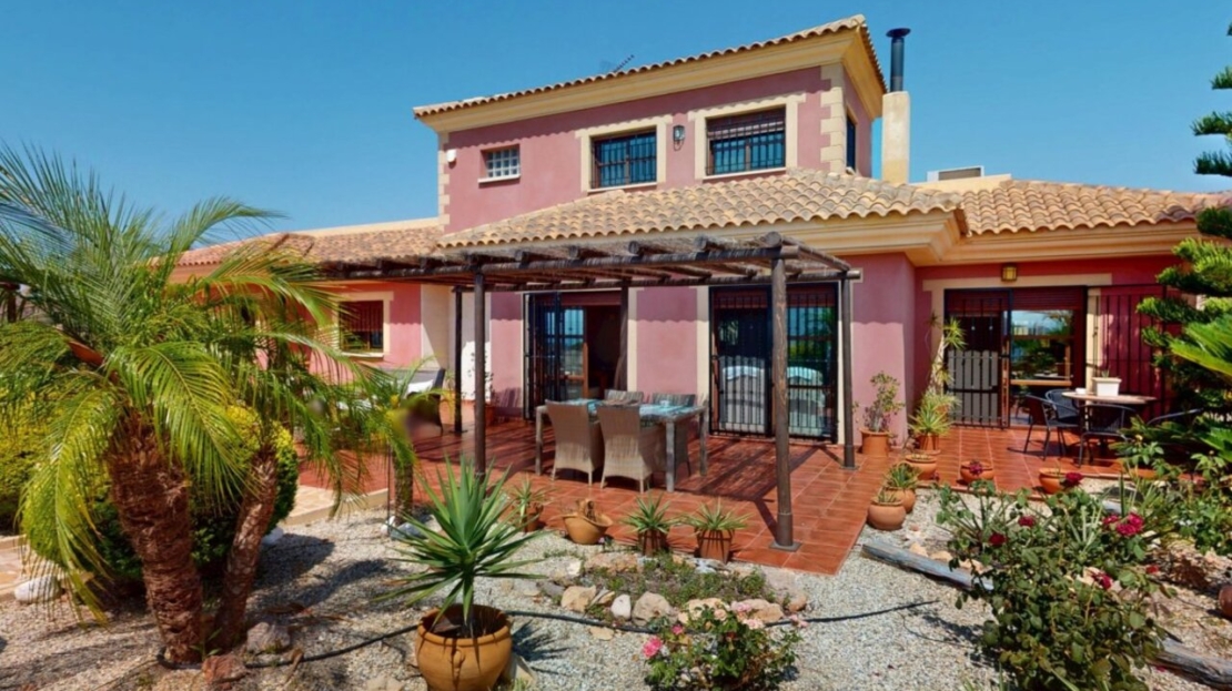 Spectacular Country House Finca with Stunning Panoramic Sea and Mountain Views – Set in 34,000m2 plot with 2,000m2 of Fenced Formal Gardens – The property has a Gate and Private Drive from the Main Road which takes you up through the Lovely Mediterranean Gardens to the property which is on a raised level with fantastic 360 degree views. 5 minutes to Village ,10 Minutes to the Beach, 15 minutes to full aminities of AguilasSpectacular villa with panoramic views of the sea and mountains, on a 34,000 m² plot – €880,000 EurosLocated in a privileged location, this impressive home offers unparalleled views of both the sea and the mountains. The property boasts a sprawling 34,000 m² plot, of which 2,000 m² are fenced around the home for greater privacy and convenience.The house is mainly distributed on the ground floor, where we find an elegant entrance hall, a spacious living-dining room with a fireplace, a bright separate kitchen, four bedrooms, and four full bathrooms. Upstairs, there is an additional bedroom with access to a large terrace with spectacular sea views.The basement has a garage with capacity for three vehicles. Outside, the private 8×4-meter pool invites you to relax and enjoy sunny days.Sold furnished (except for some personal furniture) and equipped with electricity, drinking water and irrigation water. A unique opportunity for those seeking tranquility, nature, and stunning views of Cabo Cope in an unparalleled setting.