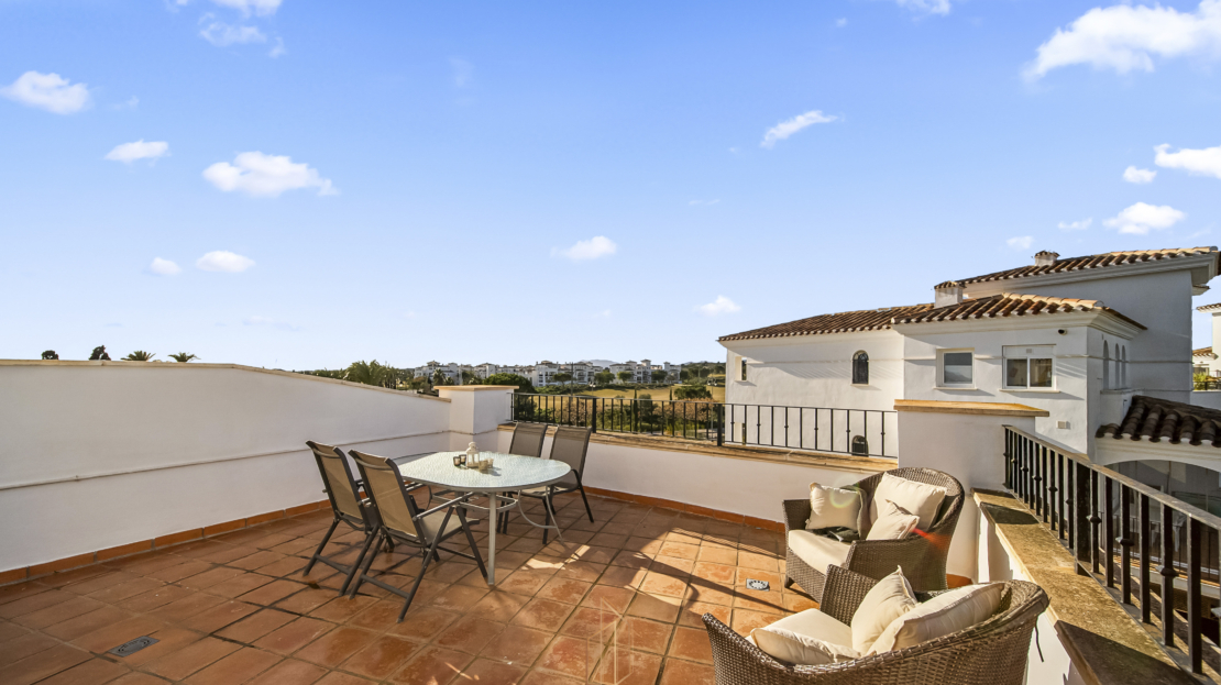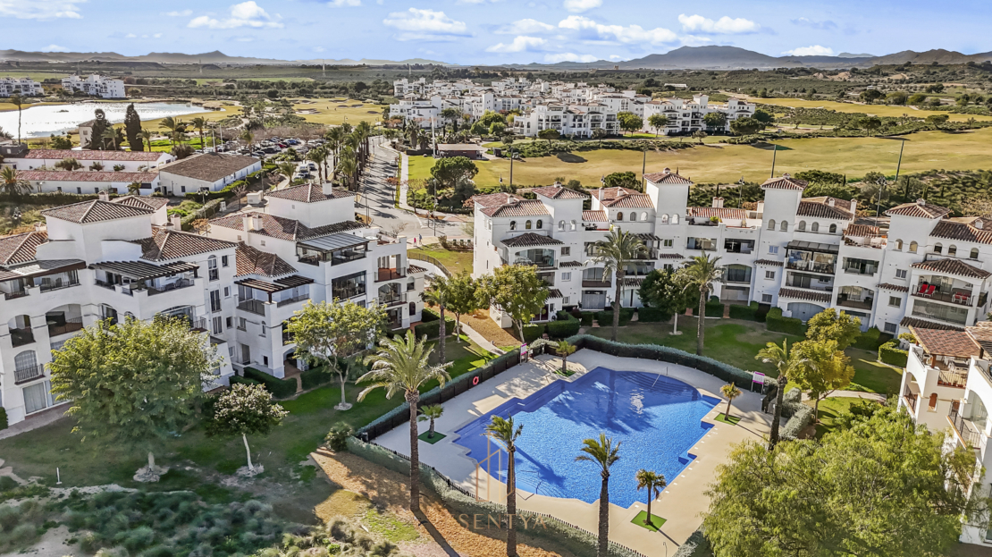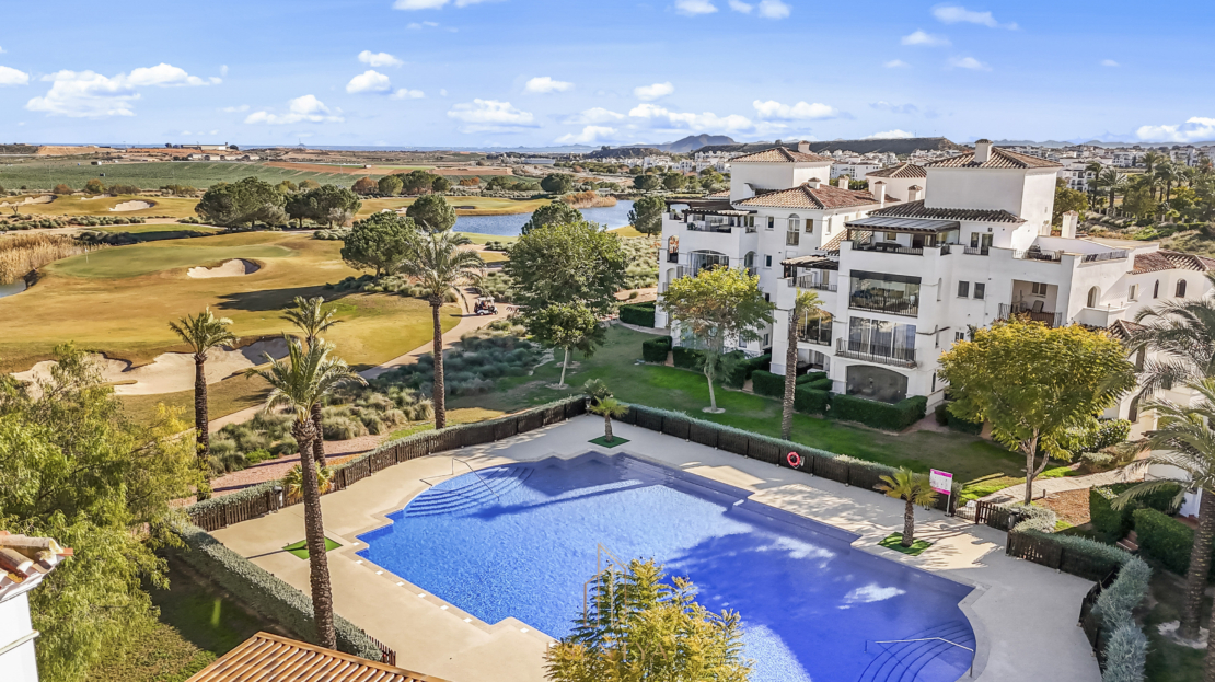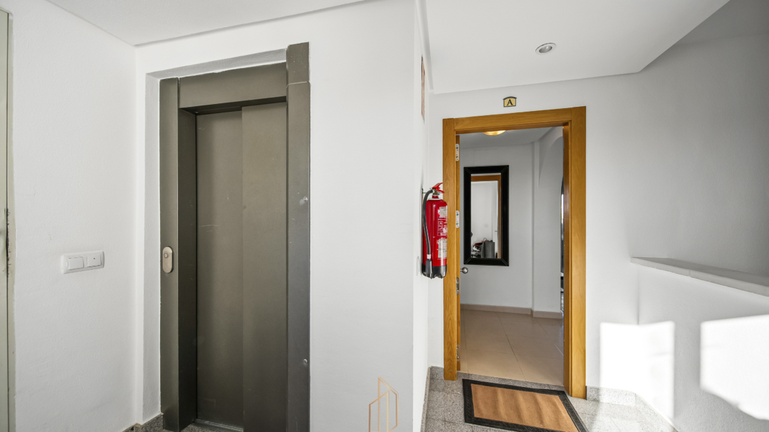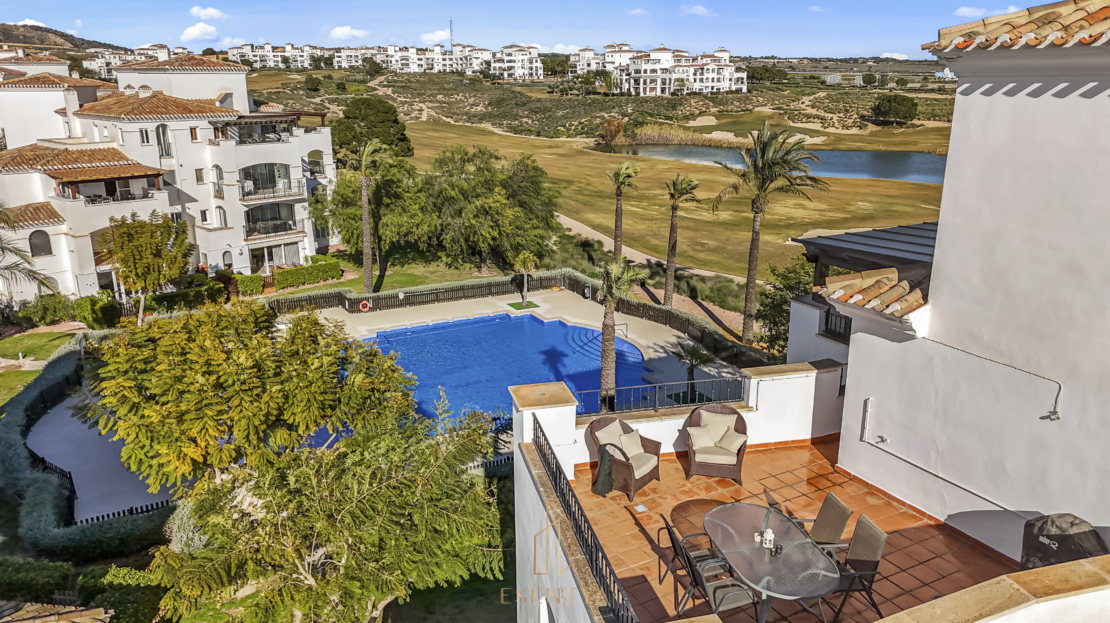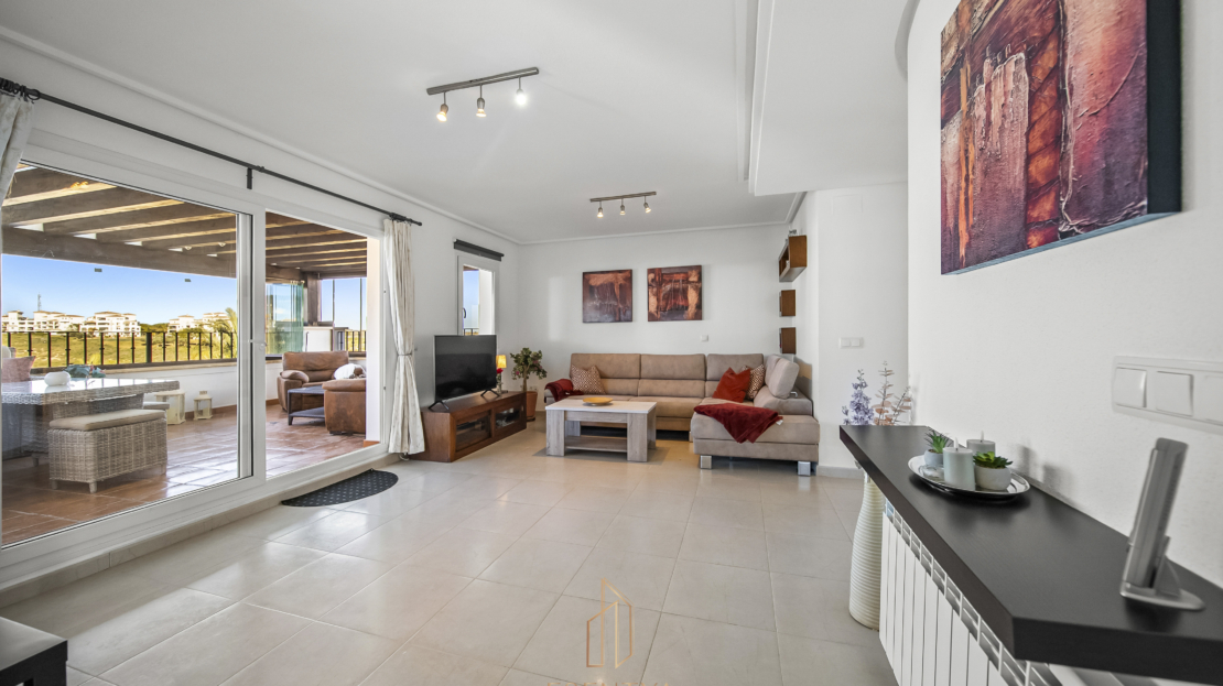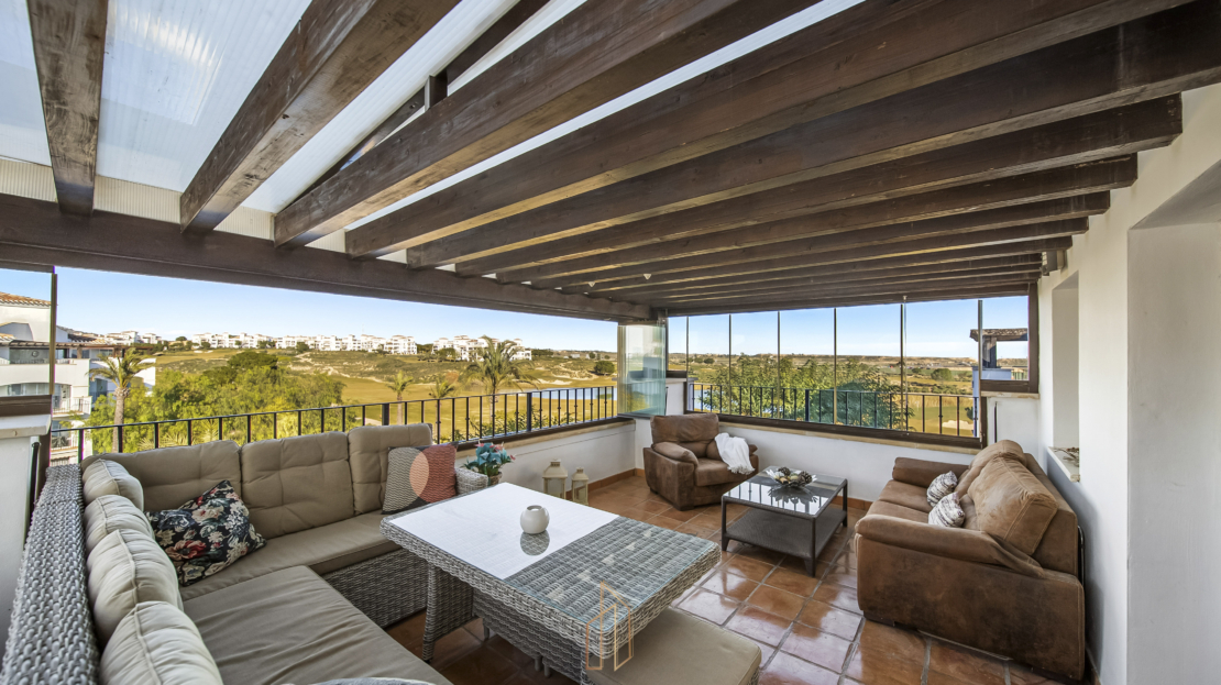 Penthouse apartment with an exceptional location, situated in immediate proximity to the heart of Hacienda Riquelme Golf Resort, with the clubhouse, pro shop, cafés, grocery store, and restaurant just steps away. The golf course driving range is also located right outside the door.The apartment comprises a living room with access to a in built terrace currently used as an additional living area, a fully equipped kitchen with appliances and access to the terrace, two bedrooms, both with direct access to a south-facing terrace and fitted wardrobes, and two bathrooms, one with a shower and the other with a bathtub.The enclosed terrace makes the apartment feel particularly spacious and can easily be fully opened by sliding back the glass panels. Here you can enjoy views of the large communal pool and the golf course. What makes this property especially unique is that, in addition to the enclosed terrace, it also offers a large open terrace where you can enjoy the sun throughout the day.The apartment also has exclusive use of the spacious hallway on this floor. The building is equipped with an elevator, and the property includes a generous private parking space with a storage room.- Year built: 2007 – Living area: 83 m² – Terraces: 70 m² – Bedrooms: 2 – Bathrooms: 2 – Community fees: 620€ per quarter – IBI: 339€ a yearDistances: – Murcia City: 32 km – Cartagena City: 47 km – Beach: 21 km – Corvera Airport: 21 km – Alicante Airport: 85 km