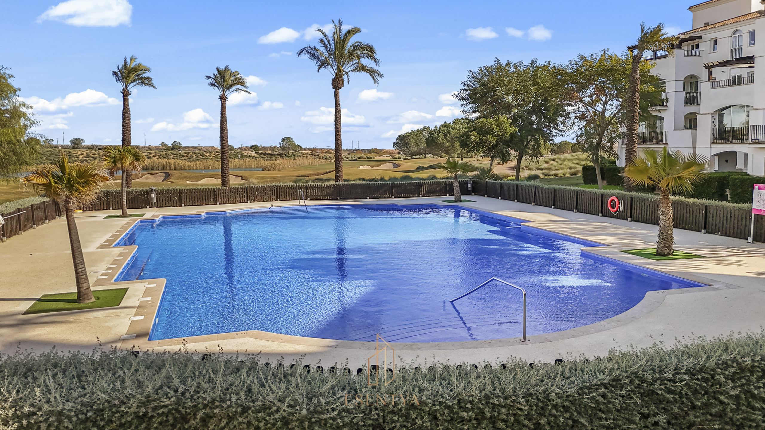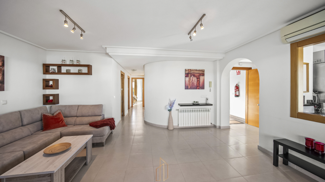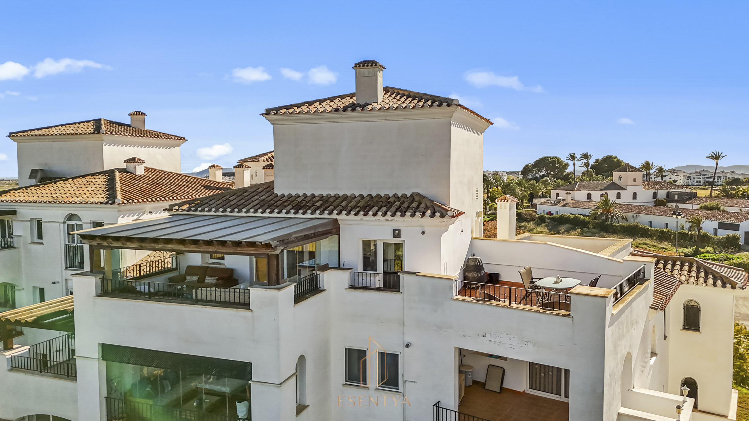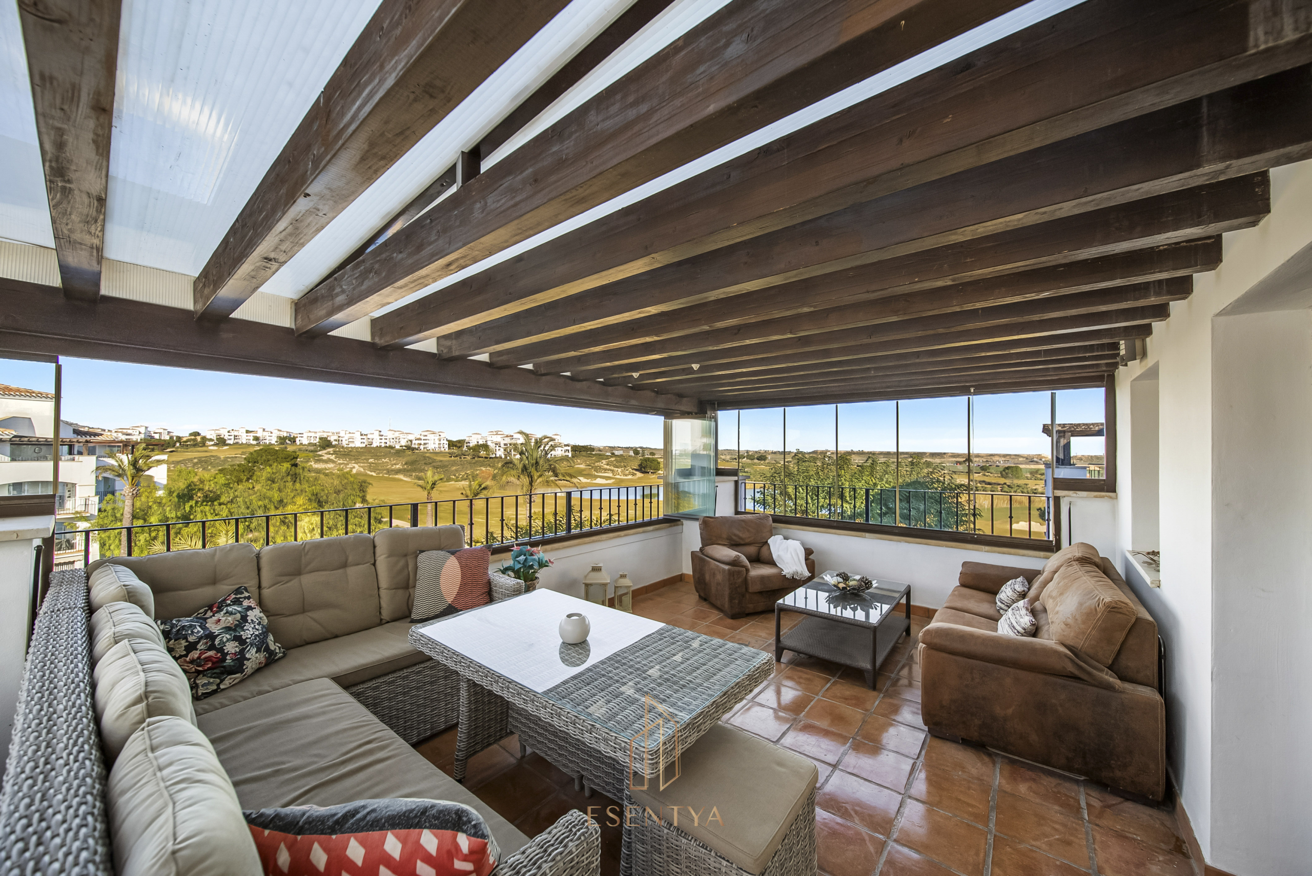 Penthouse apartment with an exceptional location, situated in immediate proximity to the heart of Hacienda Riquelme Golf Resort, with the clubhouse, pro shop, cafés, grocery store, and restaurant just steps away. The golf course driving range is also located right outside the door.The apartment comprises a living room with access to a in built terrace currently used as an additional living area, a fully equipped kitchen with appliances and access to the terrace, two bedrooms, both with direct access to a south-facing terrace and fitted wardrobes, and two bathrooms, one with a shower and the other with a bathtub.The enclosed terrace makes the apartment feel particularly spacious and can easily be fully opened by sliding back the glass panels. Here you can enjoy views of the large communal pool and the golf course. What makes this property especially unique is that, in addition to the enclosed terrace, it also offers a large open terrace where you can enjoy the sun throughout the day.The apartment also has exclusive use of the spacious hallway on this floor. The building is equipped with an elevator, and the property includes a generous private parking space with a storage room.- Year built: 2007 – Living area: 83 m² – Terraces: 70 m² – Bedrooms: 2 – Bathrooms: 2 – Community fees: 620€ per quarter – IBI: 339€ a yearDistances: – Murcia City: 32 km – Cartagena City: 47 km – Beach: 21 km – Corvera Airport: 21 km – Alicante Airport: 85 km