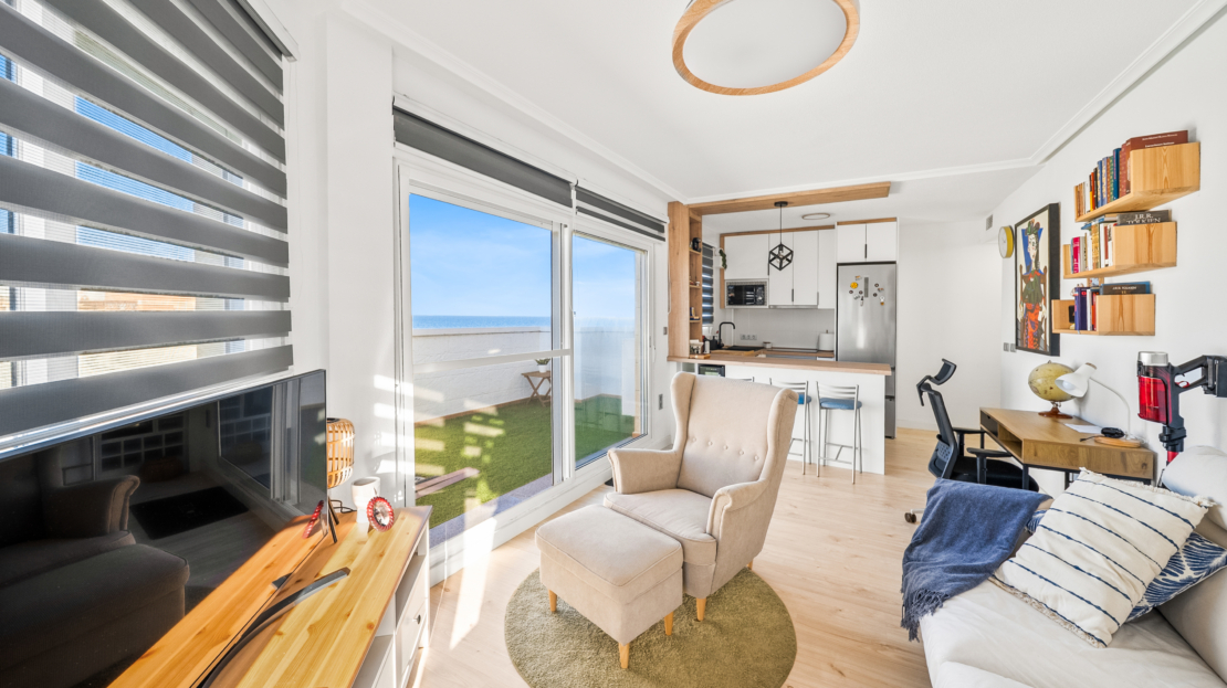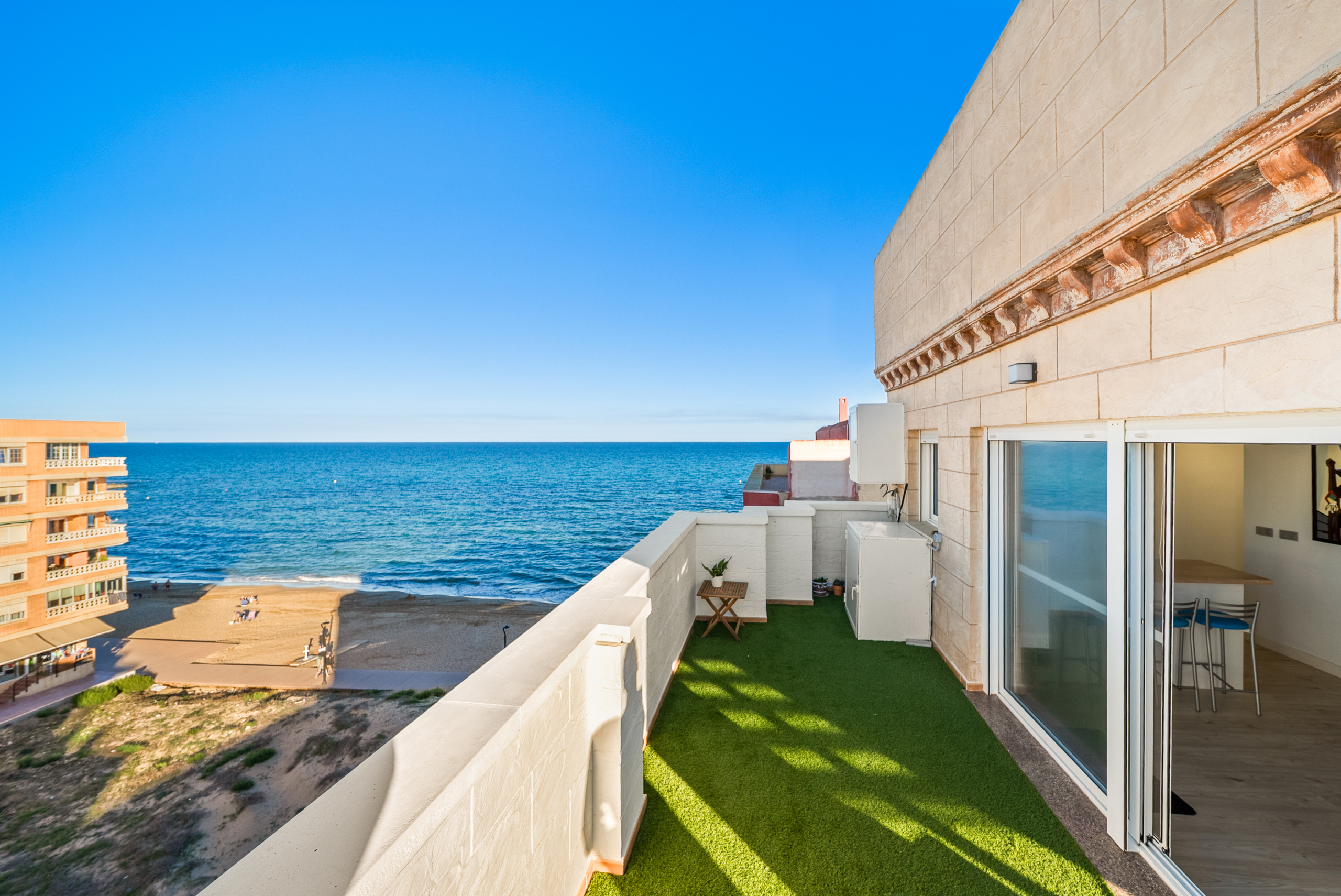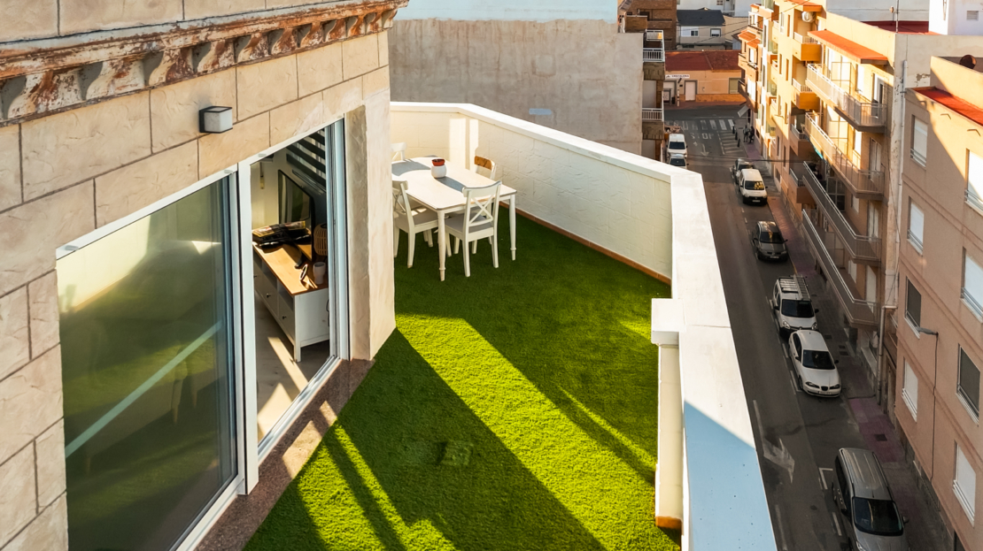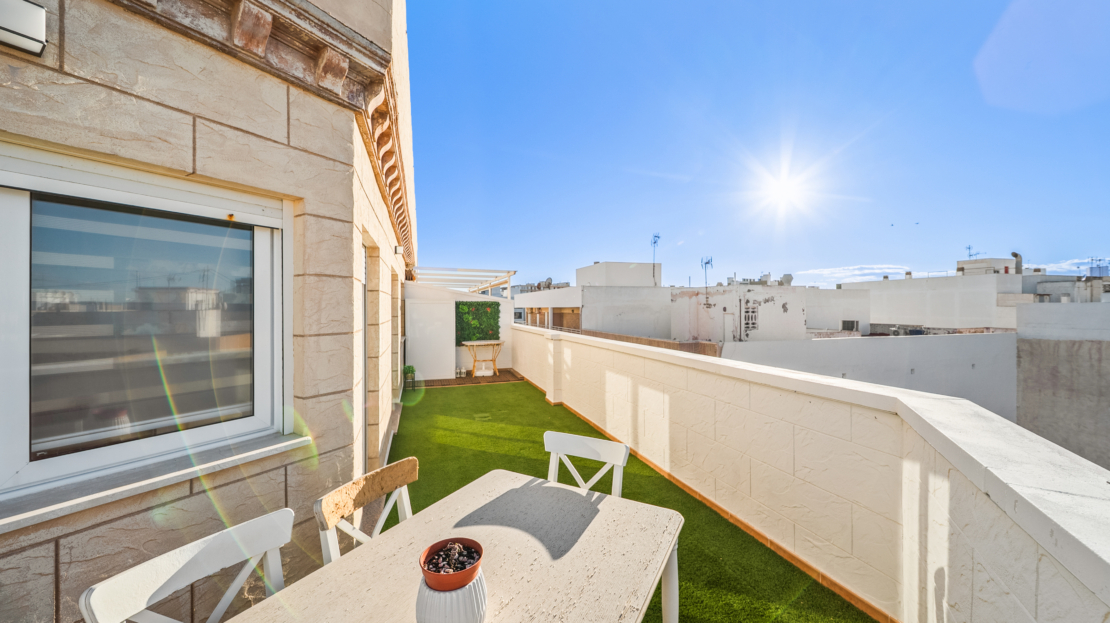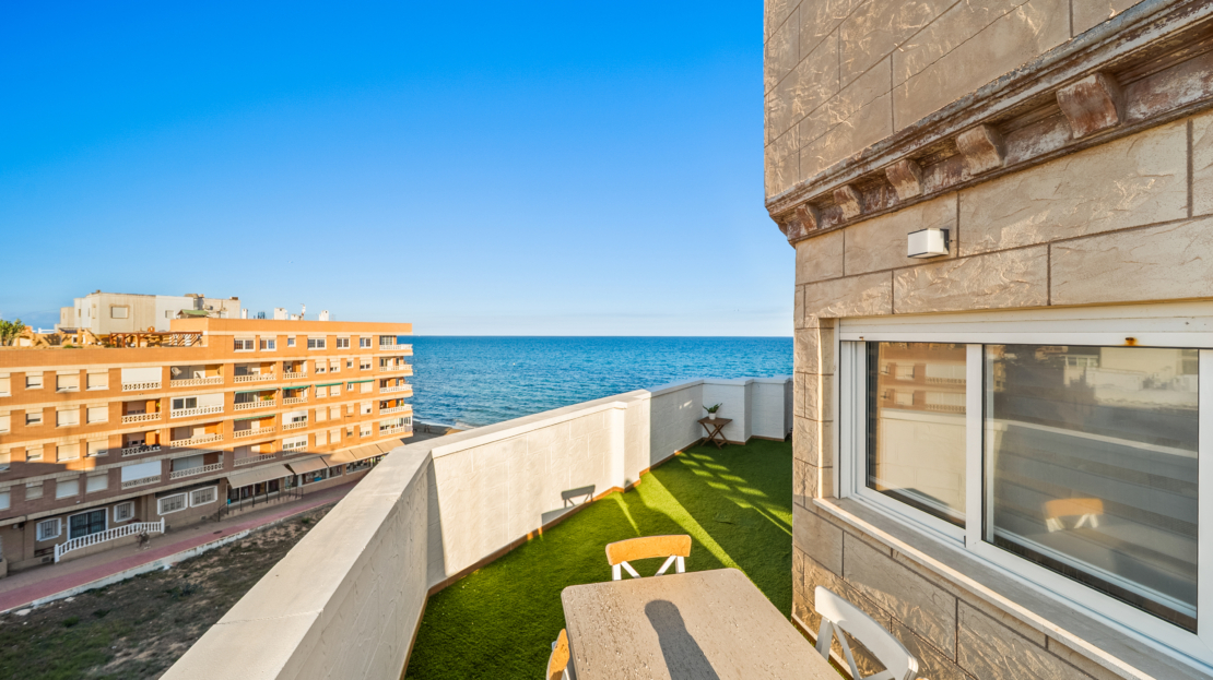 Renovated corner penthouse with sea views in La Mata.Fifth-floor penthouse, recently renovated and located just 50 meters from La Mata beach. The property offers 90 m² built and a spacious 45 m² terrace with sea views.It features 2 bedrooms, 2 bathrooms, an open-plan kitchen and a bright living room with direct access to the terrace. Sold fully furnished and equipped, with air conditioning and west orientation.Key features: 2 bedrooms 2 bathrooms 90 m² built 45 m² terrace with sea views Open-plan kitchen Air conditioning West facing 5th floor Furnished Building with liftAnnual costs: IBI: €250 Community: €400Location: 50 m from La Mata beach 50 m from bars and restaurants 100 m from supermarket 500 m from La Mata Natural Park