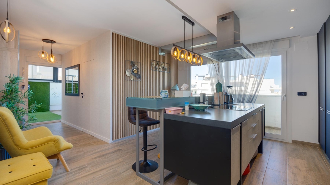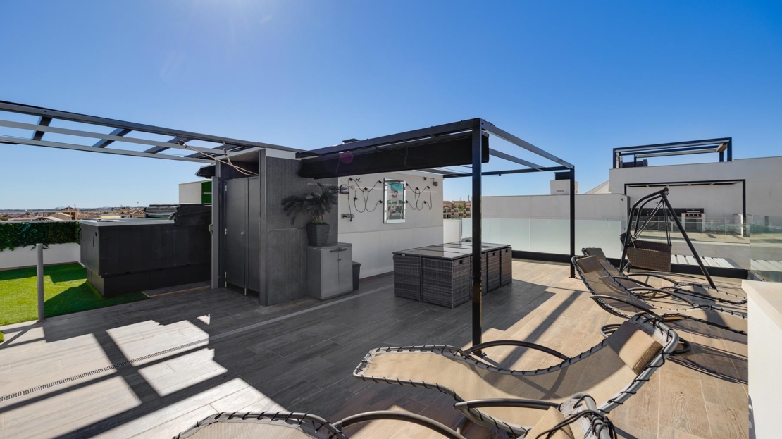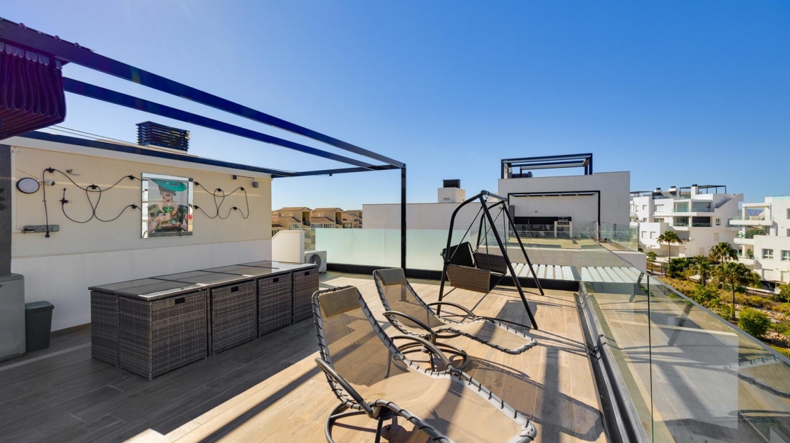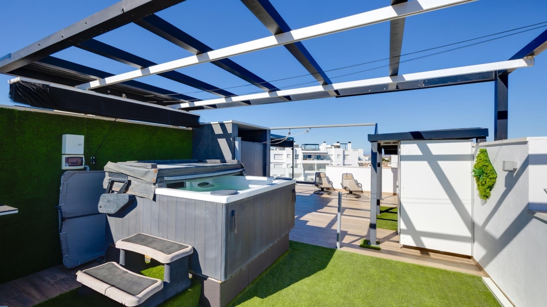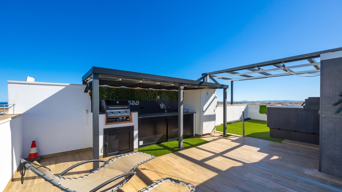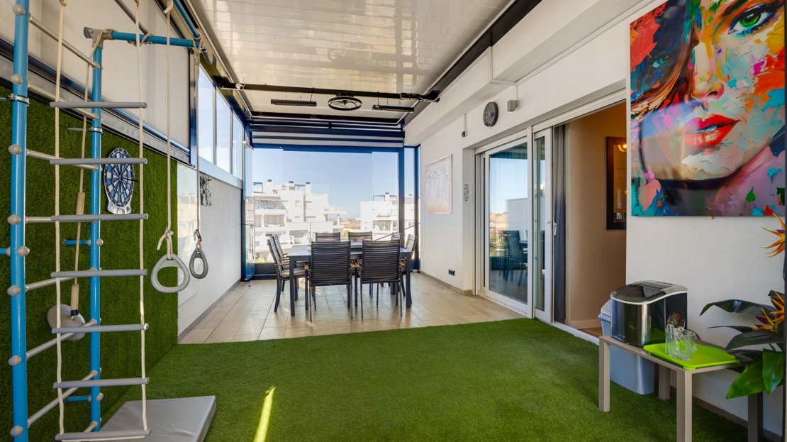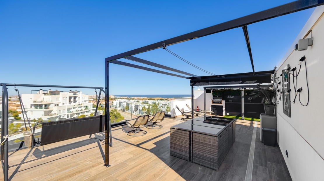 Discover this stunning , nearly new penthouse in Punta Prima (Orihuela Costa) , located in the prestigious Residencial Bali residential complex, a unique opportunity to enjoy luxury, privacy and Mediterranean lifestyle just steps from the sea and all amenities.The property features 3 bedrooms and 2 bathrooms , with a modern, functional, and bright design, where every space has been carefully considered for everyday comfort. The kitchen opens onto a pleasant terrace overlooking the communal pool and the sea , creating the perfect atmosphere for relaxation.One of its great attractions is its spectacular 95 m² private rooftop solarium , an exclusive space with open views of the sea and the surroundings , equipped with a jacuzzi and summer kitchen , ideal for enjoying the Mediterranean climate all year round.The penthouse is sold fully furnished and equipped , ready to move in, and also includes a parking space and storage room in an underground garage , providing maximum convenience.The residential complex is private and gated , and offers complete communal areas with spacious gardens, communal swimming pools, jacuzzi, gym and sauna , creating a perfect environment for both rest and well-being.Located just minutes from the beaches of Punta Prima Beach , near the renowned Zenia Boulevard shopping center and adjacent to golf courses such as Villamartín Golf , this penthouse combines location, quality, and exclusivity in one of the most sought-after areas of the Costa Blanca . Furthermore, Alicante-Elche Airport is approximately 45 minutes away, providing excellent connections.If you are looking for a penthouse with a solarium and sea views in Orihuela Costa , this property is an exceptional opportunity to enjoy a privileged life by the Mediterranean .Contact Sunnier Homes and discover your new home in Punta Prima.
