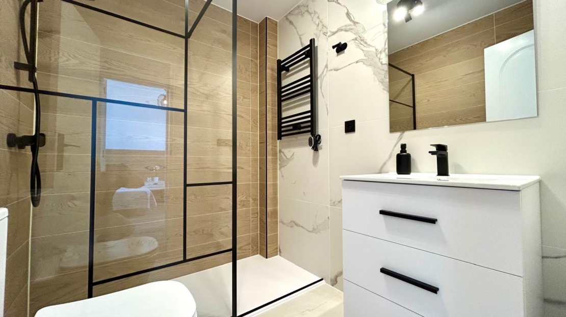 Completely renovated townhouse located in the quiet community of Los Naranjos, in Los Altos. The home has been completely renovated and is in impeccable condition, ready to move into. With a constructed area of 83 m2, it consists of three bedrooms and two full bathrooms, a living-dining room, a separate kitchen, and a covered front porch. The kitchen is equipped with all modern appliances, along with a laundry area. The home is spread over two floors and has a functional and modern design. Access to the home is via a private garden. Upstairs are two large double bedrooms, both with wardrobes, and a second full bathroom with a bathtub. The master bedroom faces south, providing natural light throughout the day. Air conditioning is installed in every room. It is being sold fully furnished, with quality furniture and everything necessary to move into (except personal belongings and decorative items). The residential complex offers a beautiful communal pool, and the home is located on a very quiet street with easy parking and a pleasant setting. The Consum supermarket and several restaurants are just 400 meters away, and the Punta Marina shopping center is a 15-minute walk away. Punta Prima Beach is 2 km away.~~The sale price does not include tax (ITP – current rate according to autonomous community)