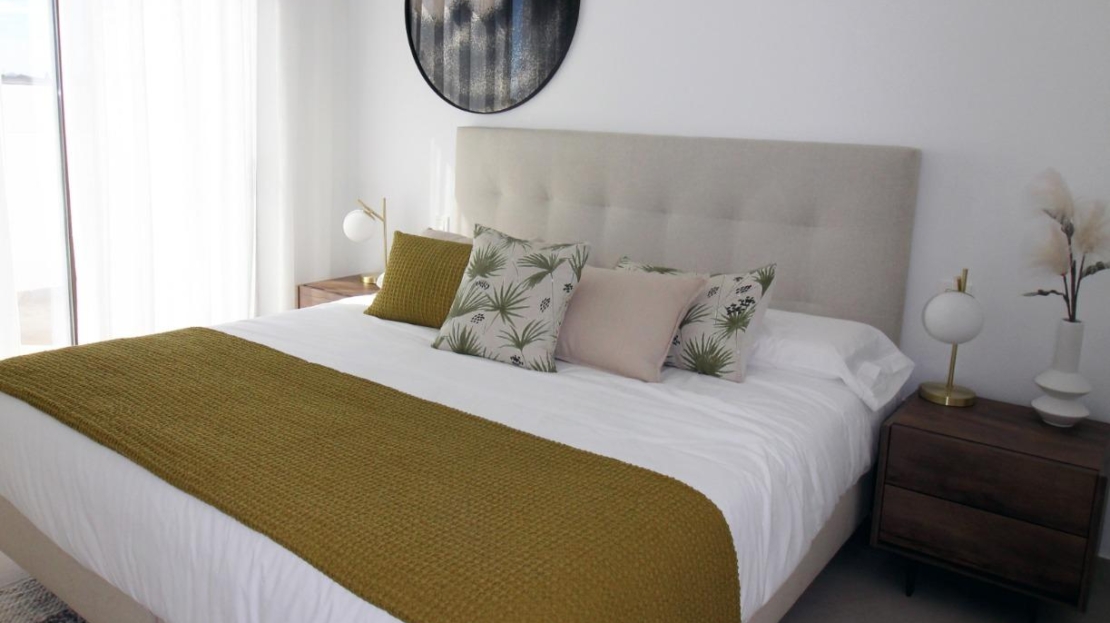 Wnętrza wykończone są materiałami najwyższej jakości, w tym gładkimi tynkami ściennymi, porcelanowymi płytkami podłogowymi oraz szafami wnękowymi w każdej sypialni. Otwarte kuchnie są w pełni wyposażone w nowoczesne szafki. Dodatkowe udogodnienia obejmują instalację klimatyzacji kanałowej i systemy aerotermiczne zapewniające energooszczędną ciepłą wodę.
