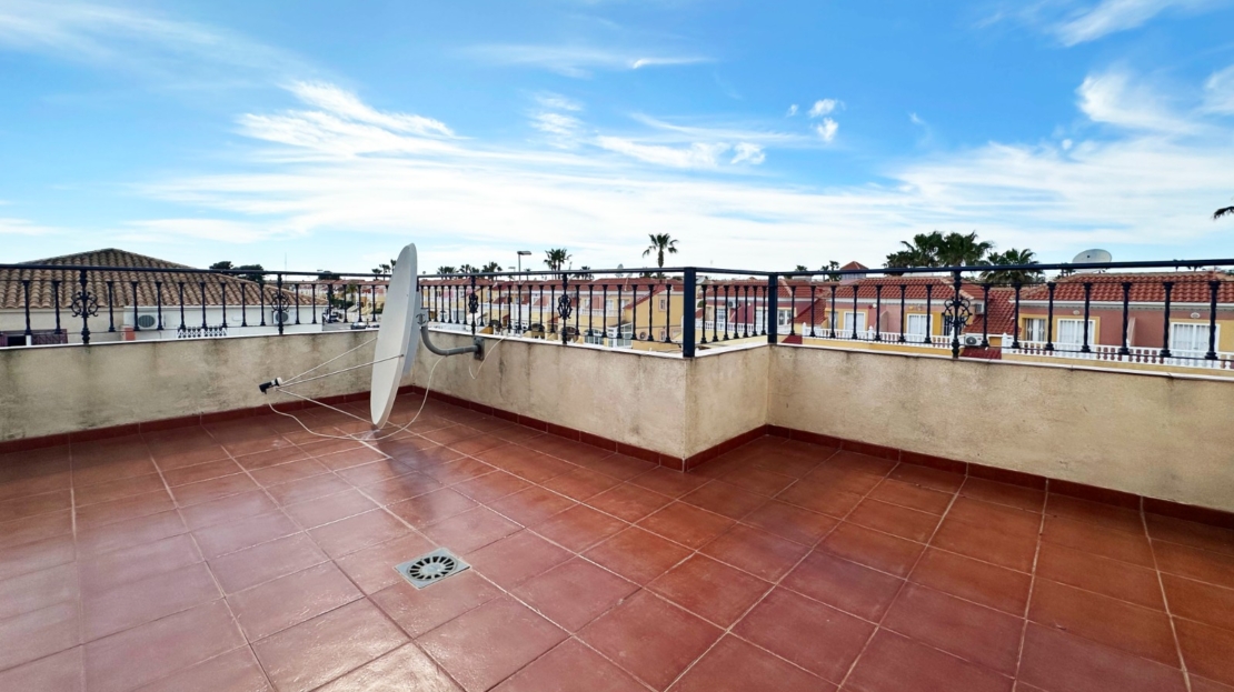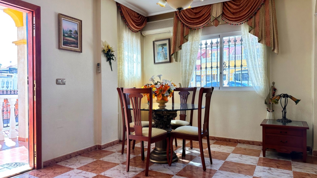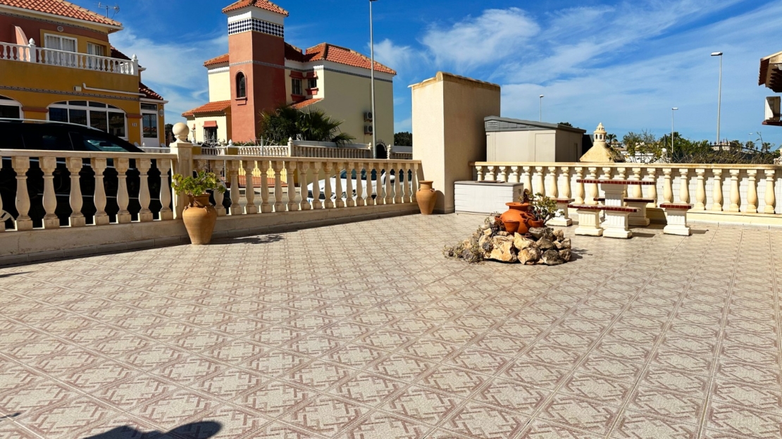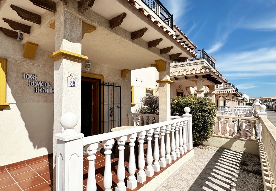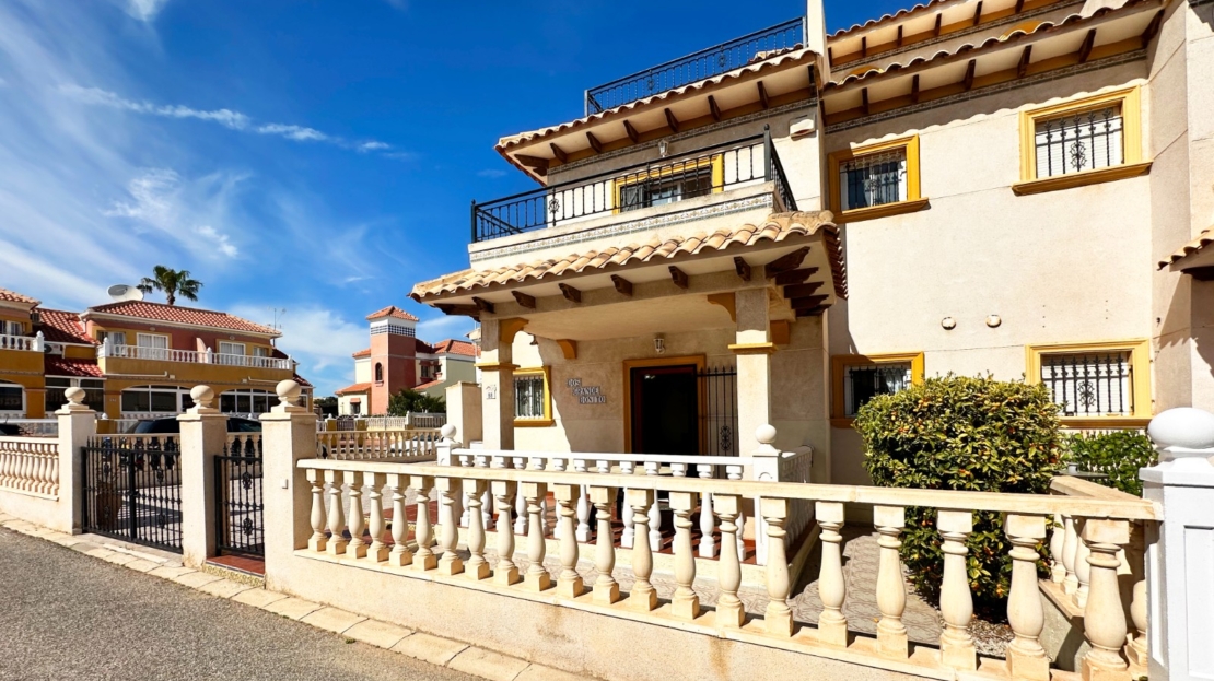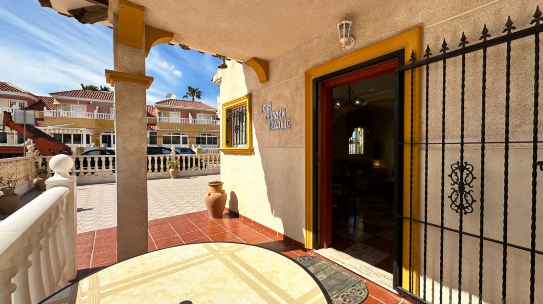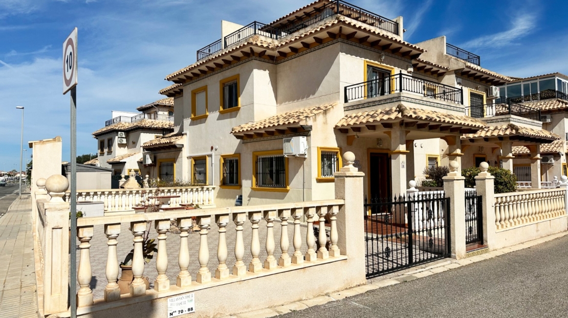This beautiful two-bedroom, two-bathroom villa is ideally located in the highly desirable area of Cabo Roig, offering a perfect combination of comfort, style, and Mediterranean lifestyle. Set within a well-maintained community, the property enjoys a peaceful setting while being within easy walking distance of local amenities, making it an excellent choice for both permanent living and holiday use.The villa benefits from a generous private garden area and a front-facing sun terrace, ideal for outdoor dining, relaxing, and entertaining. These outdoor spaces provide the perfect environment to enjoy the region’s year-round sunshine. A standout feature of the property is the impressive roof solarium, designed as a true suntrap. This generous space is perfect for sunbathing, hosting guests, or simply unwinding while enjoying the spanish way of life.Upon entering the property, you are welcomed into a bright and spacious lounge and dining area, designed to maximise natural light and comfort. The room is finished with beautiful tiled flooring throughout, enhancing the sense of space while providing practicality and ease of maintenance. The open and airy layout creates a welcoming atmosphere, ideal for both relaxing and socialising.The fully fitted kitchen is offering both functionality and a convenient breakfast bar. The kitchen provides ample storage and workspace, making it ideal for everyday cooking and entertaining alike.The upper level of the property houses two spacious bedrooms, the master bedroom benefiting from their own private sun balcony, allowing plenty of natural light and pleasant outdoor space. The master bedroom is equipped with air-conditioning, ensuring comfort throughout the warmer months. A family bathroom is also located on this level, finished to a good standard and conveniently positioned to serve both bedrooms.Residents of the community enjoy access to a well-maintained communal swimming pool, perfect for cooling off during the summer and relaxing in a tranquil environment. The property is ideally situated within a short walking distance of a variety of bars, restaurants, and local services, offering convenience without the need for a car.The location is particularly attractive, with beautiful beaches just a five-minute drive away, several renowned golf resorts close by, and excellent transport links. Alicante and Murcia airports can both be reached in approximately fifty minutes, making the property easily accessible for both residents and visiting guests.This charming villa offers an excellent opportunity to enjoy coastal living in one of the Costa Blanca’s most sought-after areas, whether as a permanent residence, holiday home, or investment property.