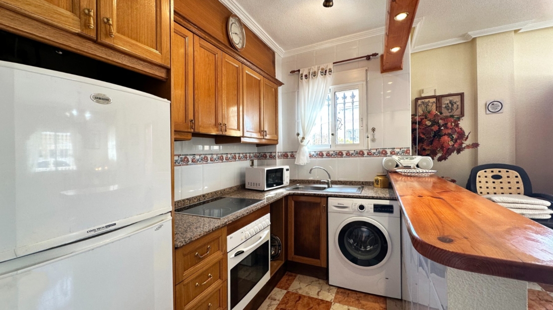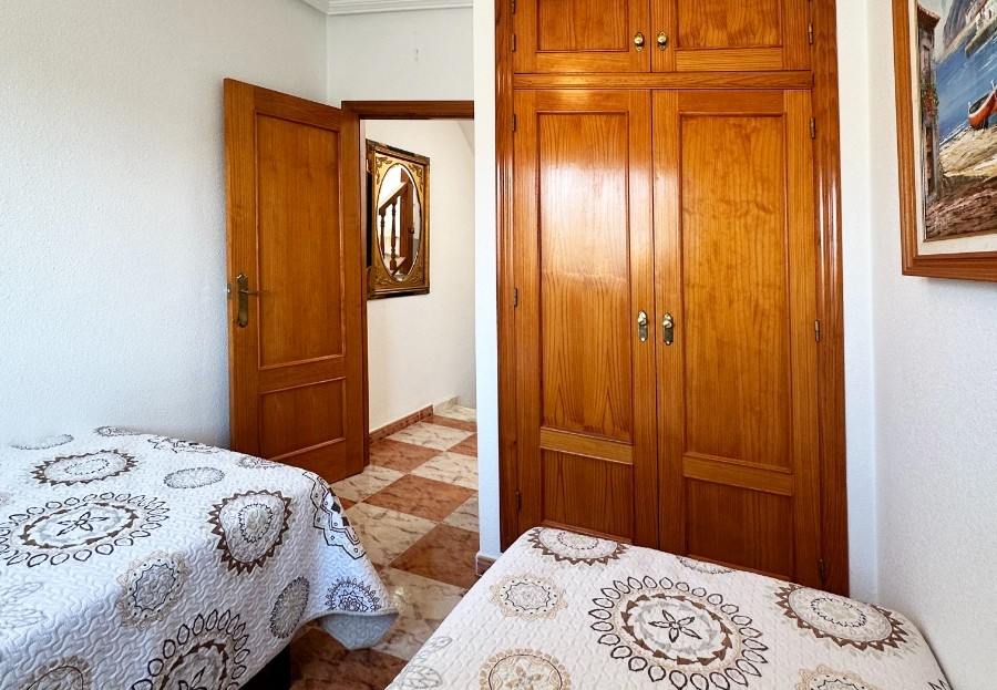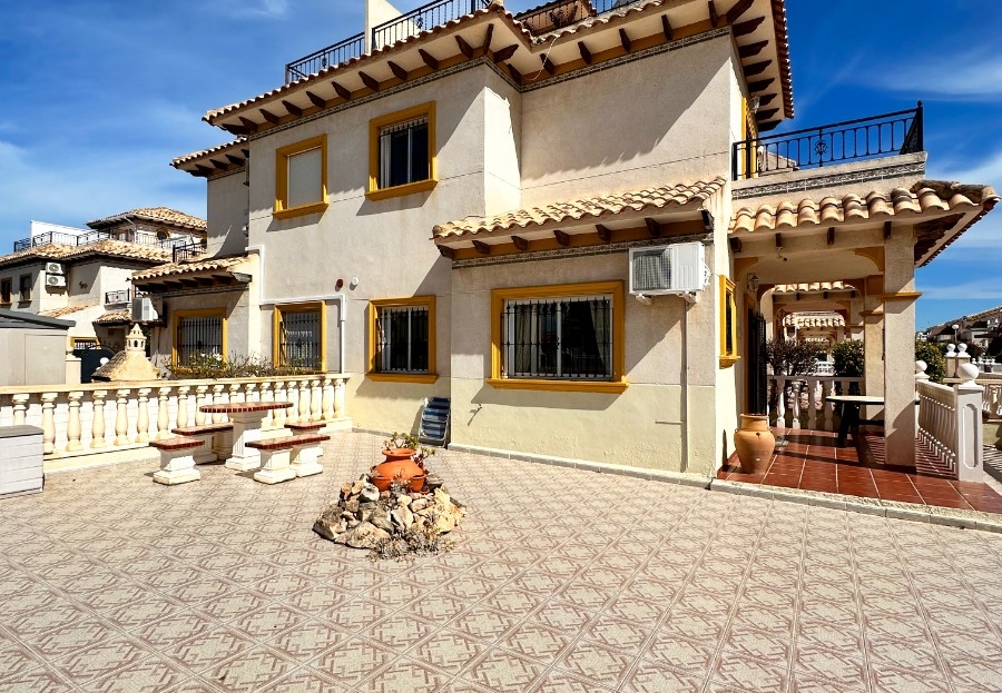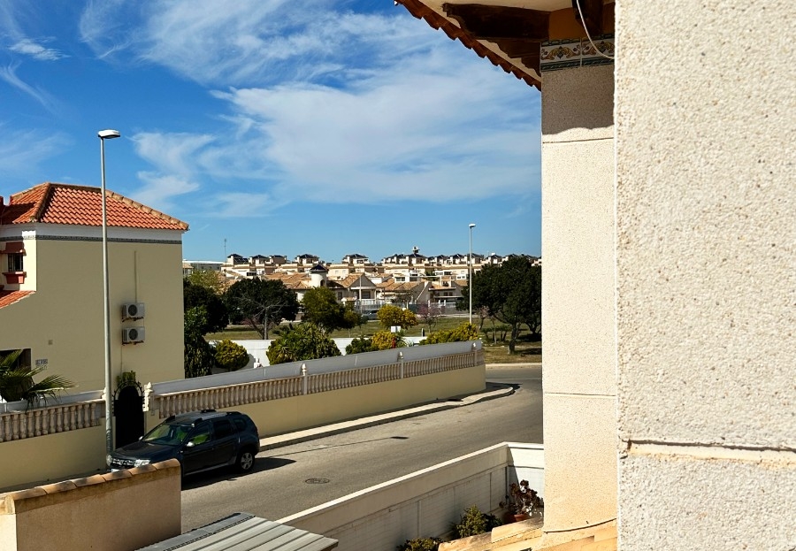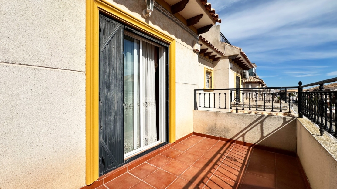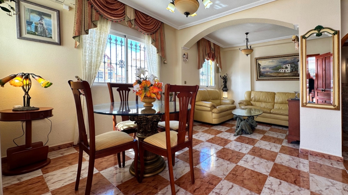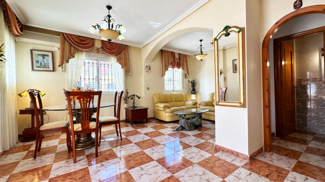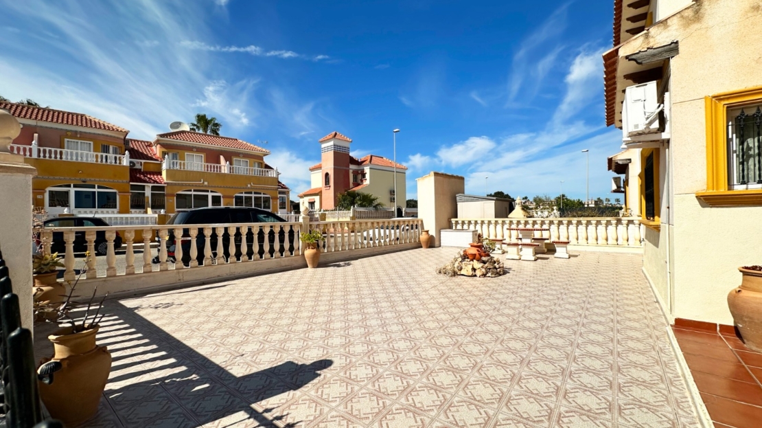 This beautiful two-bedroom, two-bathroom villa is ideally located in the highly desirable area of Cabo Roig, offering a perfect combination of comfort, style, and Mediterranean lifestyle. Set within a well-maintained community, the property enjoys a peaceful setting while being within easy walking distance of local amenities, making it an excellent choice for both permanent living and holiday use.The villa benefits from a generous private garden area and a front-facing sun terrace, ideal for outdoor dining, relaxing, and entertaining. These outdoor spaces provide the perfect environment to enjoy the region’s year-round sunshine. A standout feature of the property is the impressive roof solarium, designed as a true suntrap. This generous space is perfect for sunbathing, hosting guests, or simply unwinding while enjoying the spanish way of life.Upon entering the property, you are welcomed into a bright and spacious lounge and dining area, designed to maximise natural light and comfort. The room is finished with beautiful tiled flooring throughout, enhancing the sense of space while providing practicality and ease of maintenance. The open and airy layout creates a welcoming atmosphere, ideal for both relaxing and socialising.The fully fitted kitchen is offering both functionality and a convenient breakfast bar. The kitchen provides ample storage and workspace, making it ideal for everyday cooking and entertaining alike.The upper level of the property houses two spacious bedrooms, the master bedroom benefiting from their own private sun balcony, allowing plenty of natural light and pleasant outdoor space. The master bedroom is equipped with air-conditioning, ensuring comfort throughout the warmer months. A family bathroom is also located on this level, finished to a good standard and conveniently positioned to serve both bedrooms.Residents of the community enjoy access to a well-maintained communal swimming pool, perfect for cooling off during the summer and relaxing in a tranquil environment. The property is ideally situated within a short walking distance of a variety of bars, restaurants, and local services, offering convenience without the need for a car.The location is particularly attractive, with beautiful beaches just a five-minute drive away, several renowned golf resorts close by, and excellent transport links. Alicante and Murcia airports can both be reached in approximately fifty minutes, making the property easily accessible for both residents and visiting guests.This charming villa offers an excellent opportunity to enjoy coastal living in one of the Costa Blanca’s most sought-after areas, whether as a permanent residence, holiday home, or investment property.