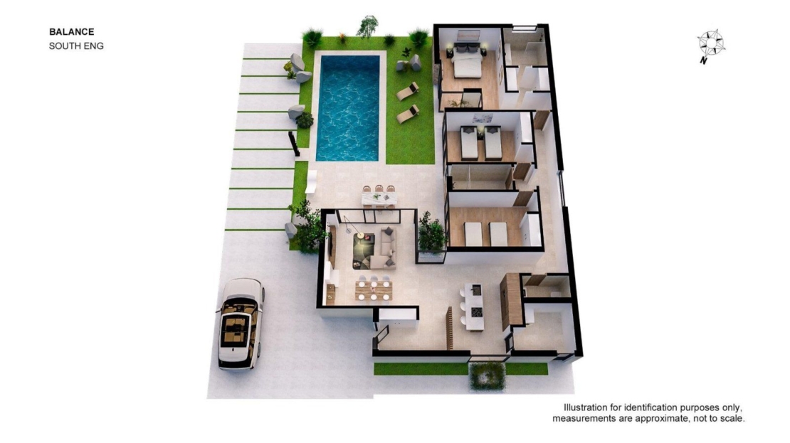Villa ma 3 sypialnie, 2 łazienki, kuchnia na otwartym planie z częścią wypoczynkową abd bezpośredni dostęp do ogrodu z prywatnym basenem i miejscem parkingowym.