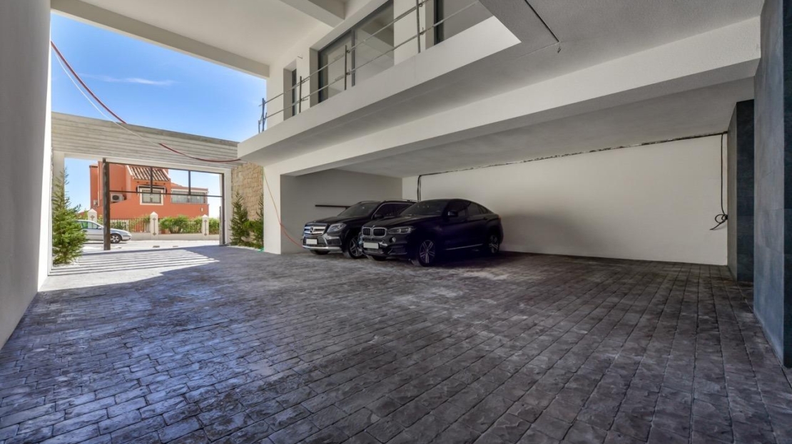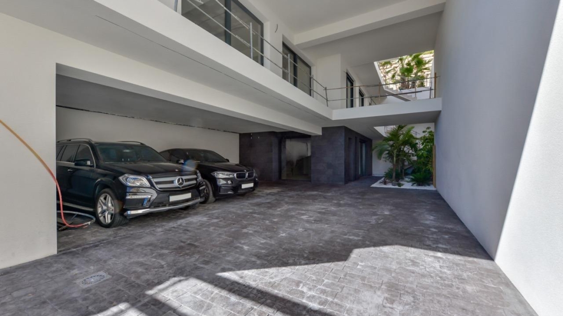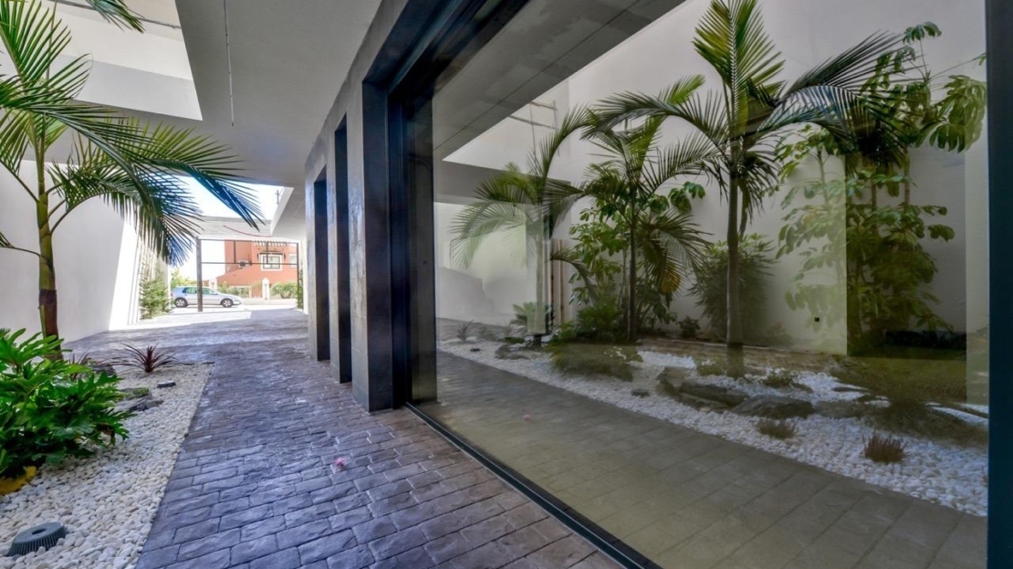 Dojeżdżając do Urbanizacji znajduje się naturalny kamienny mur o wysokości 7 metrów i automatyczna brama wjazdowa do willi, w której znajduje się zadaszony garaż na poziomie ulicy o podwójnej wysokości, z naturalnym światłem i ogrodem z palmami o różnej wysokości o powierzchni 180 m2, przeszklone pomieszczenie o powierzchni 78 m2 z windą, wewnętrzną klatką schodową, szatnią i wystarczającą ilością miejsca na fotele, przekształcenie tej przestrzeni w biuro lub po prostu poczekalnię dla gości.