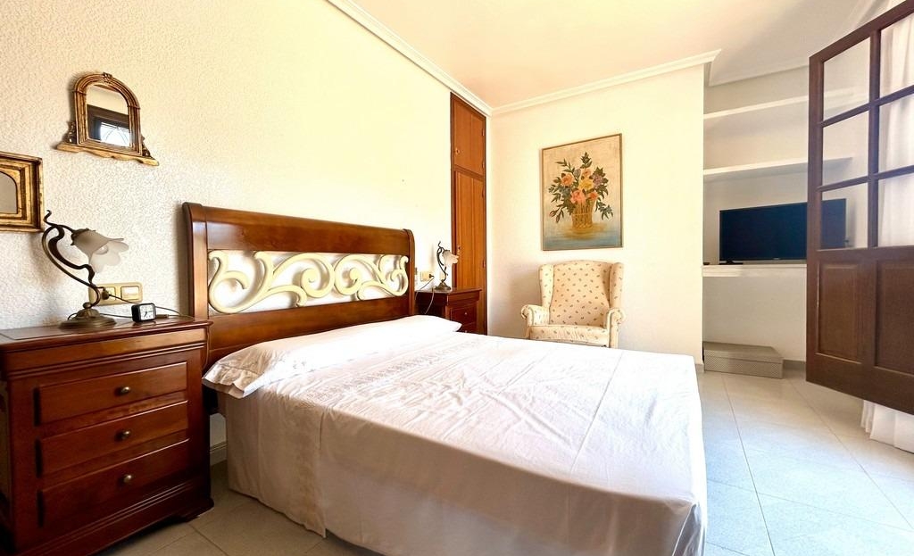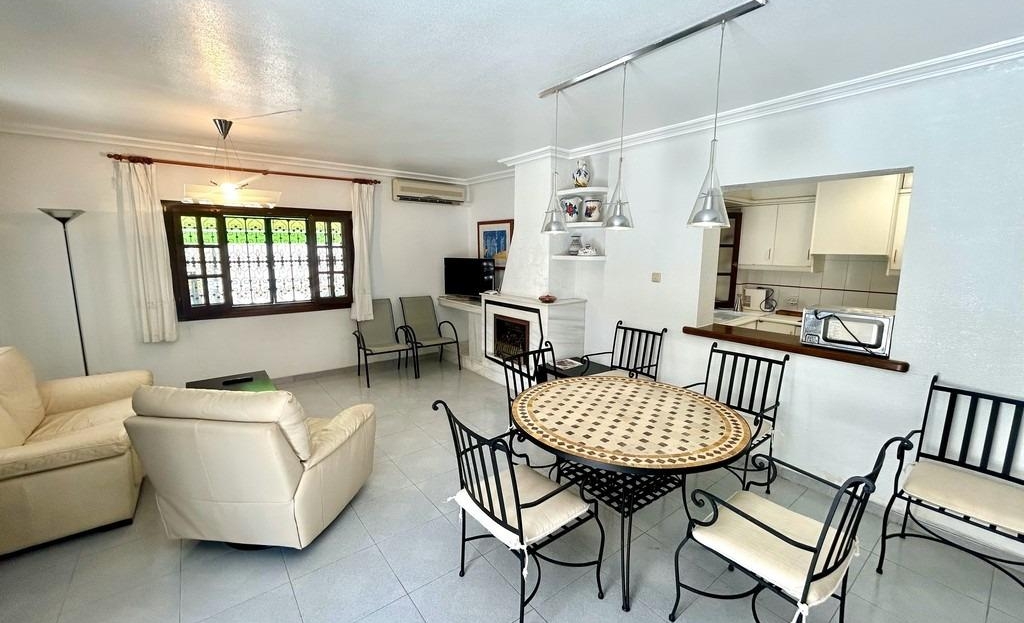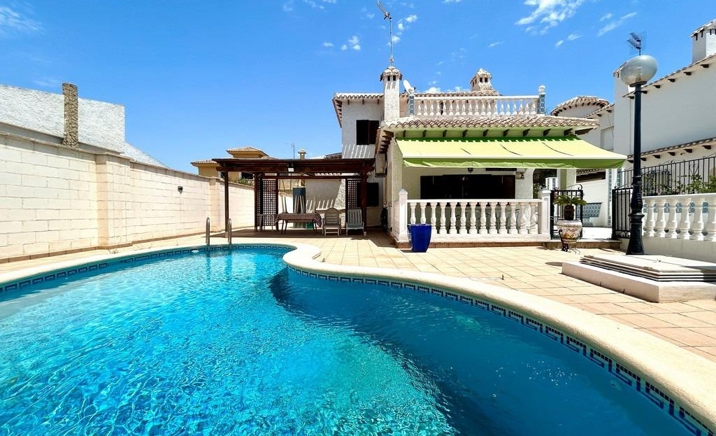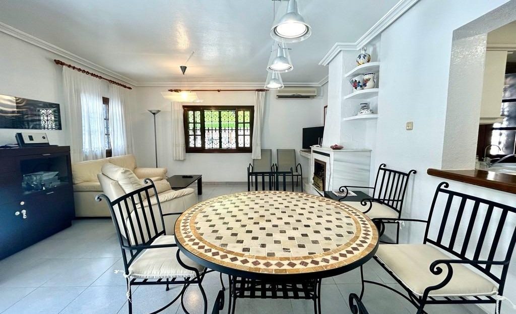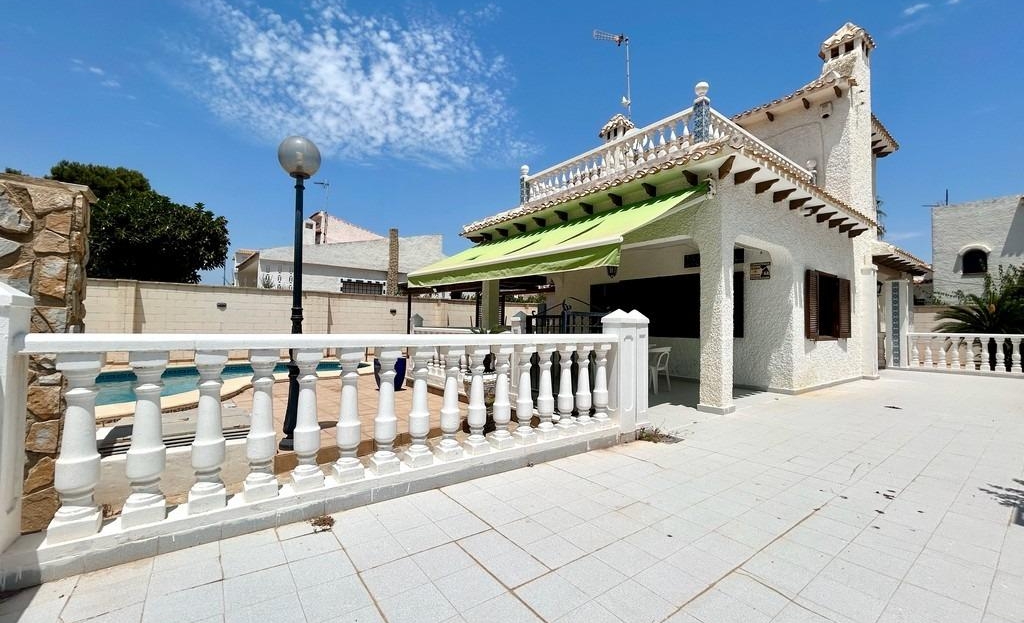 Detached chalet located in one of the most popular areas of Orihuela Costa, La Zenia, just 400m from the beach. Built on a 453m2 plot, the two-story home has approximately 150m2 of living space. On the ground floor, we find a spacious and bright living-dining room with a fireplace, a semi-independent kitchen, two double bedrooms, one bathroom, and a laundry room. There is a spacious front porch. On the first floor, there are two more bedrooms and another bathroom. From the master bedroom, there is access to the approximately 20m2 terrace. The home faces south. It has a 28m2 private saltwater pool. The basement includes a closed garage. Sold furnished. Close to all necessary services, a wide variety of bars and restaurants, it is an ideal location for year-round living or a wonderful holiday. La Zenia Beach is less than a 10-minute walk away. La Zenia Boulevard Shopping Center is a 5-minute drive away.~~The sale price does not include tax (ITP – current rate according to autonomous community)