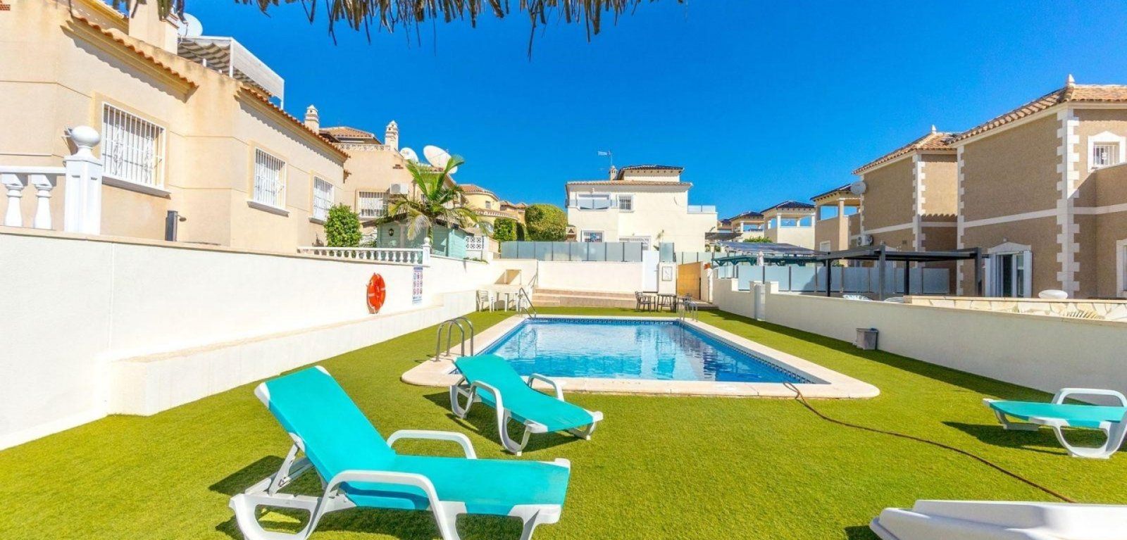 Nos complace presentar esta villa independiente y bien mantenida, situada en la codiciada zona residencial de Blue Lagoon, Villamartin.La vivienda cuenta con 3 dormitorios y 2 baños, distribuidos en una distribución funcional ideal tanto para vivir todo el año como para vacaciones. El salón es luminoso y se conecta perfectamente con una cocina totalmente equipada, mientras que los dormitorios ofrecen un alojamiento cómodo para familia o invitados.En el exterior, dispone de una amplia terraza en planta baja perfecta para comer al aire libre, además de un solárium con vistas panorámicas al mar — el lugar ideal para relajarse al sol. También incluye aparcamiento privado y acceso a una piscina comunitaria bien cuidada.Ubicada en una zona tranquila pero cerca de campos de golf, playas y servicios locales, esta villa ofrece un estilo de vida mediterráneo relajado en la Costa Blanca.