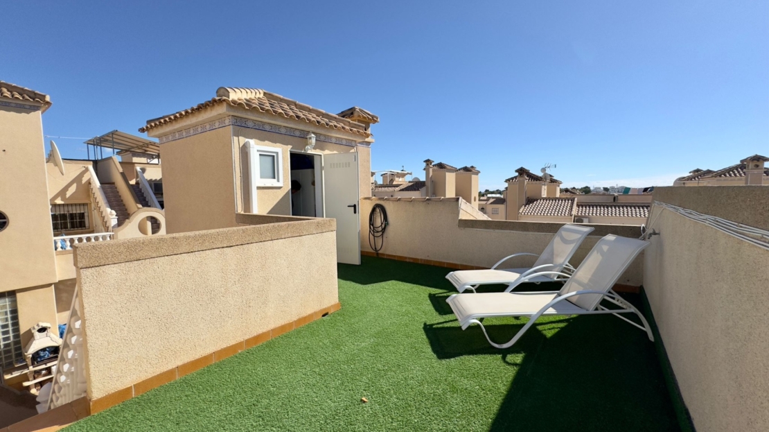 This beautiful villa was completely renovated in February 2023 to a high standard. The floors, kitchen, bathrooms, electrical system, and plasterwork were all updated, giving the house a modern and fresh look.The villa is situated on a spacious private plot with a large paved terrace and a private heated pool with a jacuzzi – ideal for year-round use. There’s ample space for al fresco dining, sunbathing, or entertaining. There’s also access to a communal pool just a short walk away.The ground floor features a bright, spacious living/dining room, a modern kitchen , and a stylish bathroom with a walk-in shower and laundry room. On the first floor are two double bedrooms with fitted wardrobes and a spacious, modern bathroom – also with a walk-in shower. The master bedroom boasts a private terrace with unobstructed views.A staircase leads to the roof terrace , covered with artificial grass – an ideal spot for relaxing or entertaining. Under the stairs is a practical storage room . This level also features an additional room that could serve as a third bedroom, office, or hobby room.The house is sold partially furnished , including white goods and air conditioning .The Zodiaco V urbanization enjoys a prime location : just 500 meters from shops, bars, restaurants, and a bus stop. The popular La Fuente shopping center and Villamartin Plaza are about a 20-minute walk away , while beaches, golf courses , and the Zenia Boulevard shopping center are just a few minutes’ drive away.A unique, stylishly renovated villa that perfectly combines comfort, modern design and an excellent location .This beautifully renovated house awaits you! Don’t hesitate to contact us for more information or to schedule a visit.