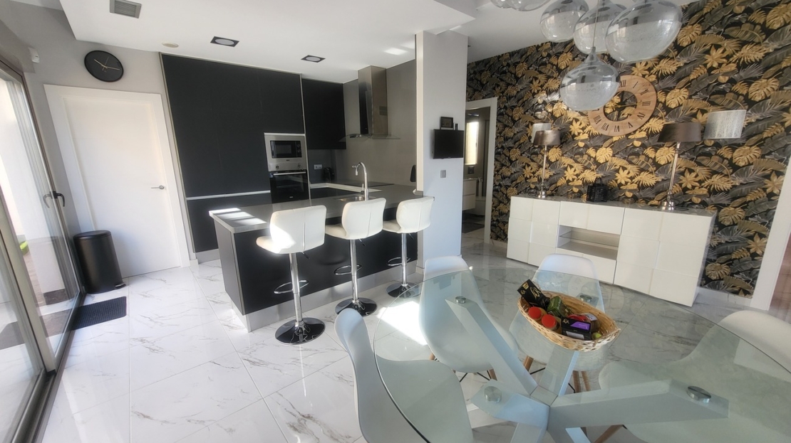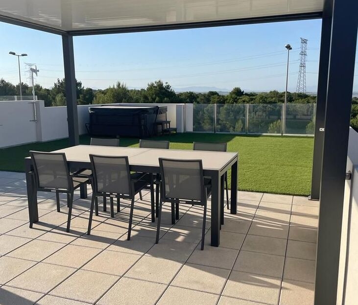 Villa de lujo en venta de una solo planta con solárium impresionante en la urbanización Pink Paradise. Esta preciosa propiedad tiene 3 dormitorios y 2 baños (uno en suite).El gran salón-comedor tiene puertas que dan al jardín, proporcionando luz natural durante todo el día. La cocina americana está totalmente equipada y los amplios dormitorios tienen armarios empotrados. Dispone también de una lavandería, espacio de tamaño perfecto para poner la lavadora.La villa es INTELIGENTE, está equipada con tecnología domótica personalizada, que ofrece una mejor calidad de vida sin duda: gestión descentralizada, mayor seguridad, eficiencia energética, etc.Dispone de una piscina de buen tamaño y de un solarium privado de 104 m² con cocina equipada, toldo y spa, de donde se puede disfrutar de impresionantes vistas de las salinas de Torrevieja.Esa propiedad tiene un montón de EXTRAS:-Cocina exterior-Toldo en el solarium-Trastero exterior-Alarma-Cámaras-Automatización del hogar-Parlofonía-Aire acondicionado individual/habitación-Plantas de exterior-Solarium wifi-…El chalet está idealmente situado cerca del campo de golf de Villamartín y ofrece fácil acceso a supermercados, bares, restaurantes y tiendas. La playa de La Zenia y el centro comercial Zenia Boulevard están a sólo 10 minutos en coche. Además, muchos campos de golf de renombre también están cerca. No pierda esta oportunidad única de adquirir esta magnífica villa en un entorno idílico.