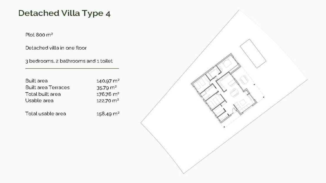 Każda willa położona jest na prywatnej działce o powierzchni 800 m² i rozmieszczona jest na jednym poziomie, zapewniając maksymalny komfort i dostępność. Do wyboru jest 5 różnych układów z 3 lub 4 sypialniami, 2 lub 3 łazienkami i powierzchnią zabudowy od 130 do 178 m². Wszystkie domy posiadają duże zadaszone tarasy, idealne do cieszenia się życiem na świeżym powietrzu przez cały rok.