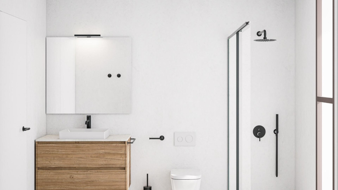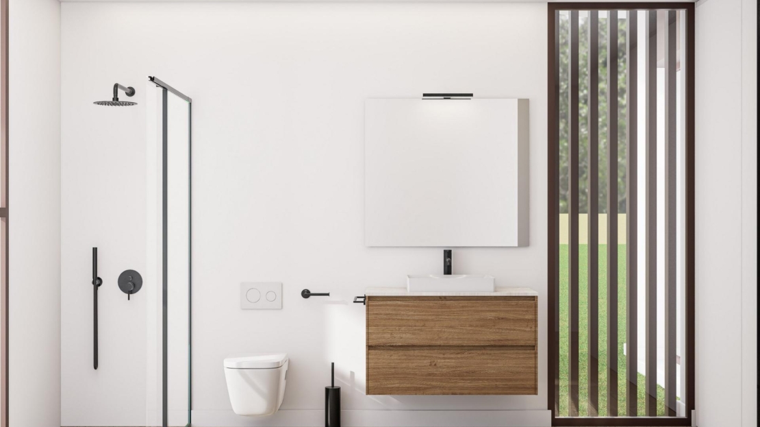 Domy wyposażone są również w systemy aerotermiczne do podgrzewania wody, w pełni wyposażone łazienki z lustrami i kabinami prysznicowymi oraz posiadają klasę energetyczną A, zapewniającą maksymalną efektywność.