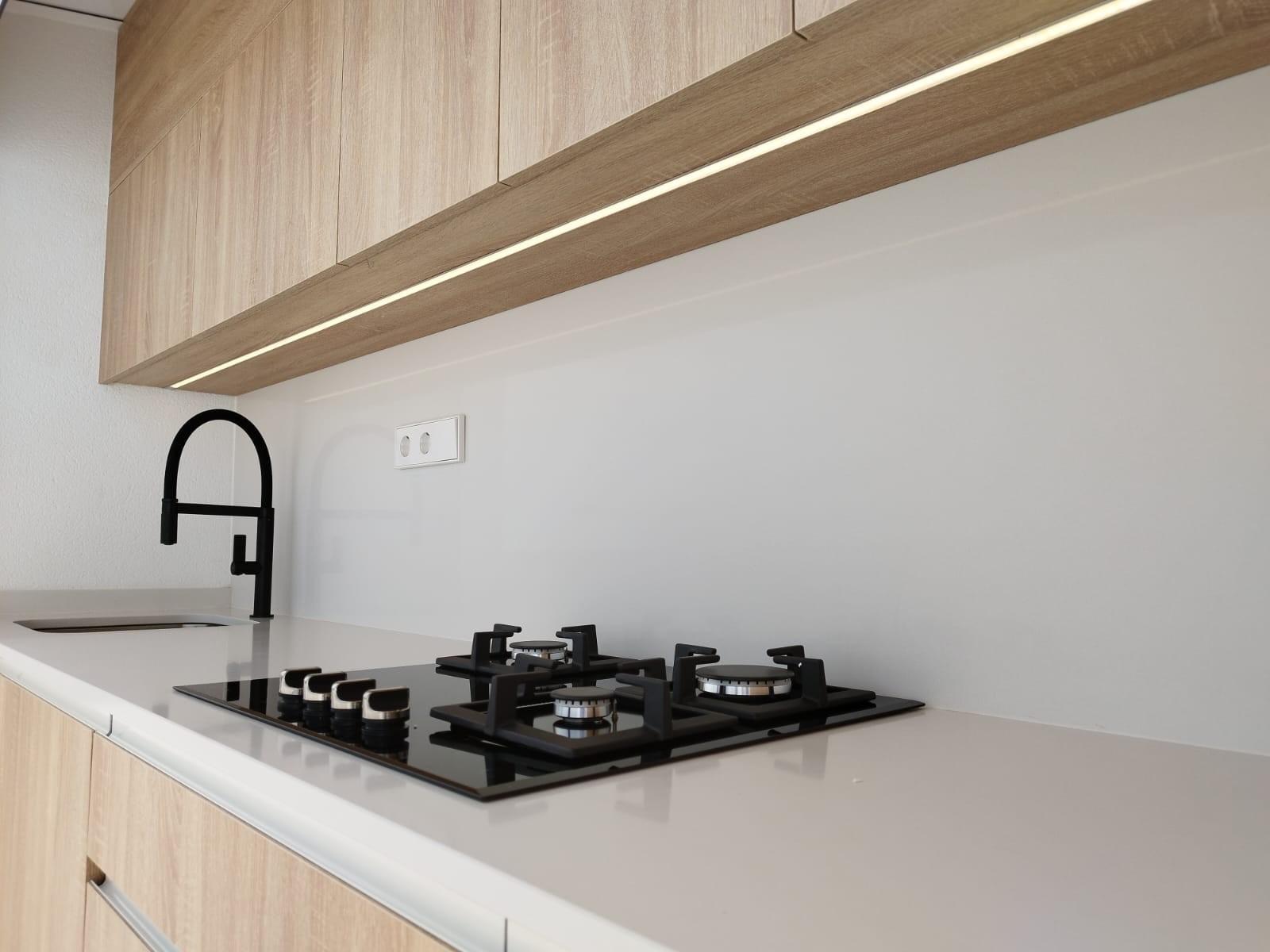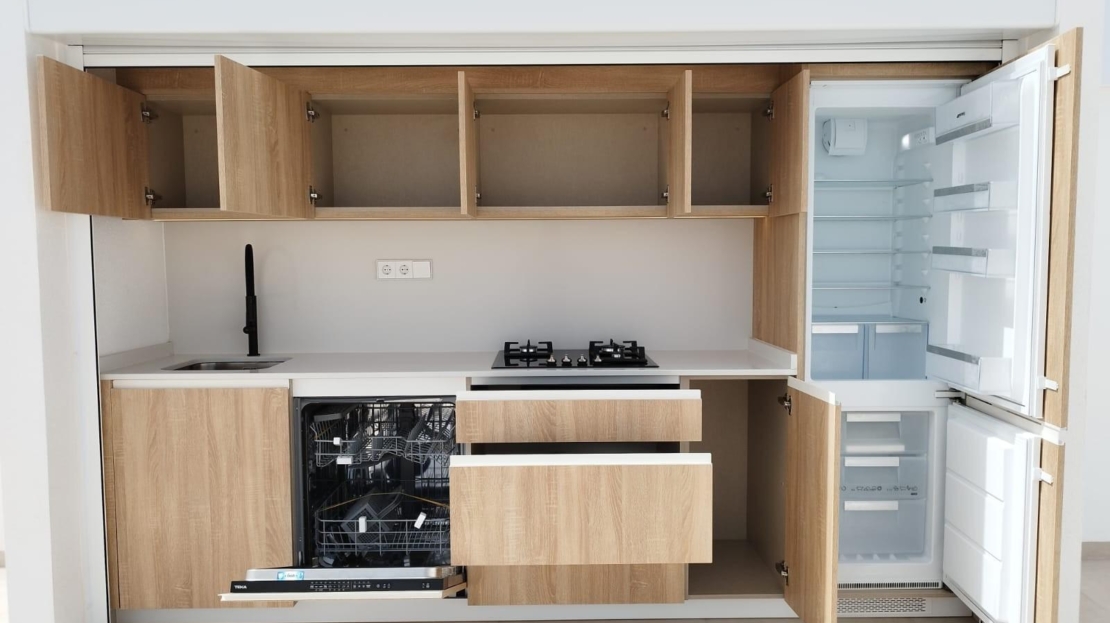 W pełni umeblowana kuchnia w białym połysku lub kolorze drewna zawiera płytę indukcyjną z wbudowanym ekstraktorem, piekarnik, mikrofalówkę, pralkę, zintegrowaną lodówkę i zintegrowaną zmywarkę.