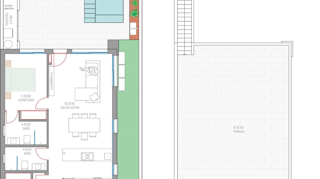 Wille zbudowane na 1 piętrze i składa się z 3 sypialni, 2 łazienki, kuchnia na otwartym planie, salon z otwartym widokiem na taras, solarium, prywatny ogród z basenem.