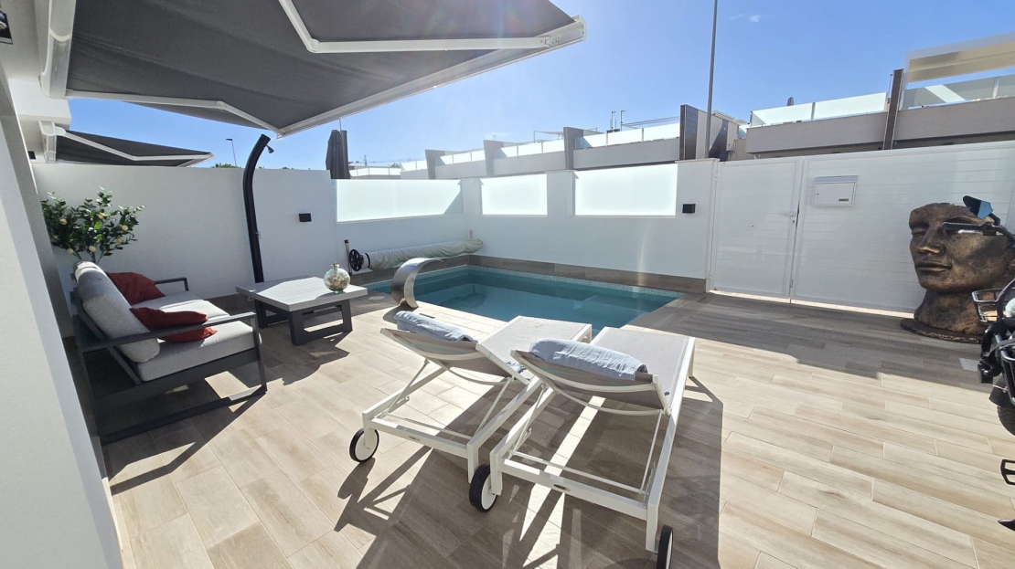 Villa in San Pedro del Pinatar – Existing construction. Dreaming of your own place on the Spanish coast where you can relax immediately without any hassle? This detached villa in San Pedro del Pinatar offers exactly that. Located on a quiet corner plot, with complete privacy and your own private pool, you can fully enjoy outdoor living.The villa features three comfortable bedrooms and two modern bathrooms. The bright open living area flows seamlessly into the garden, allowing indoor and outdoor living to blend naturally.Around the villa you will find the terrace, a well-maintained garden, a spacious balcony and a large rooftop terrace. There is always a spot to enjoy the sun or relax in the shade.The location is ideal. Within just a ten-minute walk you are at the beach or strolling along the Lo Pagán promenade. Golf lovers will be delighted, with several golf courses nearby, such as Roda Golf and Las Colinas. Nature reserves, the famous mud baths, and historic cities like Murcia and Cartagena are all easily accessible. Murcia Airport is close by and Alicante Airport is about an hour’s drive.Highlights of this property:Detached villa with lots of privacyPrivate pool and multiple outdoor areasReady to move inCentral location close to the beach, town centre and golf courses