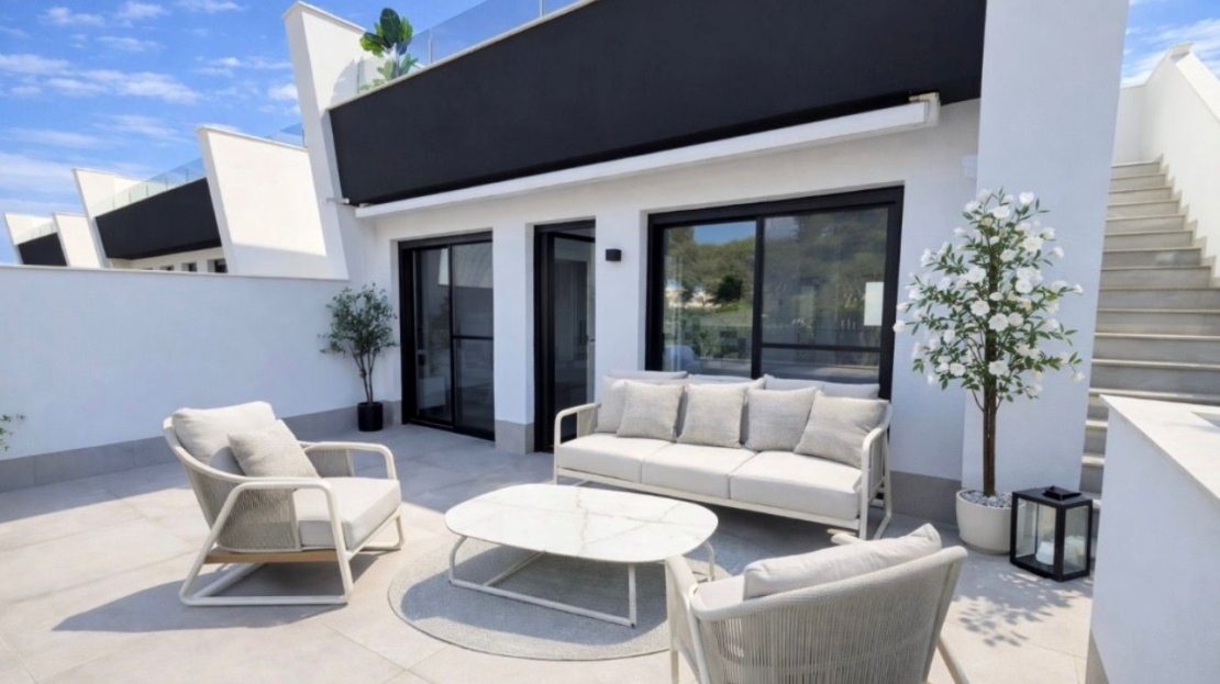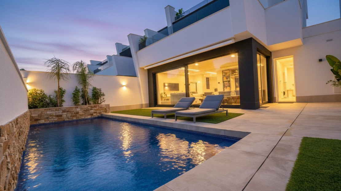 Looking for a modern new build, but do not want to wait for it to be built? Look no further as we are excited to list this stunning RESALE three bedroom four bathroom detached villa with pool and garage. Located just 950m from the beach in Santiago de la Ribera with all the amenities you could need just walking distance, public transport links with buses going to various locations including Murcia, Cartagena, Cabo de palos and Campoamor. There is also a ferry service over to La Manga Strip.On entering this stylish villa there is a hallway with a useful wardrobe which leads through to the open plan kitchen with an island and then through to the lounge which has large patio doors that open to the west facing garden which has a terraced area and a 28m2 heated pool. On this level is a double bedroom with walk through wardrobe and en suite bathroom and there is also a separate WC. Upstairs are two further double bedrooms also with walk through wardrobes and ensuites and both have patio doors to the first floor terrace which has stairs leading to the large roof solarium which has a summer kitchen and all day sun. This property has an integrated garage which has a door to the villa and a door to the garden. The property comes furnished, vented AC, anti solar glare glazing, automated mosquito blinds, and electric awnings. Do not hesitate to contact us to arrange to view this stunning villa.