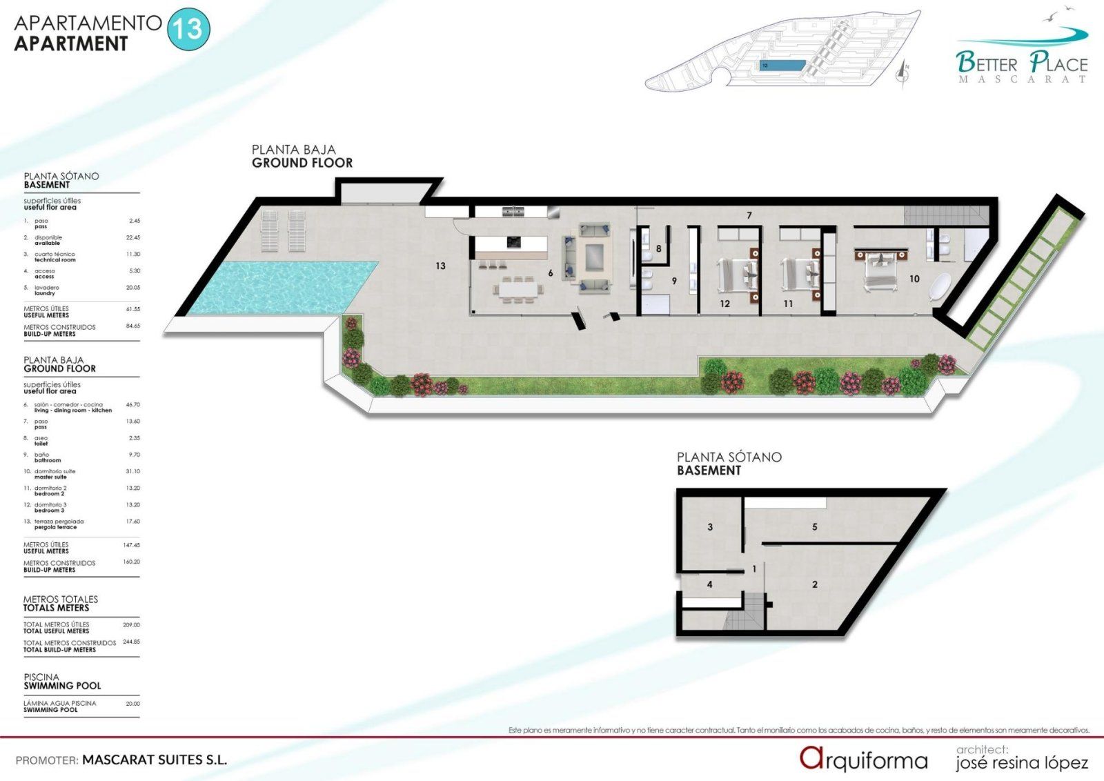 La promoción ofrece 6 apartamentos exclusivos, cada uno con amplias terrazas, hermosos jardines y piscina privada. Todos los apartamentos cuentan con tres dormitorios, dos baños y un aseo adicional para invitados. Todas las viviendas disponen de dos plazas de aparcamiento asignadas en el garaje subterráneo vigilado, así como acceso a una gran piscina semioolímpica comunitaria y a un funicular panorámico que conecta los diferentes niveles de la comunidad. Cada apartamento dispone de un espacio tipo sótano con lavadero y trastero conectado con la vivienda.