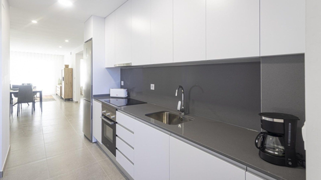 Cocina con mueble alto y bajo, en color blanco, tirador tipo gola, fregadero 1 seno con escurridor, vitrocerámica, horno eléctrico y campana extractora.