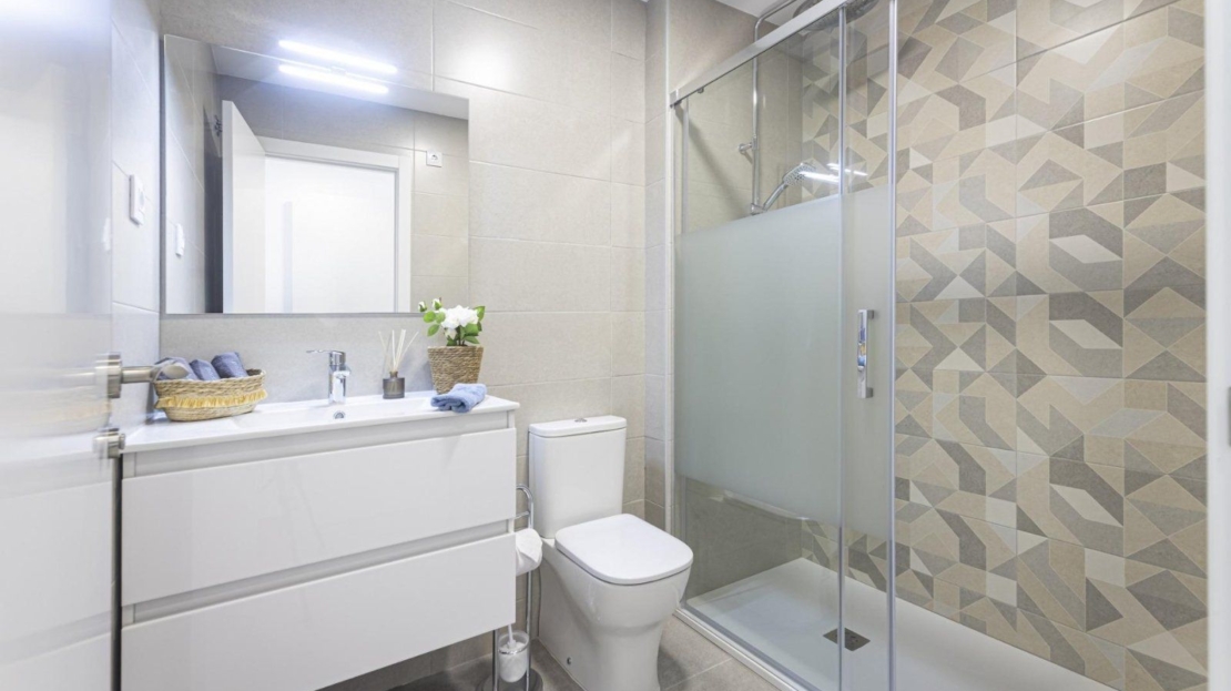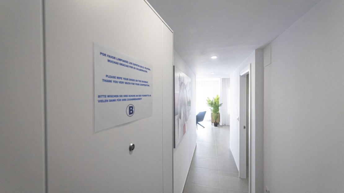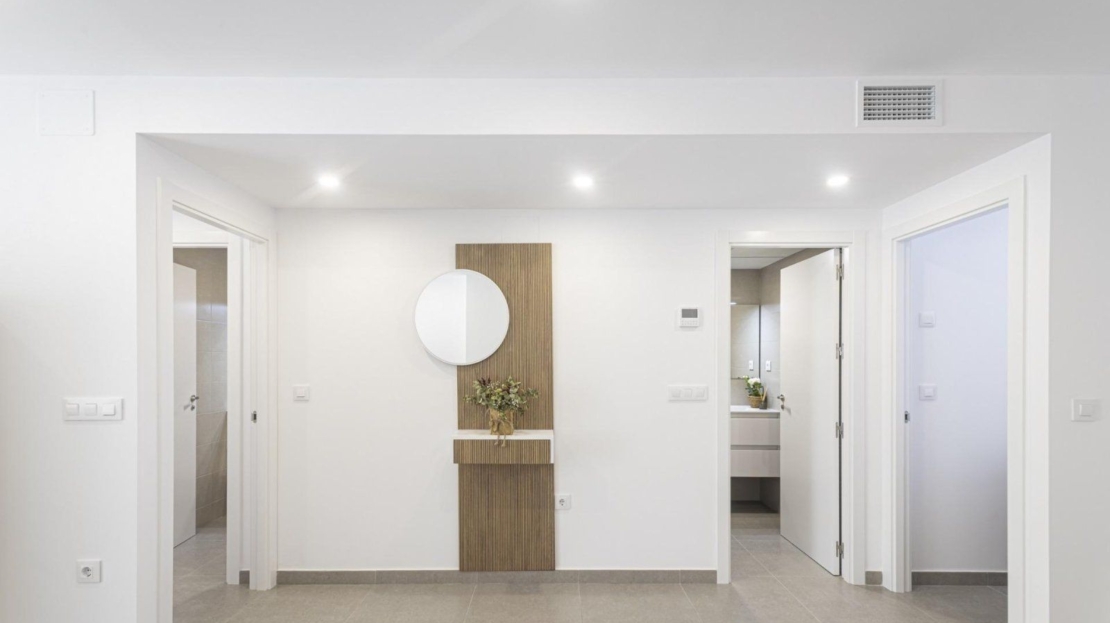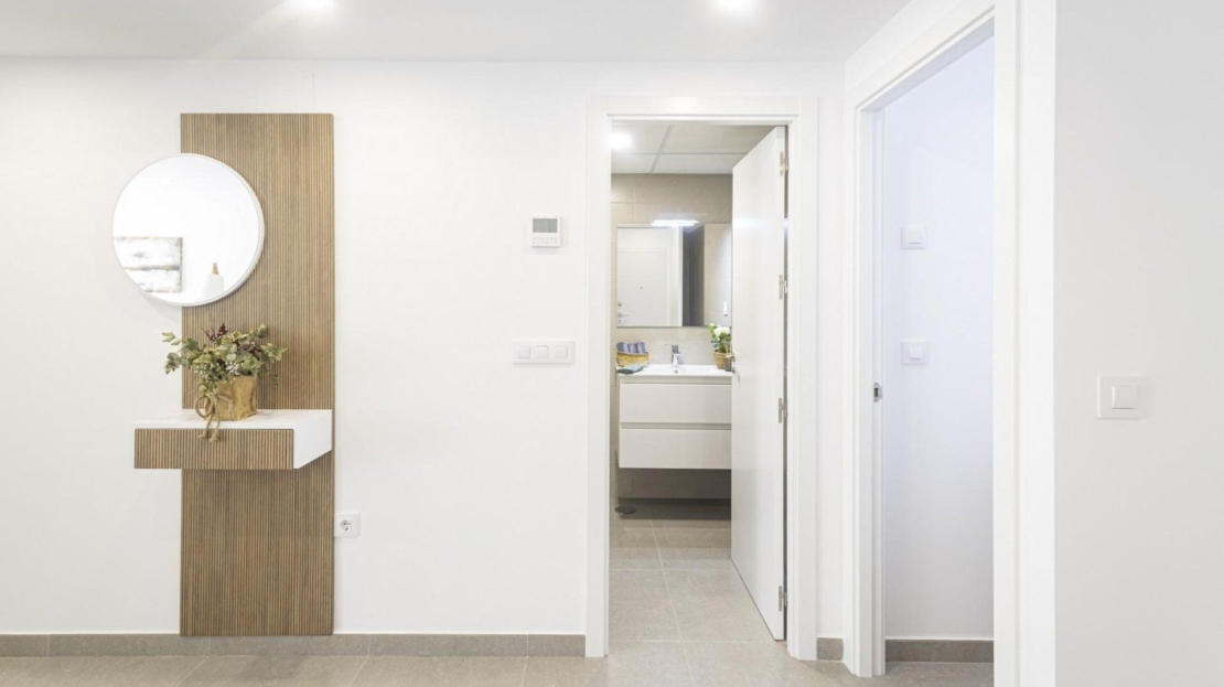 Apartamentos con puerta de entrada blindada y puertas lacadas en blanco con herrajes de acero inoxidable.