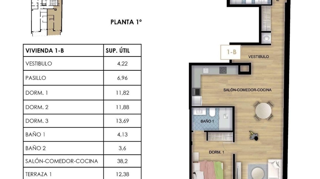 Las modernas viviendas disponen de 3 dormitorios, 3 baños, cocina americana con el salón, suelos radiantes en los baños, amplias terrazas, armarios y cocina totalmente equipados.