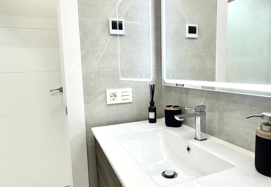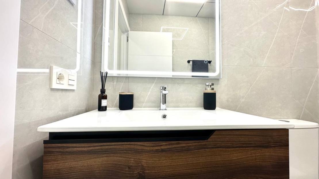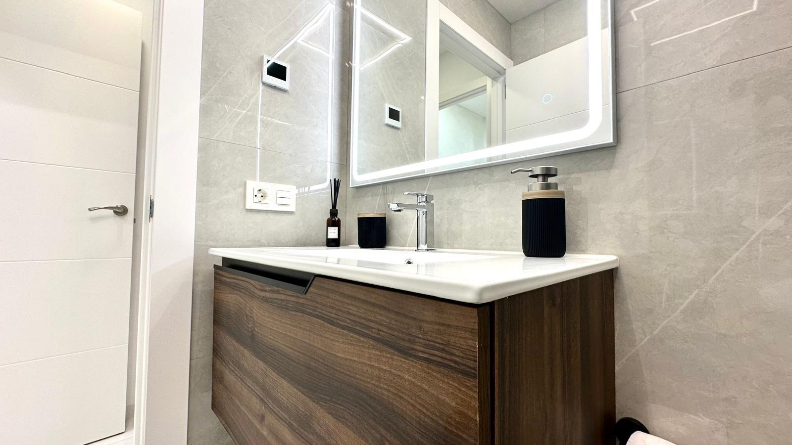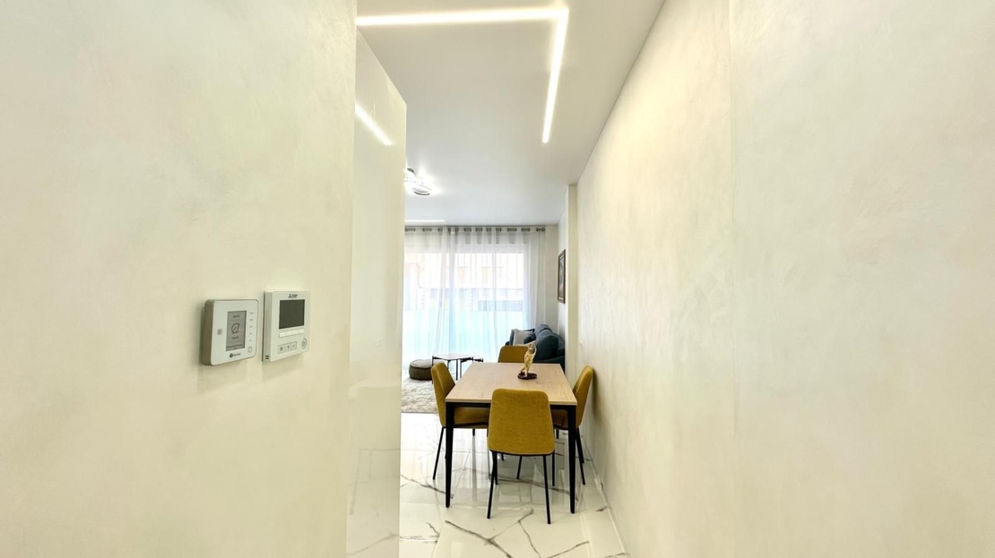 Espectacular planta baja reformada junto a la Playa del Cura Ubicada en segunda línea de la emblemática Playa del Cura, esta vivienda representa una oportunidad única para disfrutar de la comodidad, el diseño y la cercanía al mar. Con una superficie total de 90 m² útiles, esta planta baja totalmente reformada combina a la perfección la modernidad, el confort y la calidad en cada detalle. Desde el primer momento, la propiedad destaca por su excelente reforma integral, donde se ha cuidado al máximo cada aspecto estético y funcional. La vivienda se entrega completamente amueblada y decorada con un estilo moderno y elegante, utilizando materiales de primera calidad. Todos los muebles son nuevos, al igual que los electrodomésticos, lo que permite entrar a vivir sin necesidad de realizar ningún tipo de inversión adicional. La distribución interior es amplia y bien pensada. Dispone de una acogedora cocina americana, equipada con mobiliario contemporáneo y conectada directamente con un luminoso salón-comedor de ambiente abierto. Esta estancia principal goza de una orientación sur, lo que garantiza una excelente luminosidad durante todo el día. Además, cuenta con una gran ventana panorámica equipada con persianas eléctricas, que permite disfrutar de la luz natural y de la brisa mediterránea con total comodidad. El confort está asegurado gracias a su sistema de aire acondicionado centralizado con tecnología ECO, que garantiza una temperatura ideal durante todo el año optimizando el consumo energético. La zona de descanso se compone de dos amplias habitaciones dobles, ambas decoradas con gusto y diseñadas para ofrecer la máxima tranquilidad. La habitación principal dispone de un baño en suite, proporcionando privacidad y funcionalidad. El segundo baño, igualmente moderno y totalmente equipado, da servicio al resto de la vivienda. Como complemento ideal, la vivienda cuenta con un fabuloso patio trasero, un espacio exterior perfecto para relajarse, disfrutar de reuniones familiares o crear un rincón verde y tranquilo en pleno corazón de la ciudad. En definitiva, esta propiedad reúne todas las cualidades que definen una vivienda exclusiva en la costa: ubicación inmejorable, materiales de alta calidad, equipamiento moderno y un diseño pensado para el confort. Situada a escasos metros del mar, es una opción ideal tanto como residencia habitual, vivienda vacacional o inversión segura en una de las zonas más demandadas de Torrevieja.