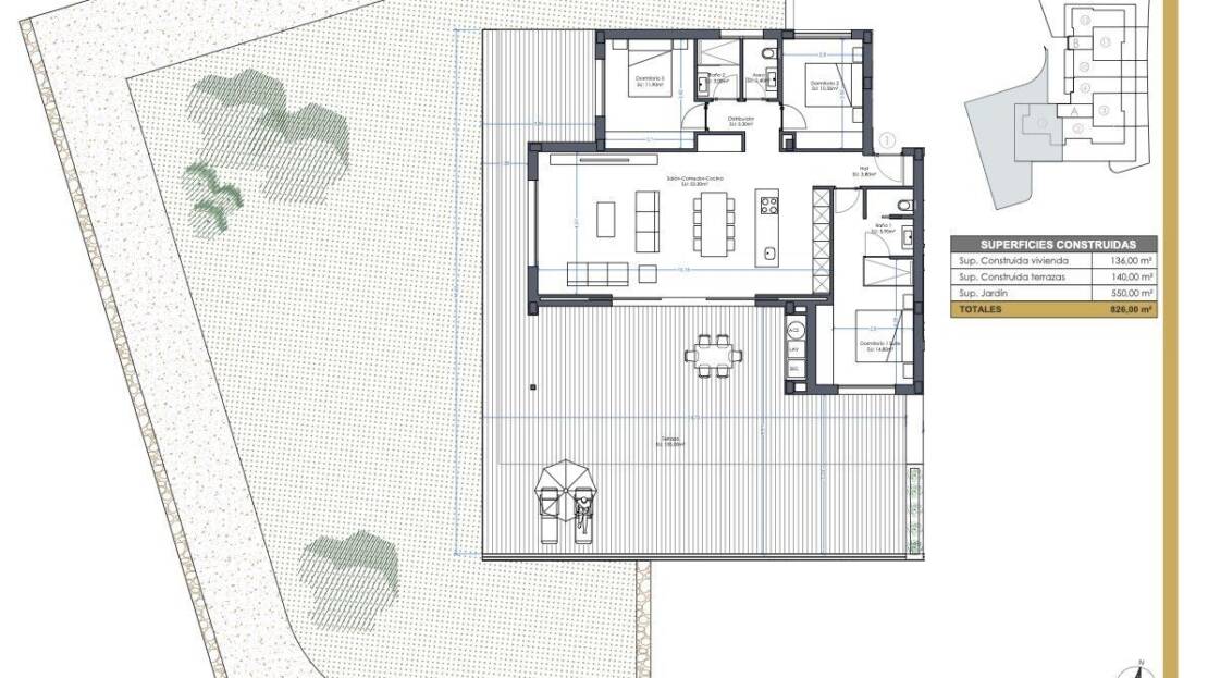 La propiedad está formada por 3 dormitorios, 3 baños, cocina americana y salón-comedor en 136m2 construidos. También cuenta con una terraza de 140m2 y un jardín de 550m2.