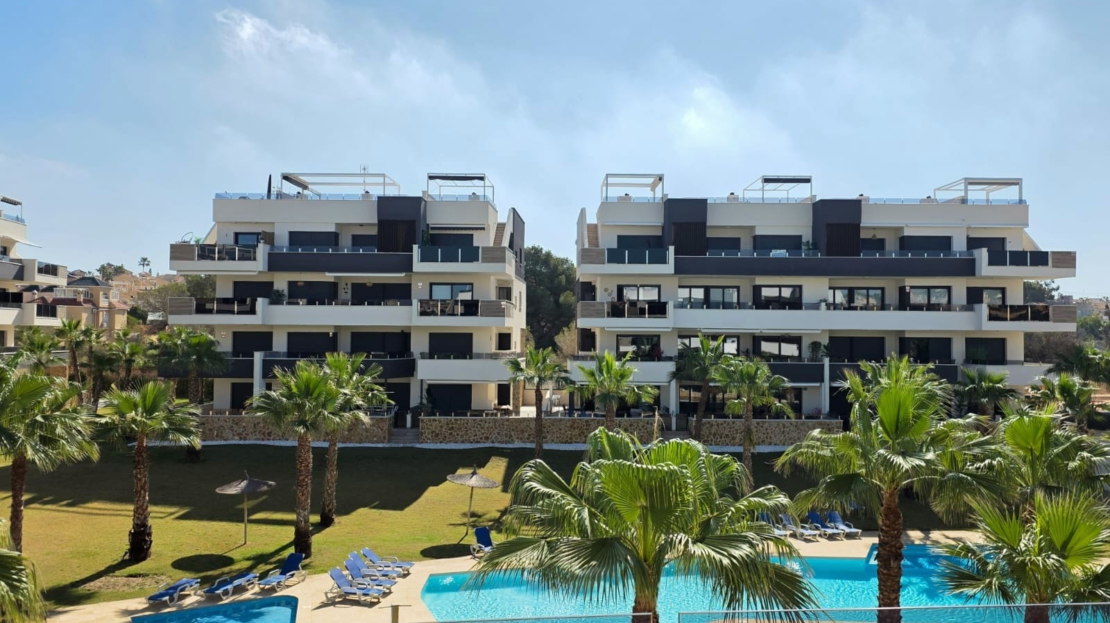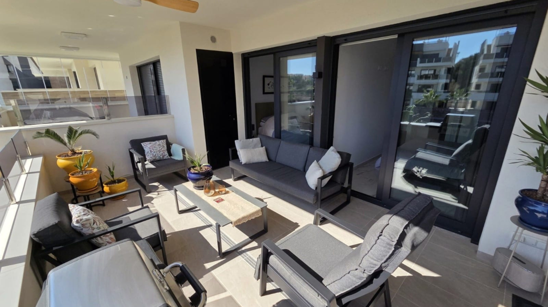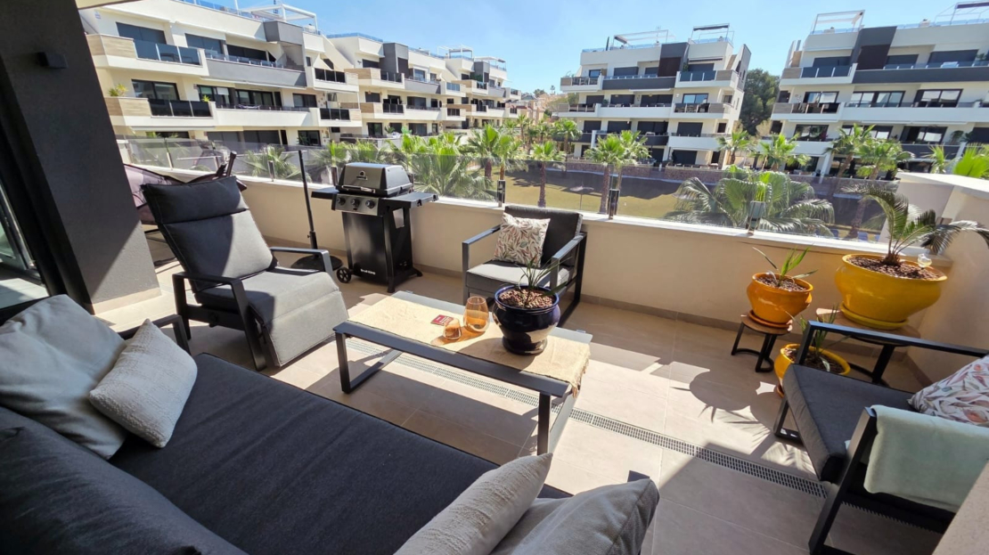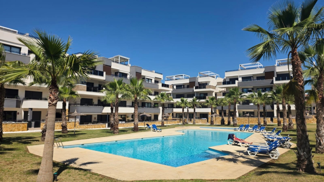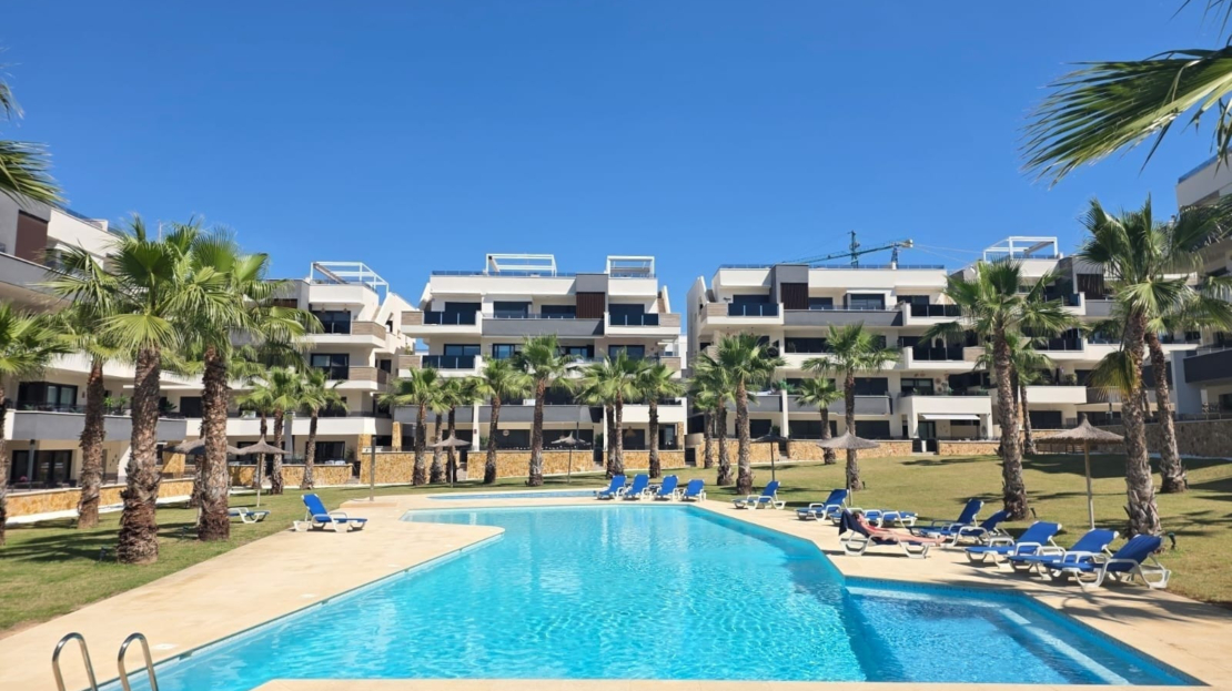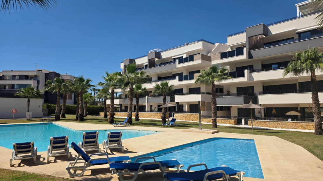 Luxury apartment for sale in Resort Amanecer, located in the sought-after area of Los Altos in Orihuela Costa. Completed in 2024, this stylish and contemporary property offers an excellent opportunity as a holiday home, permanent residence or investment with strong rental potential.The apartment features a bright open-plan lounge, kitchen and dining area designed to maximize space and natural light. Large windows create a light and airy atmosphere and open directly onto a spacious private terrace, offering a seamless indoor-outdoor lifestyle. The kitchen is fully fitted with modern appliances and finished in a sleek contemporary style, blending effortlessly into the living space.There are two well-sized bedrooms, both with built-in wardrobes and positioned on the terrace side of the property, along with two modern bathrooms finished to a high standard. The apartment is sold fully-furnished and has a total built area of 81 m², offering a practical and well-balanced layout throughout.One of the standout features is the generous 29 m² private terrace, which enjoys views over the landscaped gardens and communal swimming pool. Its south-facing orientation allows for excellent morning and midday sun making it an ideal space for relaxing or eating outdoors.The property is located on the second floor of a building with a lift and includes an underground parking space and a private storage room. It is equipped with air conditioning, an Airzone climate control system, underfloor heating in the bathrooms and electric shutters, ensuring comfort throughout the year. The apartment is presented fully furnished in excellent condition and ready to move in!Residents of Amanecer X benefit from a resort-style environment, with access to a large communal swimming pool, a children’s pool, a fully equipped gym, as well as a jacuzzi and sauna, all surrounded by beautifully maintained tropical gardens with adapted exterior access for people with reduced mobility.The location is particularly convenient, with restaurants, cafés and supermarkets within walking distance, and La Zenia Boulevard just a few minutes away by car.For golf enthusiasts, the area offers a great selection of nearby courses, including Villamartín Golf just 5 minutes away, Real Club de Golf Campoamor and Las Ramblas Golf approximately 10 minutes away, and the prestigious Las Colinas Golf & Country Club around 15 minutes from the property. The sandy beaches of Orihuela Costa, such as La Zenia Beach, Playa Flamenca, Cabo Roig and Campoamor, are all within a 10-minute drive.Ideally positioned between two major airports, the property offers excellent connectivity, with Alicante Airport around 45 minutes away and Murcia International Airport approximately 35–40 minutes by car.This is a standout opportunity to own a modern home in one of the most desirable residential complexes on the Costa Blanca. Early viewing is highly recommended to fully appreciate the quality, space and lifestyle this apartment has to offer.