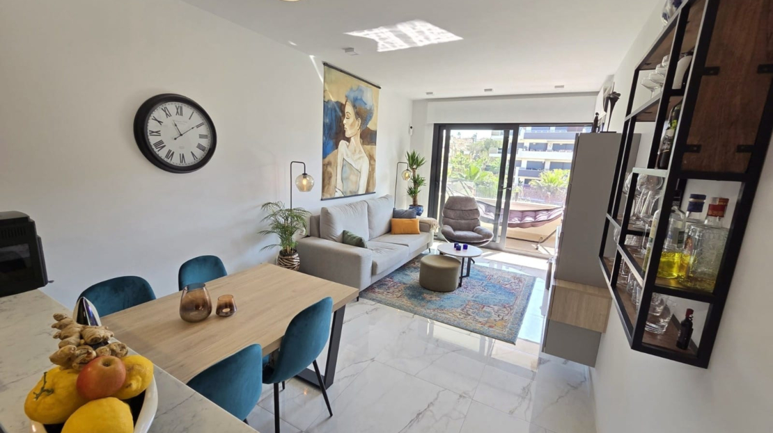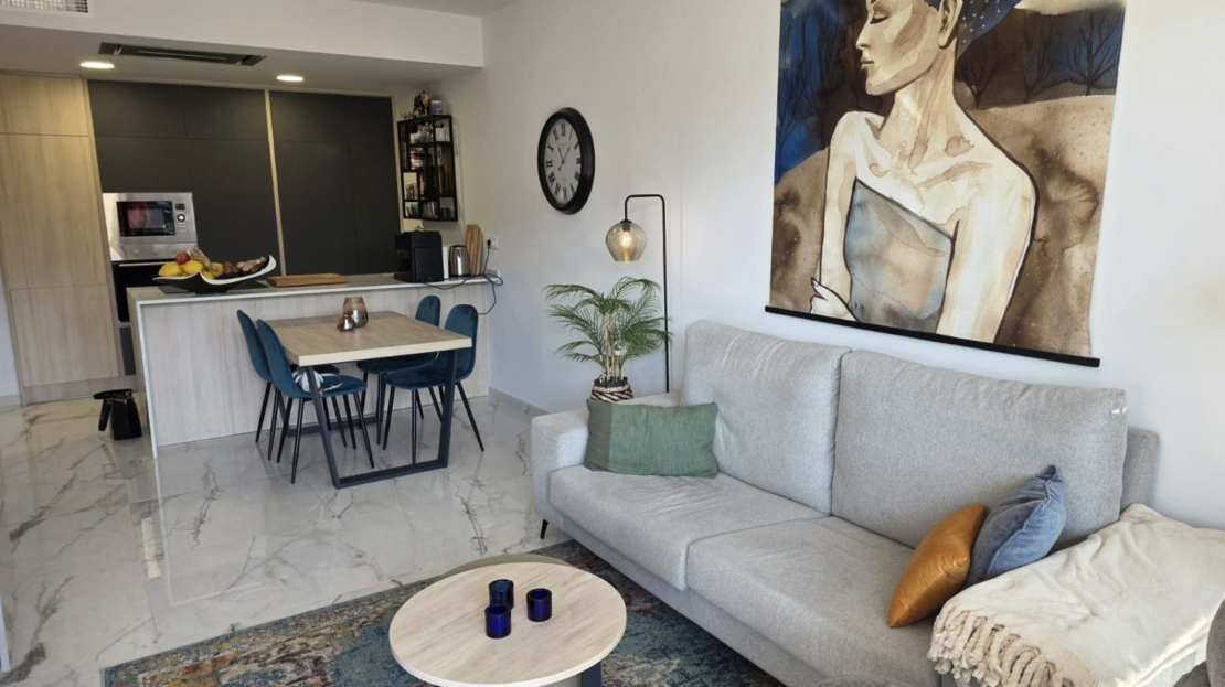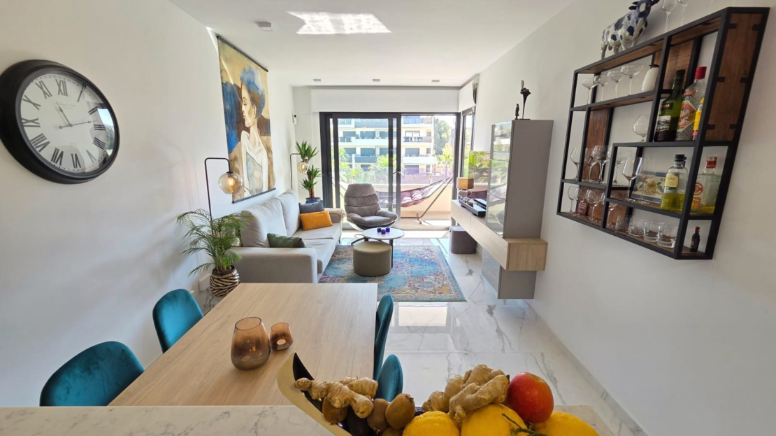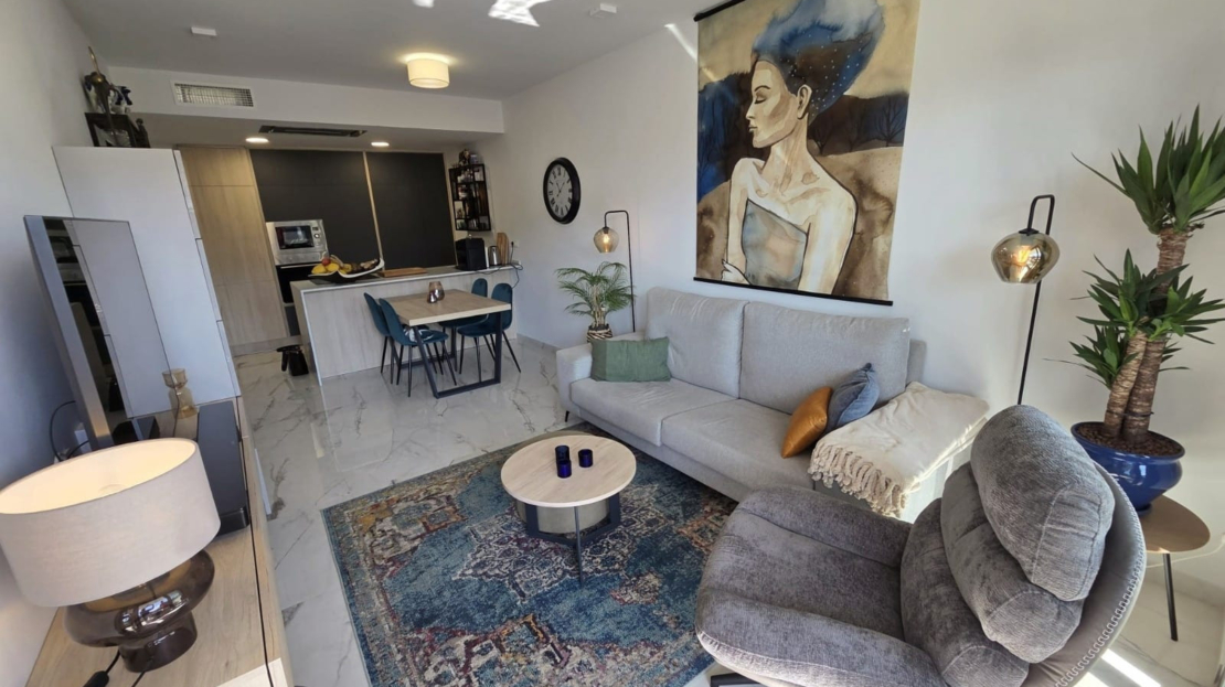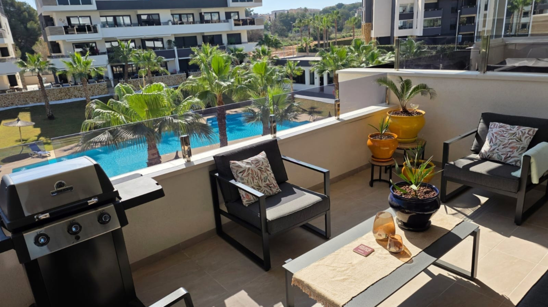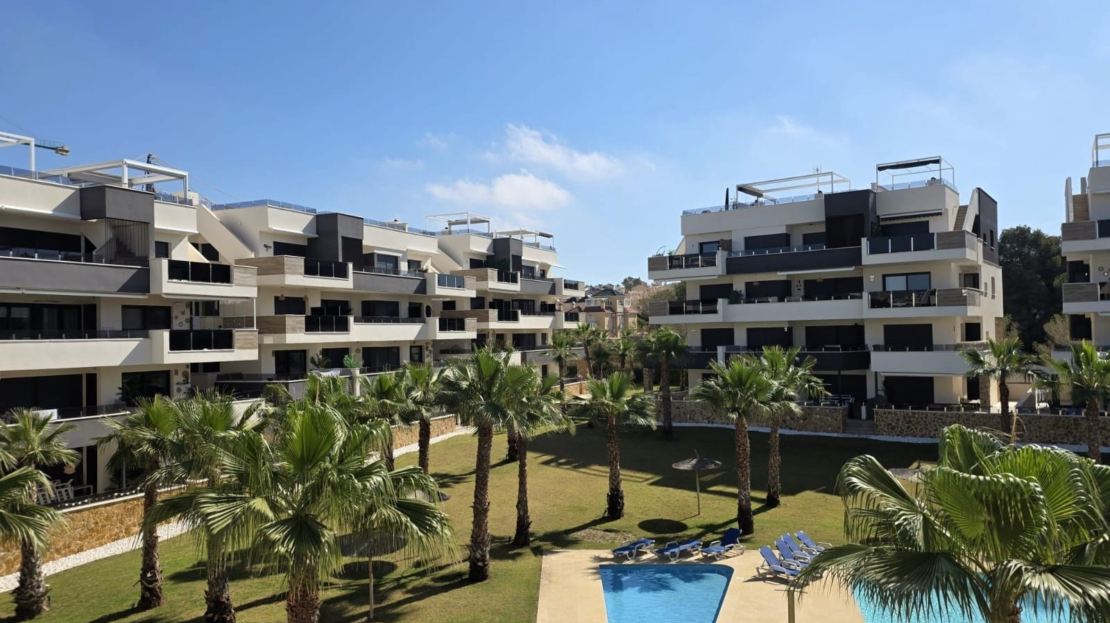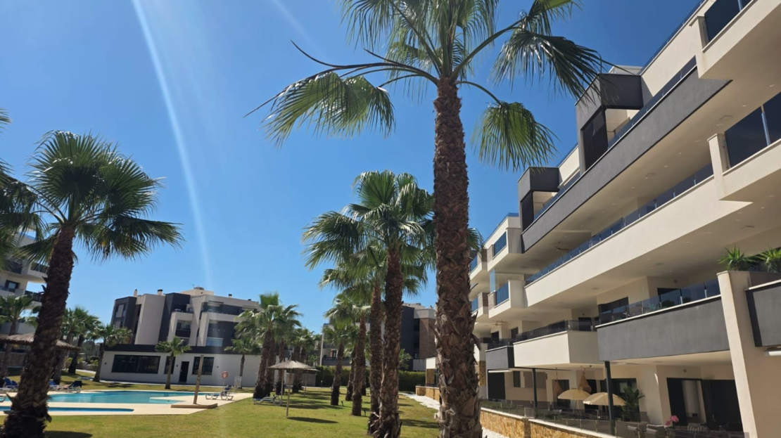 Luxury apartment for sale in Resort Amanecer, located in the sought-after area of Los Altos in Orihuela Costa. Completed in 2024, this stylish and contemporary property offers an excellent opportunity as a holiday home, permanent residence or investment with strong rental potential.The apartment features a bright open-plan lounge, kitchen and dining area designed to maximize space and natural light. Large windows create a light and airy atmosphere and open directly onto a spacious private terrace, offering a seamless indoor-outdoor lifestyle. The kitchen is fully fitted with modern appliances and finished in a sleek contemporary style, blending effortlessly into the living space.There are two well-sized bedrooms, both with built-in wardrobes and positioned on the terrace side of the property, along with two modern bathrooms finished to a high standard. The apartment is sold fully-furnished and has a total built area of 81 m², offering a practical and well-balanced layout throughout.One of the standout features is the generous 29 m² private terrace, which enjoys views over the landscaped gardens and communal swimming pool. Its south-facing orientation allows for excellent morning and midday sun making it an ideal space for relaxing or eating outdoors.The property is located on the second floor of a building with a lift and includes an underground parking space and a private storage room. It is equipped with air conditioning, an Airzone climate control system, underfloor heating in the bathrooms and electric shutters, ensuring comfort throughout the year. The apartment is presented fully furnished in excellent condition and ready to move in!Residents of Amanecer X benefit from a resort-style environment, with access to a large communal swimming pool, a children’s pool, a fully equipped gym, as well as a jacuzzi and sauna, all surrounded by beautifully maintained tropical gardens with adapted exterior access for people with reduced mobility.The location is particularly convenient, with restaurants, cafés and supermarkets within walking distance, and La Zenia Boulevard just a few minutes away by car.For golf enthusiasts, the area offers a great selection of nearby courses, including Villamartín Golf just 5 minutes away, Real Club de Golf Campoamor and Las Ramblas Golf approximately 10 minutes away, and the prestigious Las Colinas Golf & Country Club around 15 minutes from the property. The sandy beaches of Orihuela Costa, such as La Zenia Beach, Playa Flamenca, Cabo Roig and Campoamor, are all within a 10-minute drive.Ideally positioned between two major airports, the property offers excellent connectivity, with Alicante Airport around 45 minutes away and Murcia International Airport approximately 35–40 minutes by car.This is a standout opportunity to own a modern home in one of the most desirable residential complexes on the Costa Blanca. Early viewing is highly recommended to fully appreciate the quality, space and lifestyle this apartment has to offer.