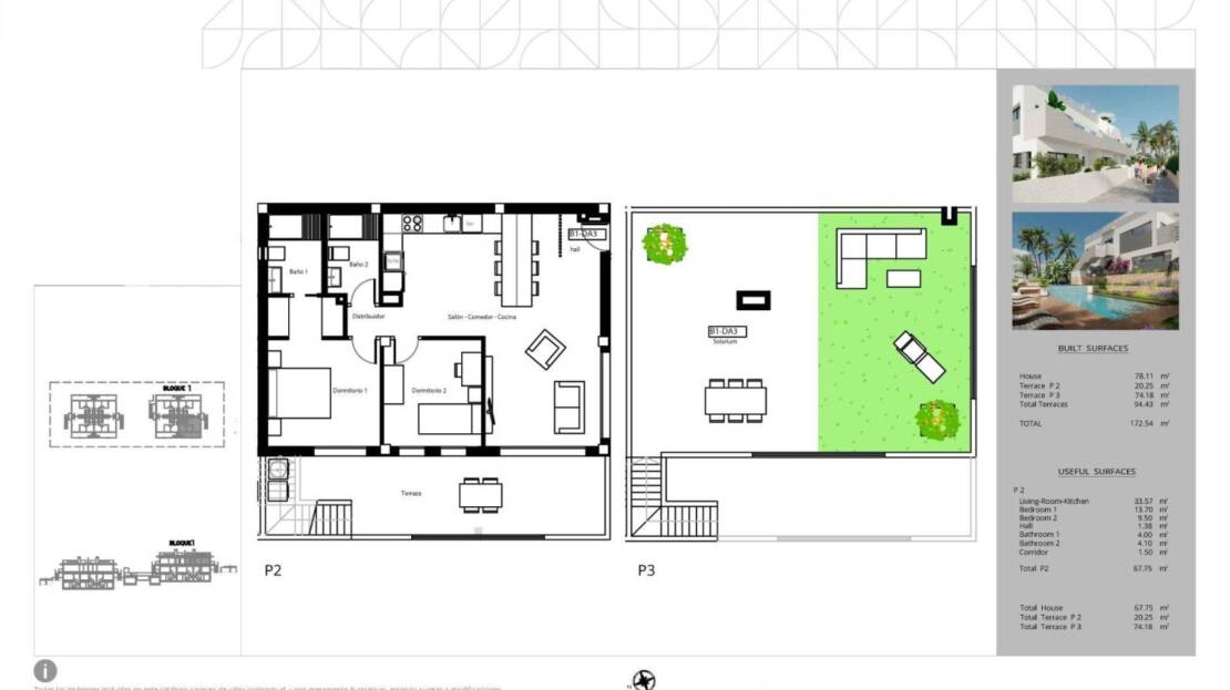 Bungalows en planta baja: 3 dormitorios y 3 baños, incluyendo un dormitorio principal con baño en suite en la planta principal, salón-comedor diáfano con cocina, aseo de invitados y amplia terraza. Una escalera conduce a la planta baja, con 2 dormitorios adicionales, 2 baños, lavadero y patio.