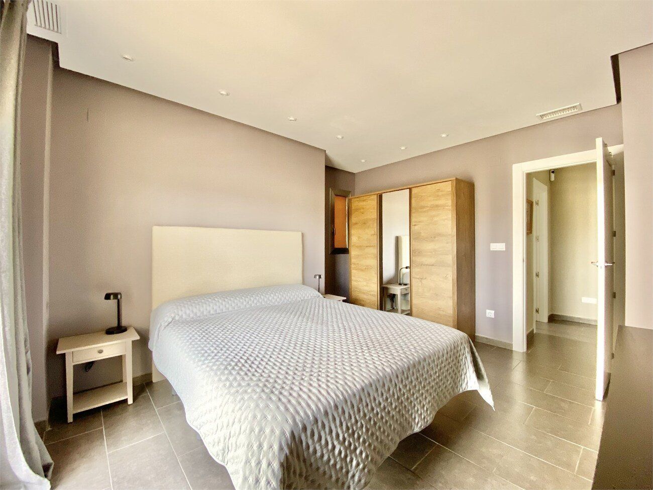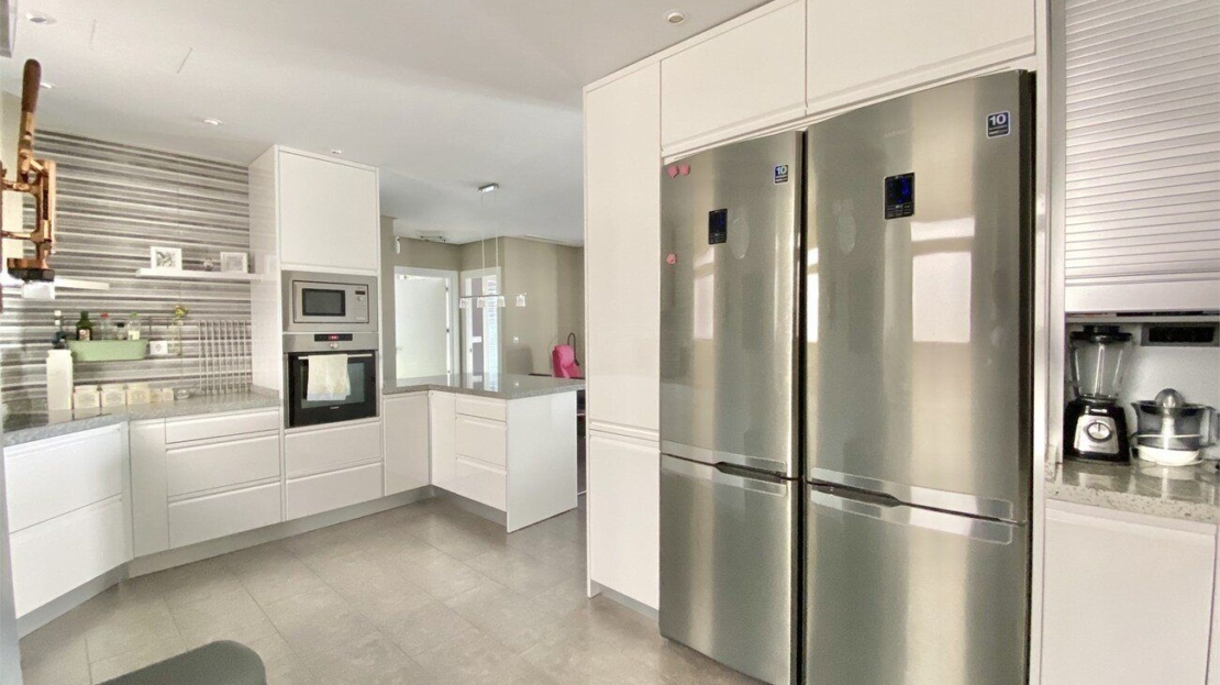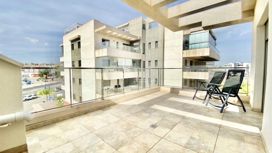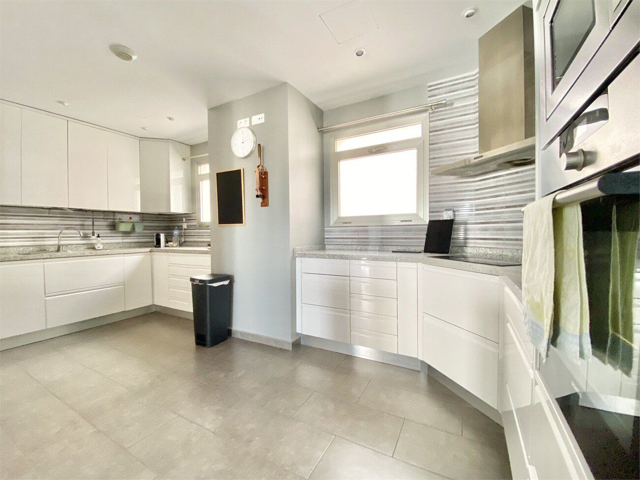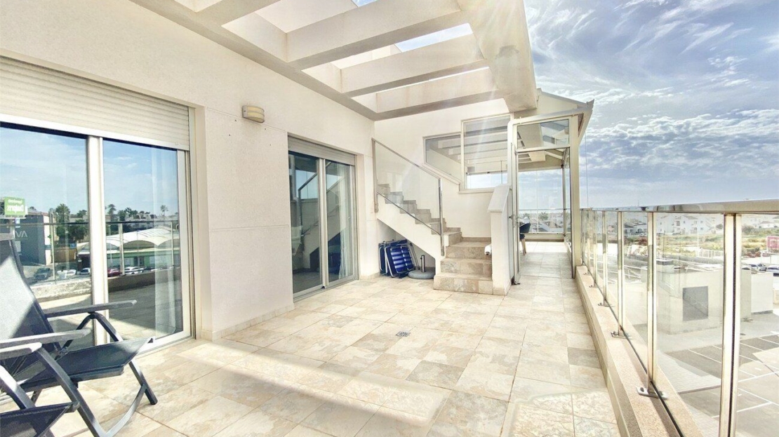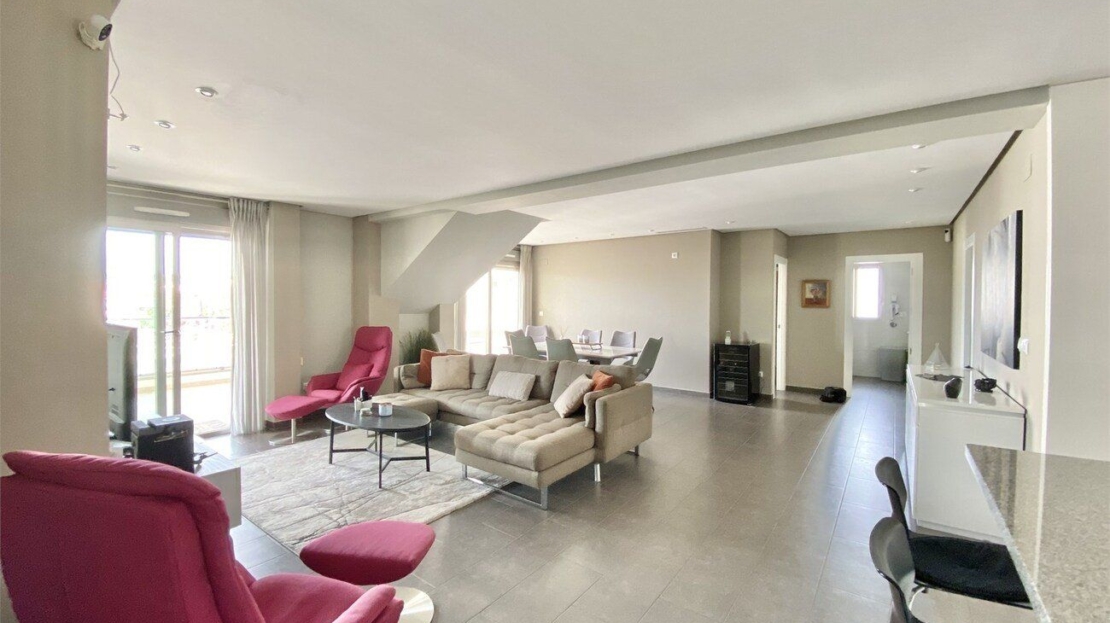 Penthouse with 4 bedrooms and 3 bathrooms.This beautiful apartment has lots of space both inside and out.A large living room has plenty of space for both a lounge and a dining area. Large kitchen with good cupboard space and table space.Furniture and white goods are included. There are several new beds in the apartment.Large south-facing balcony with access from both the living room and bedroom.Large roof terrace with outdoor shower and storage. The roof terrace has a beautiful view of the town and the sea. Where you can enjoy the sun most of the day.The complex has both an outdoor and an indoor pool, and a fitness facility.