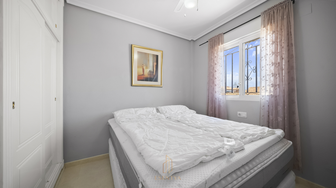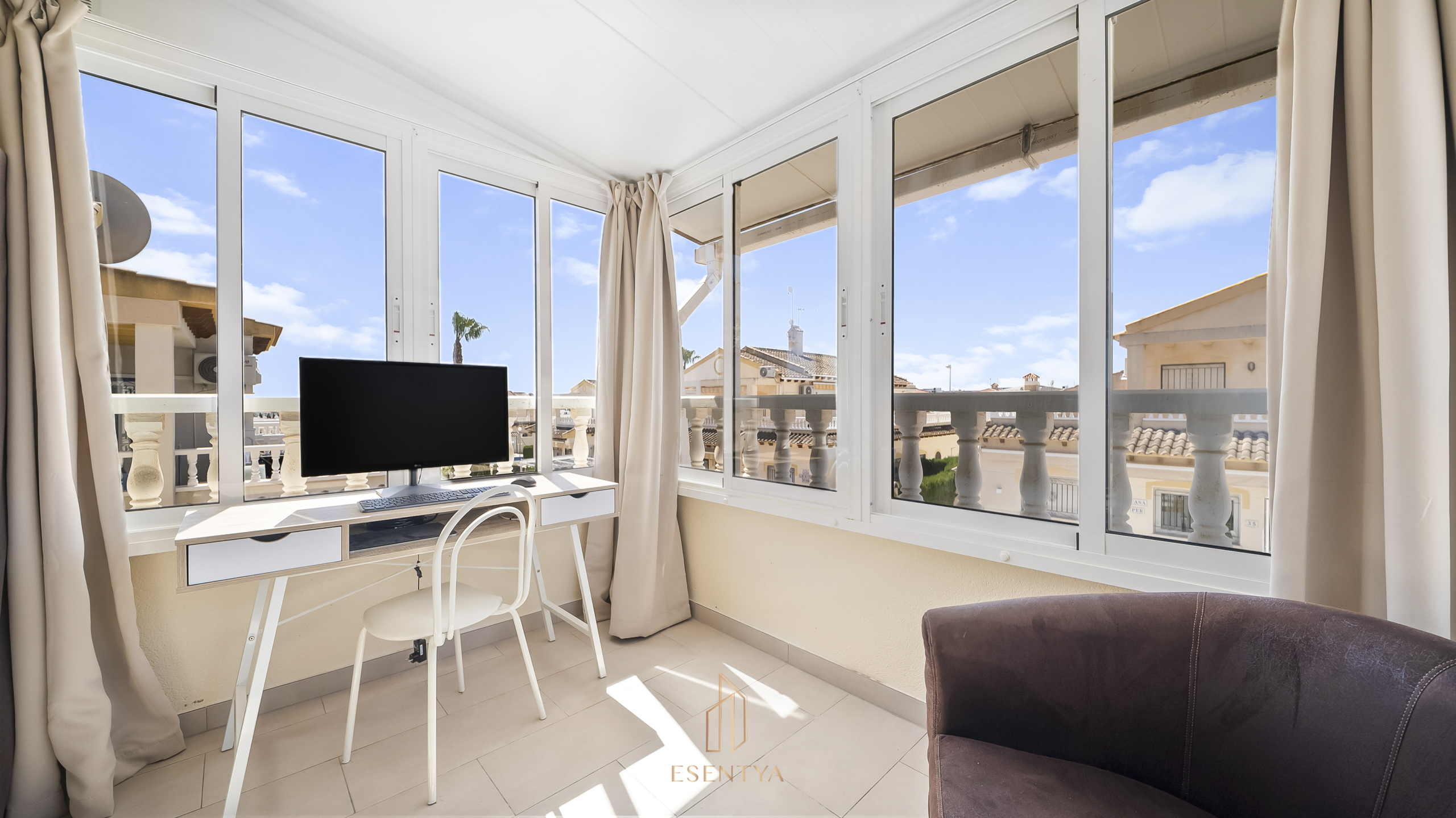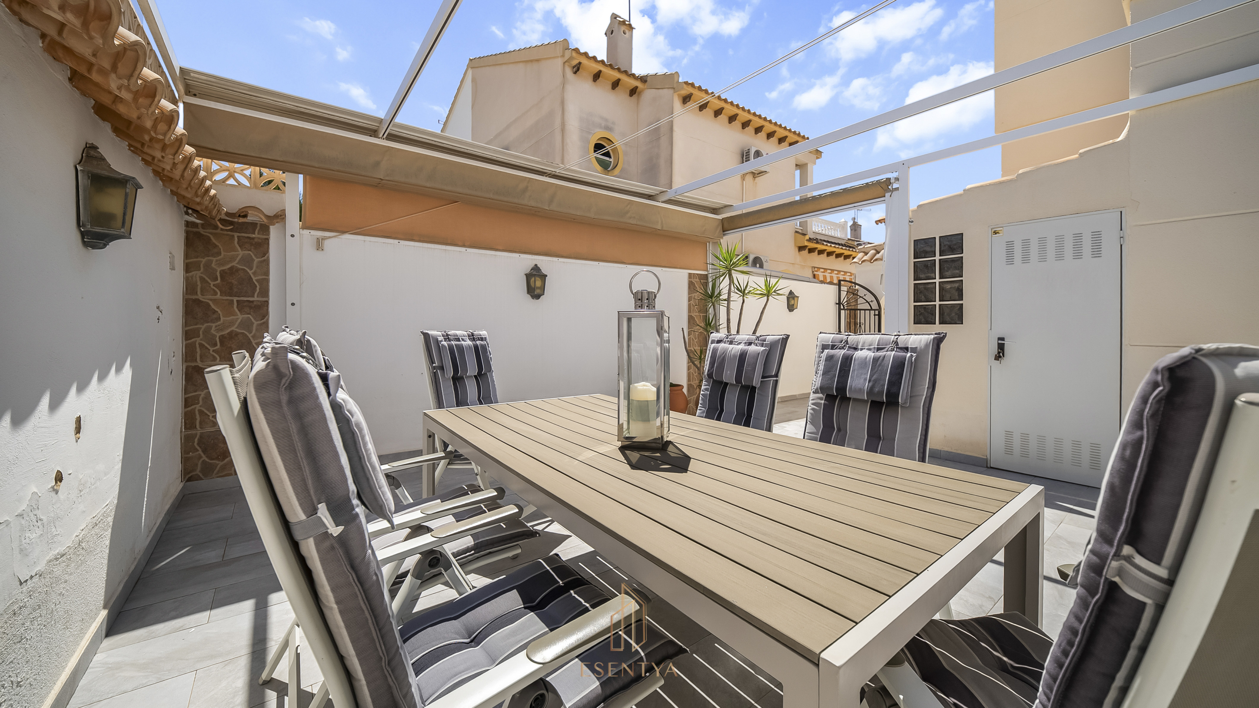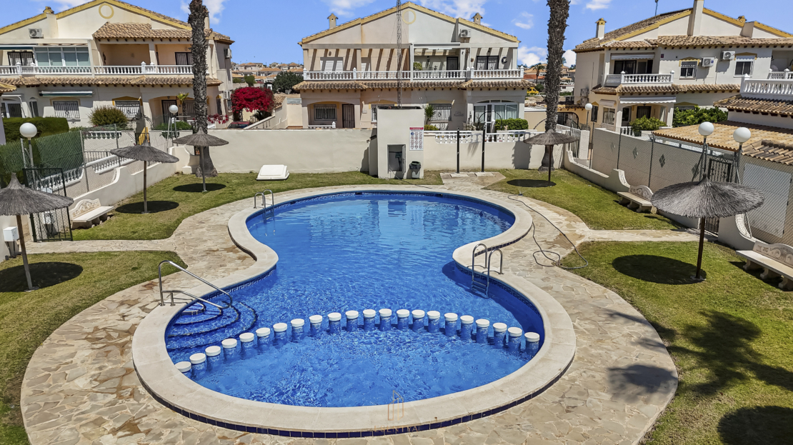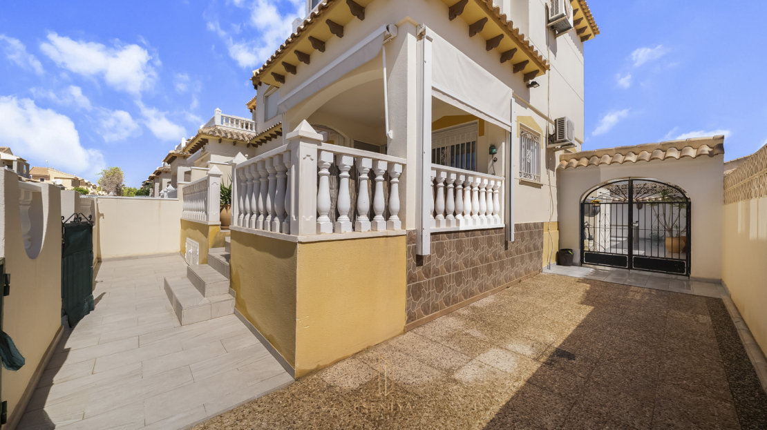 Amplia vivienda adosada pareada con orientación sur, situada en una zona residencial muy demandada, a poca distancia a pie de La Zenia Boulevard, restaurantes, mercado y prácticamente todos los servicios necesarios. La propiedad se encuentra en una comunidad cerrada y dispone de piscina comunitaria.