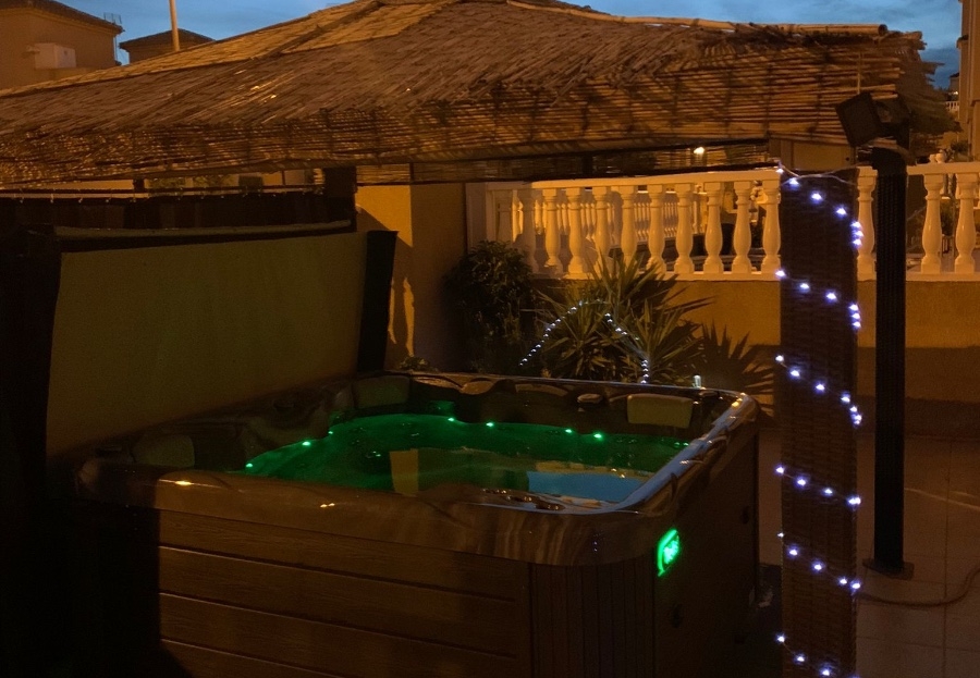 The house is built on two levels. On the ground floor, there is a kitchen that opens onto the living room, a bedroom and a bathroom. Upstairs, there is a bathroom and two bedrooms, one of which has a balcony. There is also a terrace leading to the solarium, where there is a storage room. The outdoor area is pleasant with several terraces, one of which is covered, a jacuzzi, a parking space and a storage room. The house has air conditioning in the living room and in all bedrooms. Each bedroom has a built-in wardrobe. It is sold fully furnished and has a tourist licence.