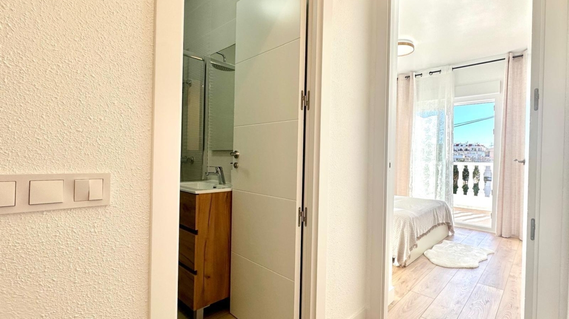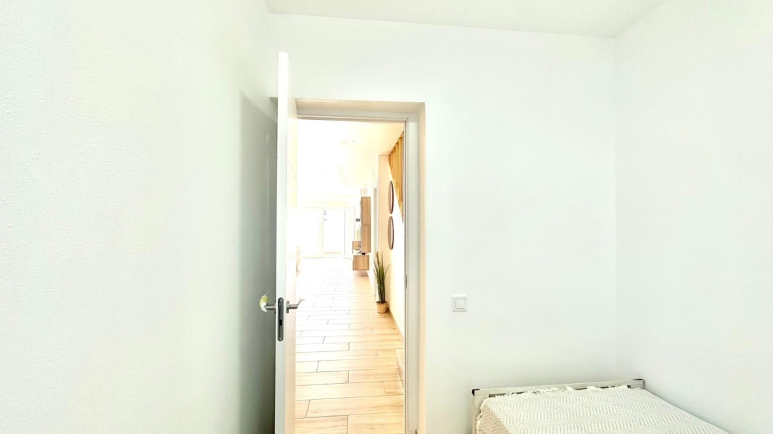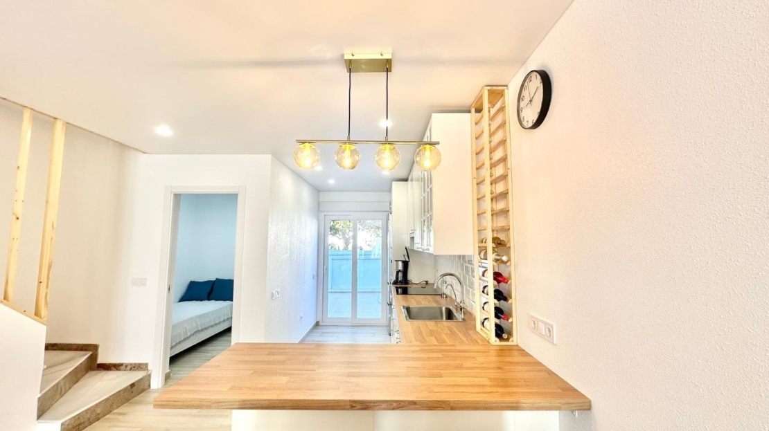 Ubicada en la Avenida París, en una zona residencial tranquila y bien comunicada, esta acogedora casa adosada se encuentra a tan solo un kilómetro y medio de la playa, combinando la cercanía al mar con la comodidad de vivir en un entorno más residencial. Es una opción ideal tanto para quienes buscan una vivienda habitual como para quienes desean una segunda residencia cerca de la costa. En la planta baja, la vivienda cuenta con un amplio y luminoso salón comedor, diseñado para ofrecer un espacio cómodo y funcional destinado al descanso y a la vida en familia. La cocina de estilo francés-americano, abierta y moderna, se integra perfectamente con la zona de día, creando una sensación de amplitud y favoreciendo la convivencia. Desde esta planta se accede a un patio trasero, un espacio exterior muy práctico para zona de lavandería, almacenamiento o para disfrutar de comidas al aire libre. Además, dispone de un dormitorio en la planta inferior y un aseo, lo que aporta comodidad adicional y resulta especialmente útil para invitados o personas con movilidad reducida. La vivienda también cuenta con un patio delantero, ideal como terraza privada, zona de descanso o pequeño jardín de bienvenida, aportando un valor añadido al espacio exterior de la propiedad. En la segunda planta se encuentran dos dormitorios dobles, amplios, luminosos y confortables, ambos con acceso directo a sus propias terrazas privadas, perfectas para disfrutar del sol, la ventilación natural y momentos de tranquilidad en el exterior. En esta misma planta se sitúa un cuarto de baño completo con plato de ducha, moderno y funcional, que da servicio a ambos dormitorios. La propiedad cuenta con una excelente orientación sur y norte, lo que garantiza luz natural a lo largo de todo el día y permite una ventilación cruzada que contribuye a mantener un ambiente fresco y agradable durante todo el año. Además, la vivienda forma parte de una urbanización con piscina comunitaria, perfecta para relajarse y disfrutar del buen clima mediterráneo sin necesidad de desplazarse. En conjunto, esta casa adosada en Avenida París ofrece una combinación ideal de espacio, comodidad, funcionalidad y zonas exteriores, en un entorno tranquilo y bien ubicado, convirtiéndose en una excelente opción para disfrutar de la vida mediterránea con todas las comodidades.