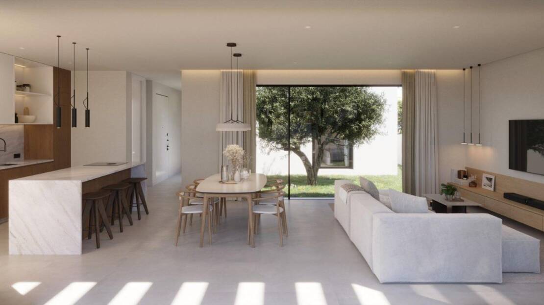 Elegante cocina moderna y salón diáfano lleno de luz natural