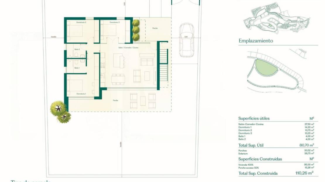 Cada propiedad ofrece una distribución espaciosa con 3 dormitorios y 2 baños en una sola planta. Solárium privado en azotea. Con parcelas a partir de 396 metros cuadrados y una superficie construida de 111 metros cuadrados, estas viviendas ofrecen un amplio espacio para la vida interior y exterior.