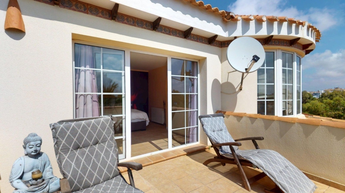 This spacious and move-in ready villa in Orihuela Costa offers everything needed for comfortable living on the Costa Blanca. The property features five full-sized bedrooms and three complete bathrooms, including a luxurious bathroom with jacuzzi. Spread over multiple levels, the villa offers bright, open living spaces, a fully equipped kitchen, and several lounge areas.