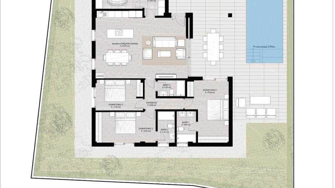 Cada villa está construida en una parcela de 500 m2 con un diseño funcional de una sola planta. La distribución incluye: