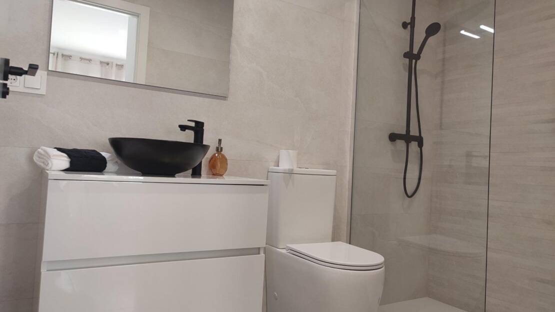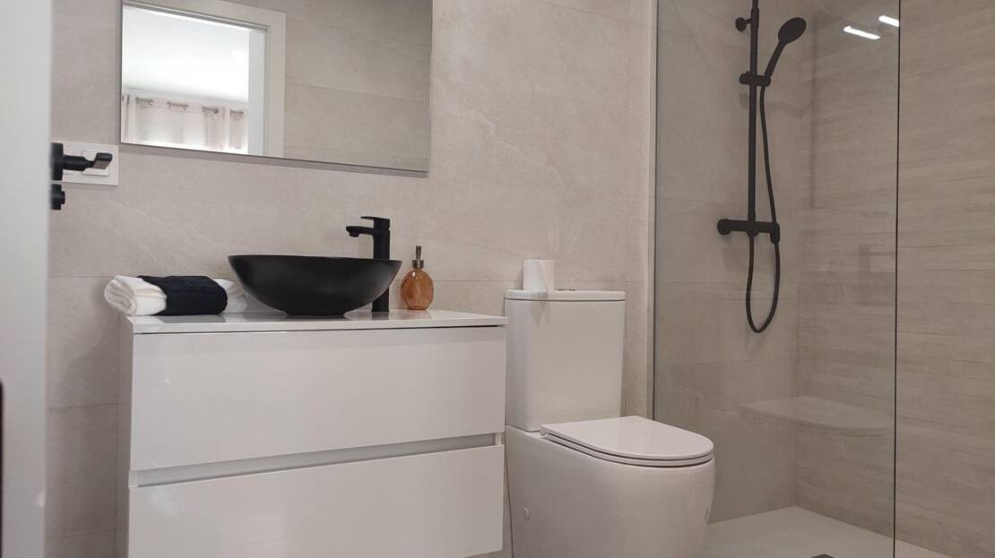 Cuartos de baño totalmente equipados con inodoro, mueble de baño, espejo y ducha con mamparas.