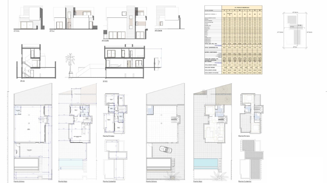 Cada villa cuenta con tres dormitorios y cuatro baños, tres de ellos en suite, además de un aseo adicional para invitados. Las viviendas se distribuyen en tres niveles, diseñados para maximizar el confort y la versatilidad.