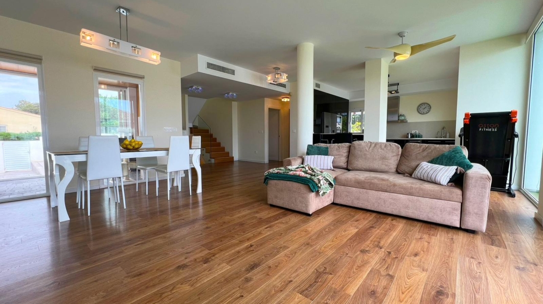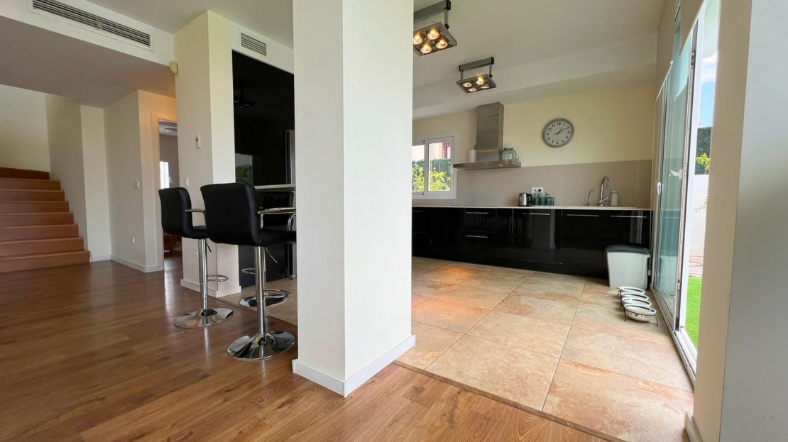 En la planta principal, encontramos un elegante recibidor, amplio salón-comedor con acceso directo a la zona de la piscina privada de 32 m², una cocina con barra americana, 1 dormitorio y 1 baño.