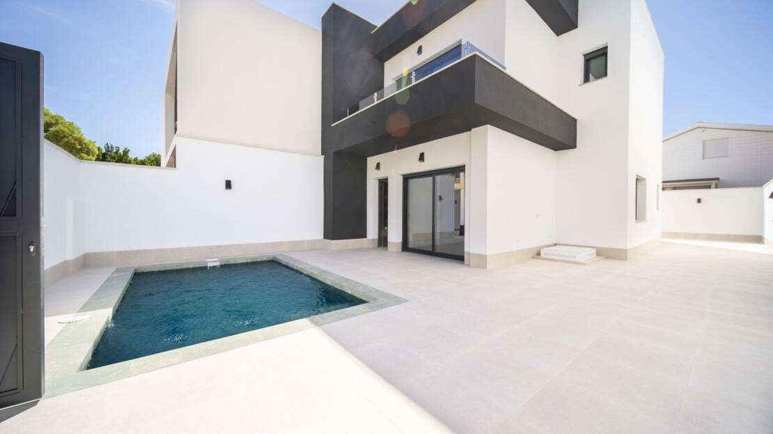 Moderna villa de nueva construcción con 194 m² sobre una parcela de 210 m². Distribuida en dos plantas, ofrece 3 amplios dormitorios, cada uno con vestidor, y 3 baños. La vivienda cuenta con una moderna cocina totalmente equipada, salón luminoso con salida a la terraza y zona de piscina privada.